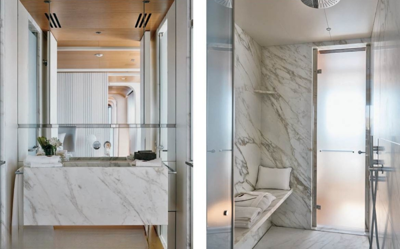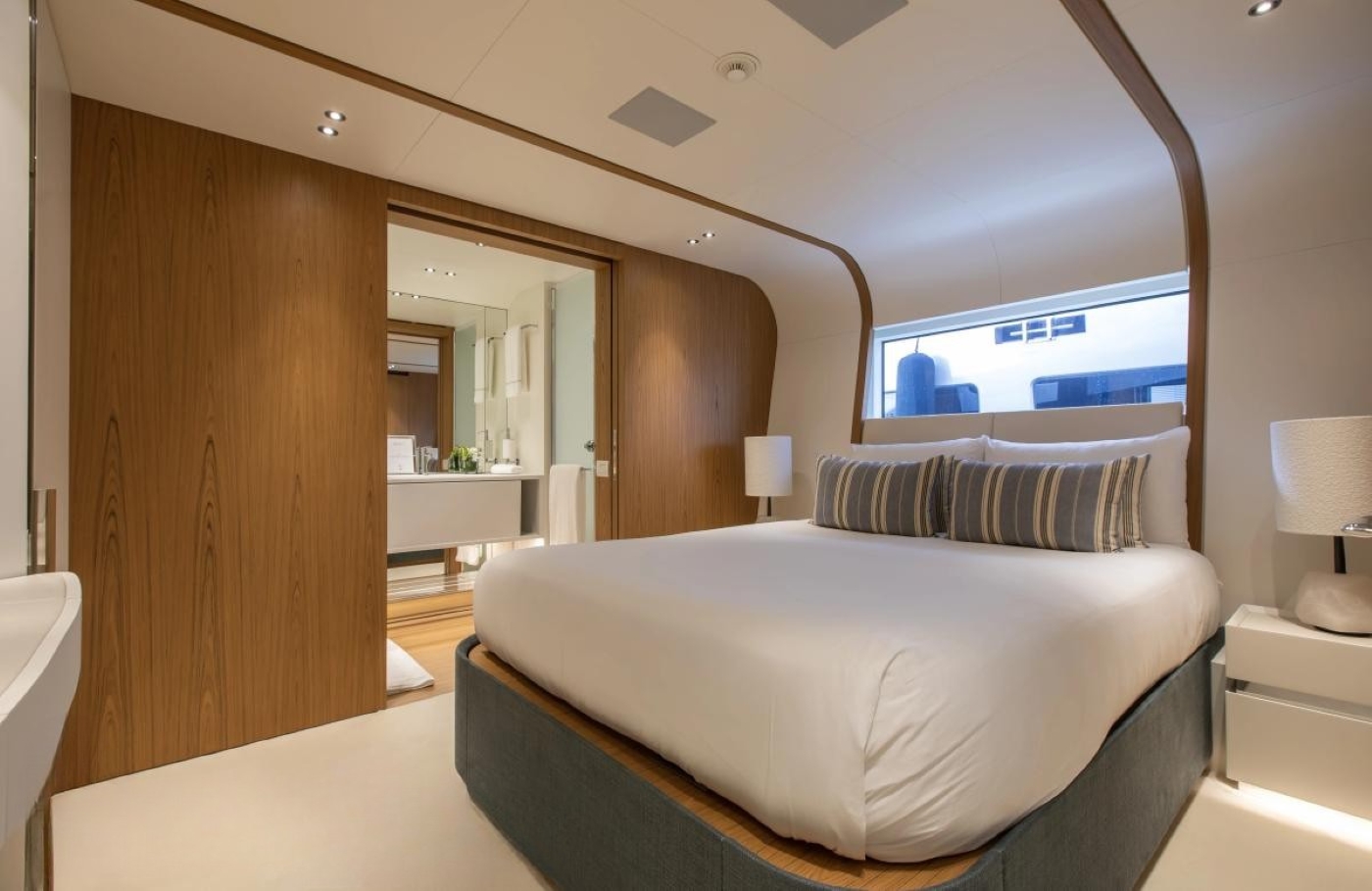 The guest suites are across the main and lower deck with the master suite taking pride of place in the forward position on the main deck. The suite is full beam with a king-sized bed, lounge area, vanity and stunning his-and-hers ensuite with central shower cubicle. The four additional guest suites are on the lower deck and configured as three doubles and one flexible twin/double. All the suites benefit from the luxury and privacy of ensuite bathroom facilities.