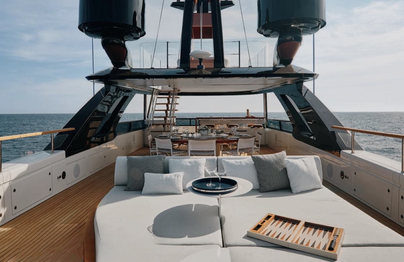 The spacious Hamptons-style beach club invites guests to relax in the sun at sea-level and features a retractable fabric canopy providing ample shade when needed; as well as a platform for easy access when enjoying the yacht's broad selection of water toys.