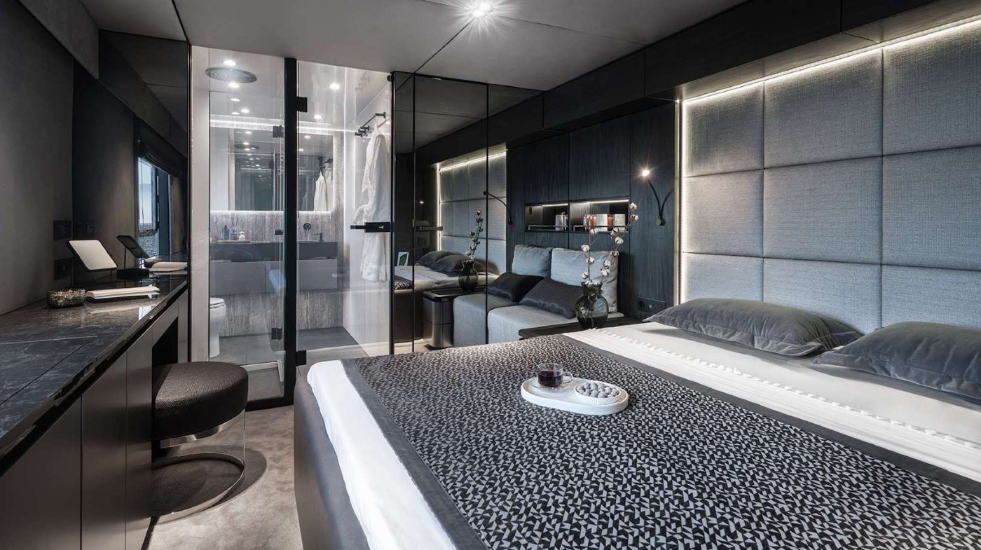The accommodation sleeps a total of 8 guests over 4 en-suite cabins: 1 Master suite and 3 VIP staterooms. ~ The Master suite is amidships in the starboard hull and has a queen-sized bed, a desk, large wardrobe and an en-suite bathroom with a sink, toilet and separate shower. ~ The VIP staterooms are forward of the Master suite in the starboard hull, and amidships and forward in the port hull. All have a queen-sized bed, large storage and an en-suite bathroom with a sink, toilet and shower. ~ The professional crew of 4 will provide fast and discreet service throughout every cruise.