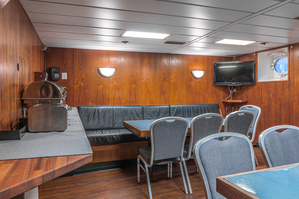 The interior has everything guests need for a comfortable and warm cruise with spaces for dining and lounging as well as navigating their next adventure.