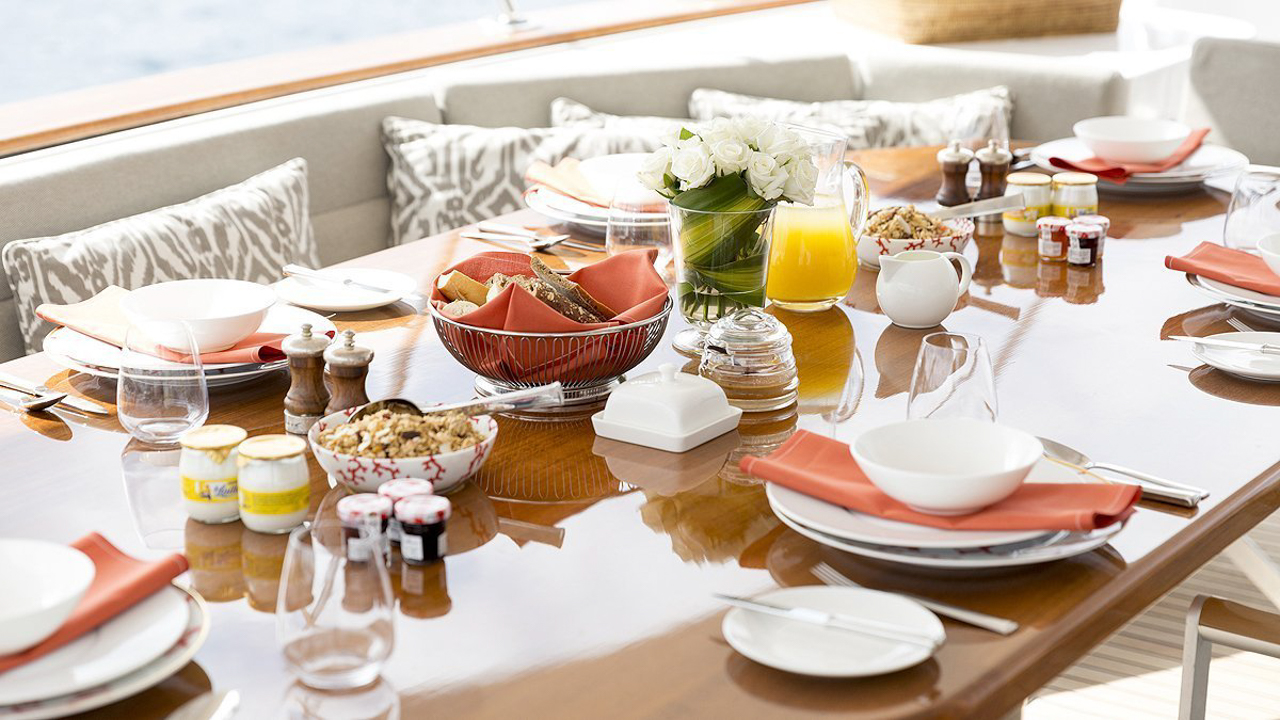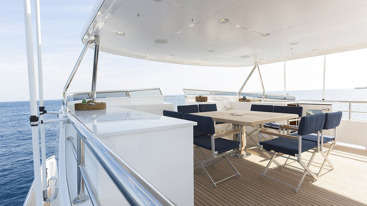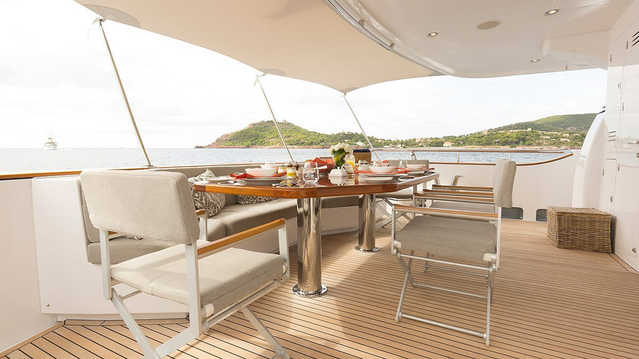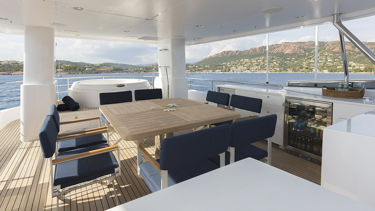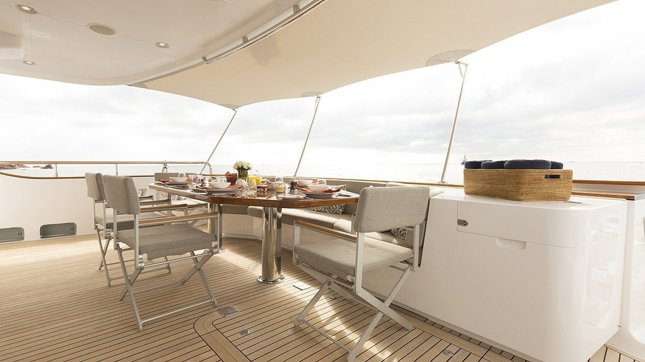 There are plenty of options for outdoor living and dining aboard this luxury motor yacht. On the main deck aft is a spacious are with sofas lining the stern, complete with a table and additional seating. The area can be shaded with an optional bimini, making for a great spot to enjoy al fresco meals in any weather.