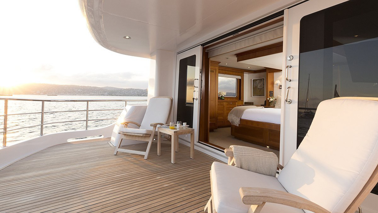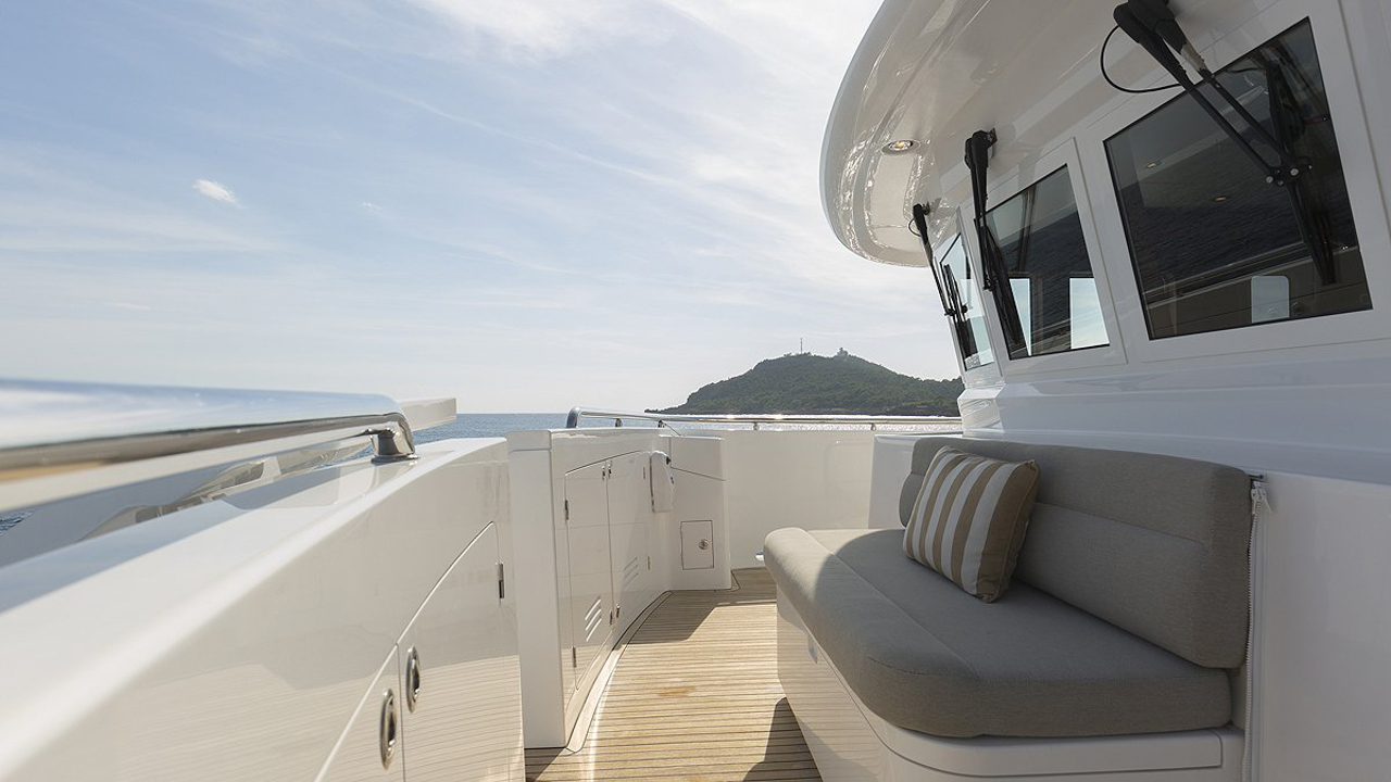 Above on the upper deck is the Master suite’s private deck aft, as well as side walkways and stairwell leading to the foredeck, which provides yet another area for relaxing in the sun.