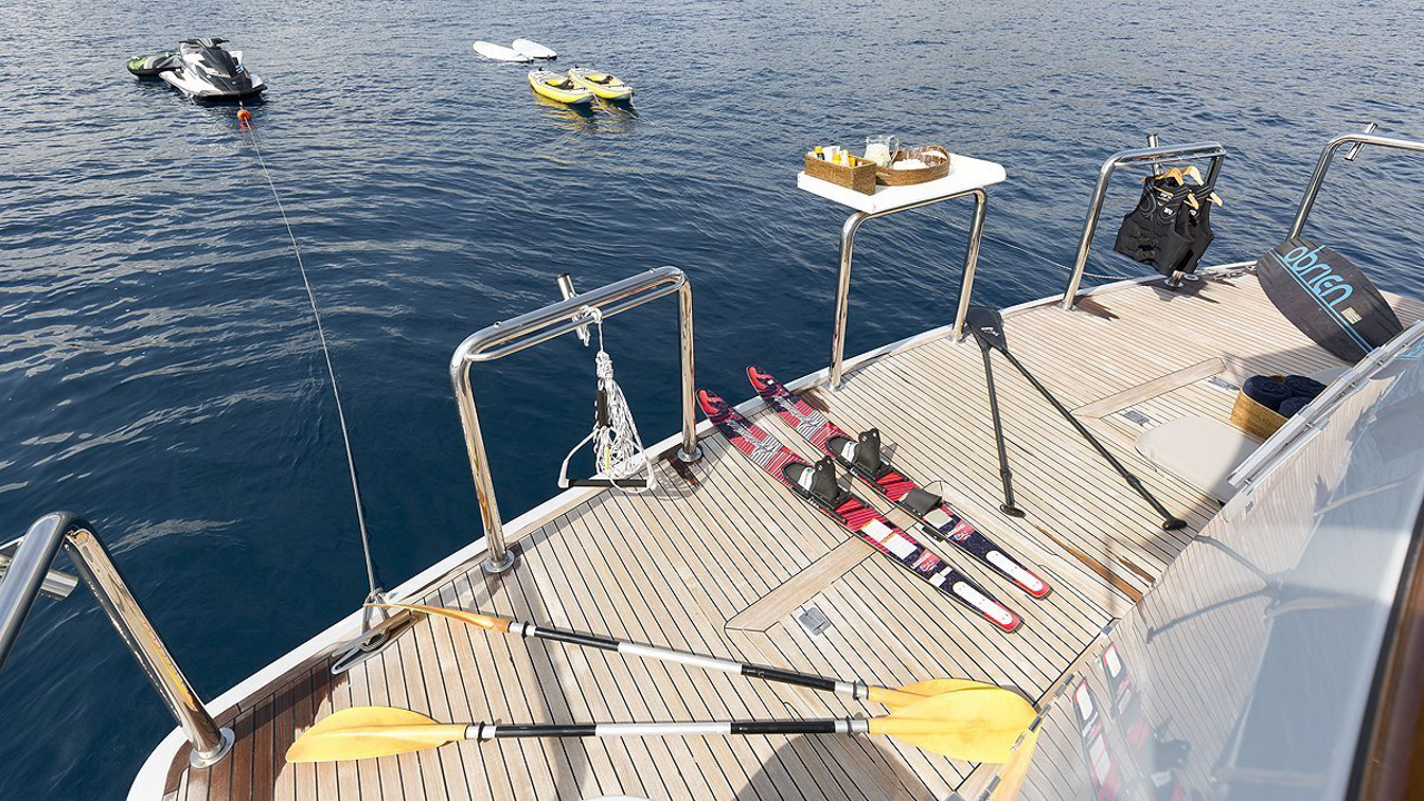 Below is the extended swimming platform, accessed from the main deck by a to port stairwell. This large swimming platform comes complete with an ice maker, making it ideal for fishing.