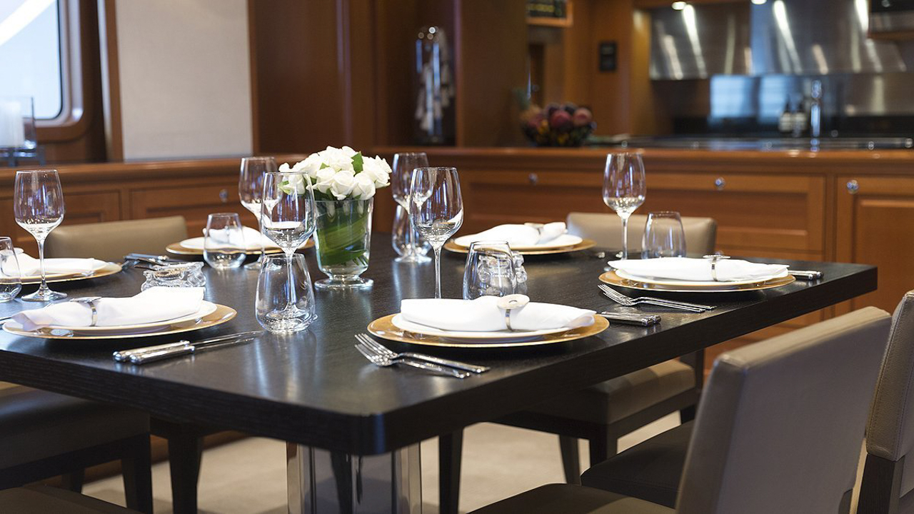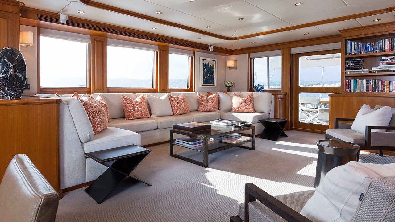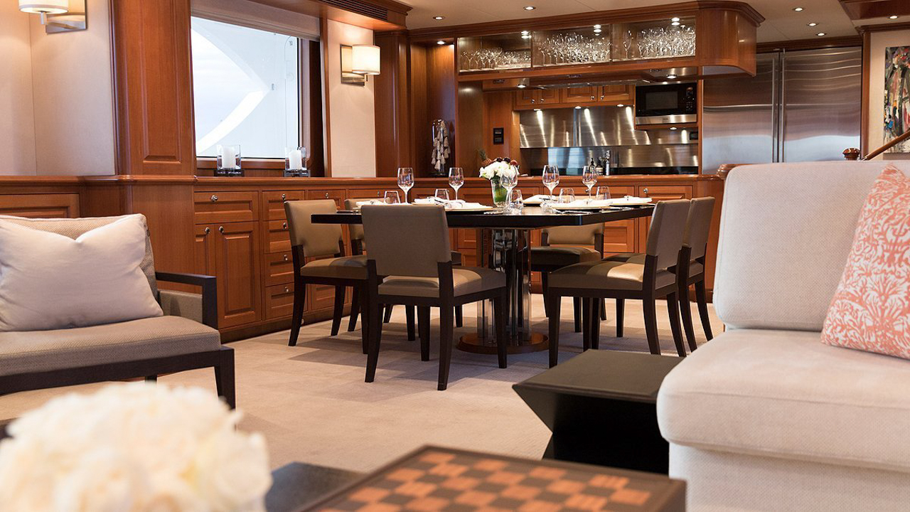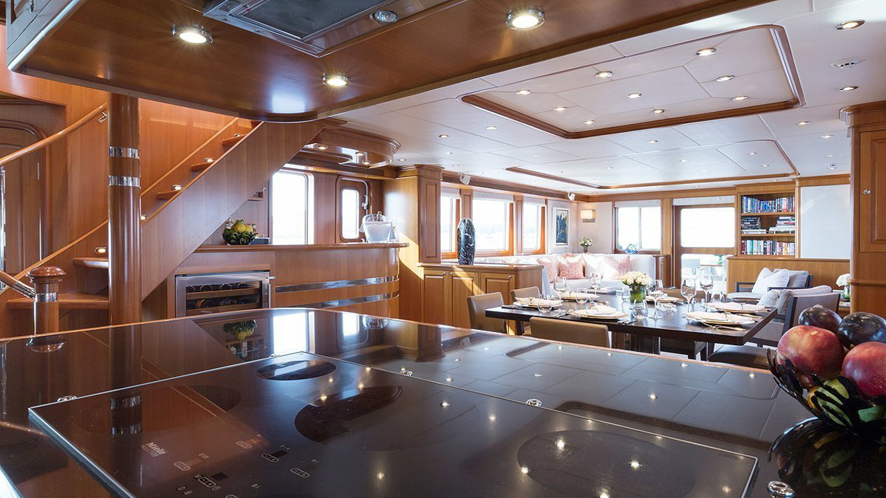 The main deck holds the main salon, where the beautifully decorated indoors living and dining areas are situated. This spacious salon features large windows which provide ample natural light and sunshine. The living area is positioned aft on the deck, and features a large sofa on the starboard side, which can easily accommodate six guests. Opposite is another seating area with additional chairs. The teak finishing gives the space an elegant atmosphere, and with teak cupboards providing plenty of storage.