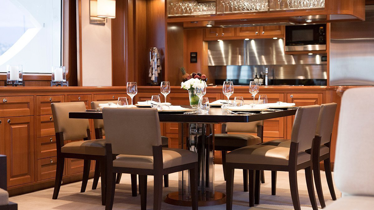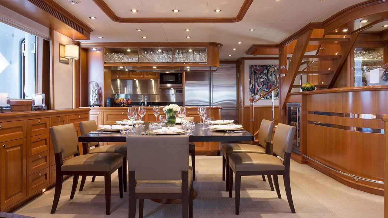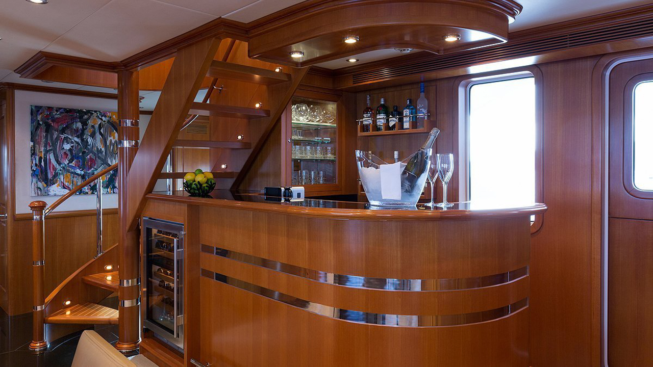 Forward is the formal dining area, with a large fixed mahogany table and seating for 8 guests. The salon is fully carpeted, and all windows are fitted with custom blinds. To the starboard side is a beautiful teak bar area, providing guests with delicious, convenient refreshments.