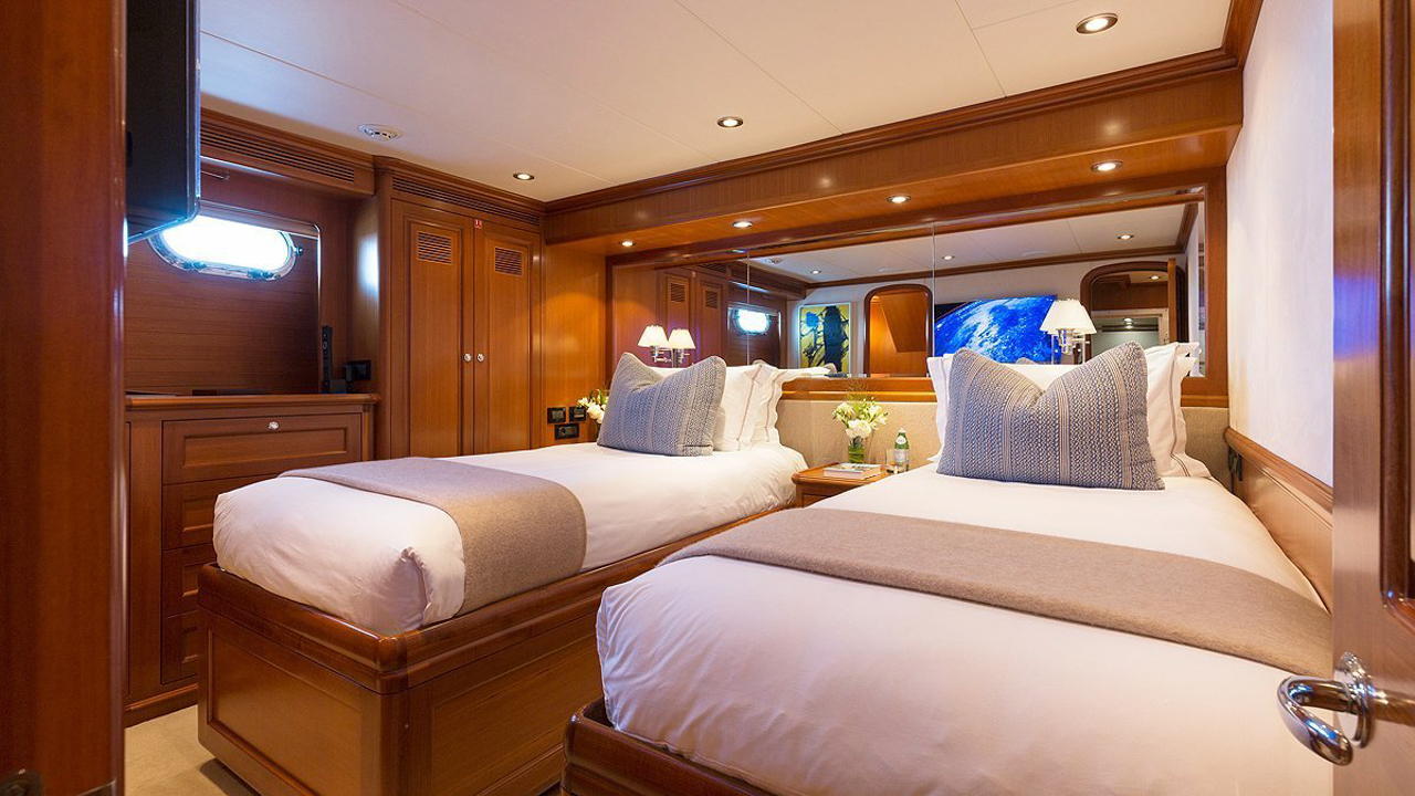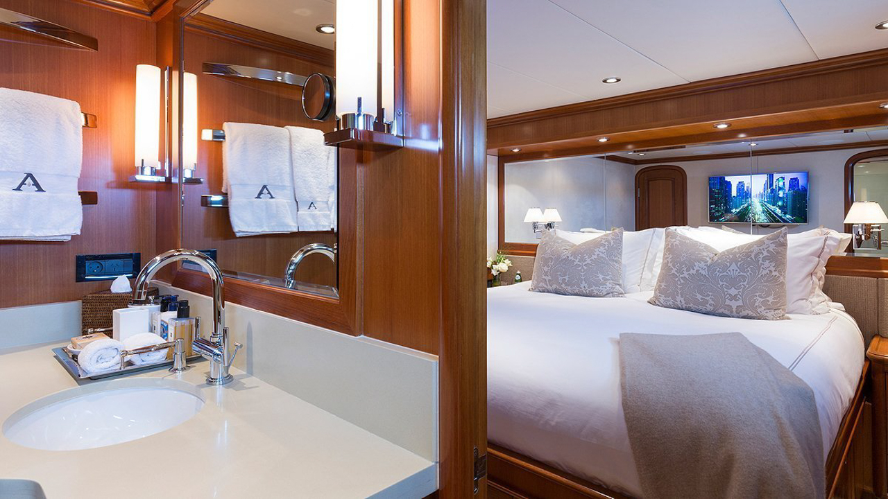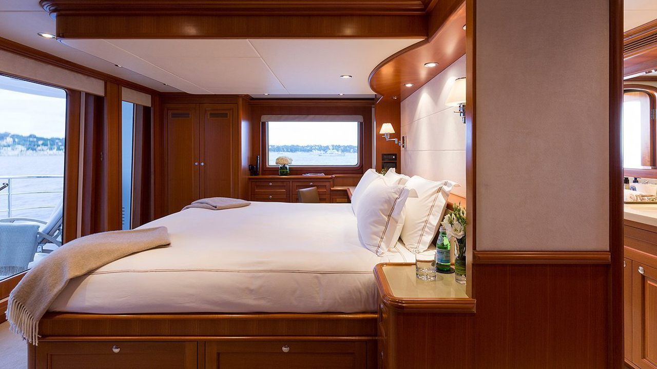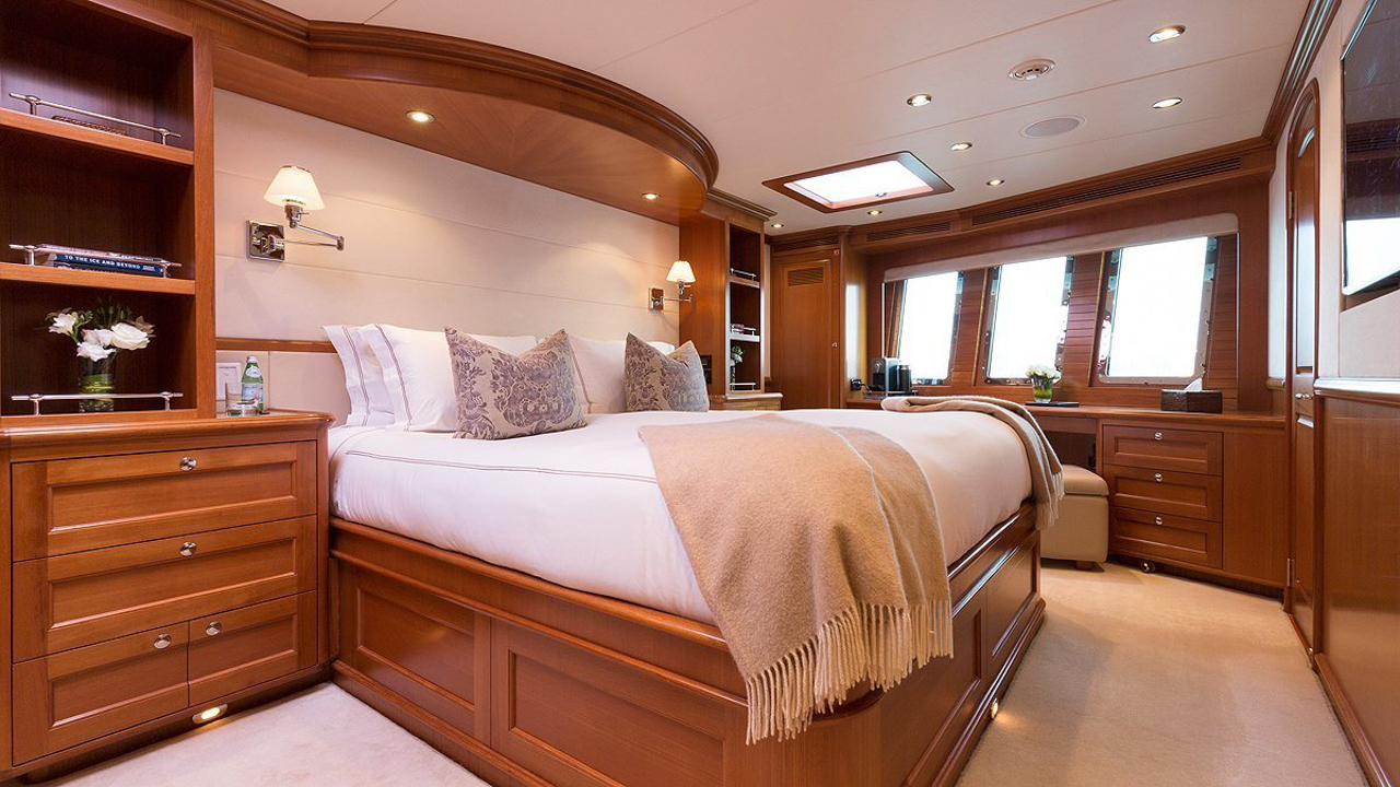 The accommodation sleeps up to 8 guests over 4 en-suite cabins, consisting of: 1x Master suite, 1x VIP cabin, and 2x double cabins that can be converted to twins. The fantastic Master cabin is situated on the upper deck, and enjoys incredible views from its own private aft deck. The king sized bed directly faces the aft windows, meaning views can also be enjoyed from bed – the perfect way to watch the sunrise. At night, enjoy a movie on the hidden TV on the powered drop down above the bed. The Master suite also features an ensuite with shower and double sinks. The VIP cabin is situated on the main deck, and features a king-sized bed with walkaround access, plenty of natural light from the generous windows, as well as ample storage. The ensuite bathroom features sink area with granite tops, toilet and a large shower. The remaining two double cabins are on the lower deck, and both feature double beds, TV and AV, and plenty of light from the portholes. They can also be configured as twin beds instead of double, allowing for a variety or friend and family group formations. The self-contained quarters for 4 crew members are also on the lower deck, along with laundry and engine room.