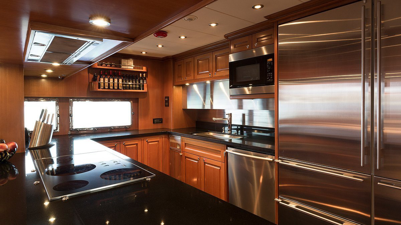 The main salon is open plan and includes a convenient galley forward of the dining area, creating an ideal space for entertaining. The galley features beautiful granite bench tops and Miele appliances.