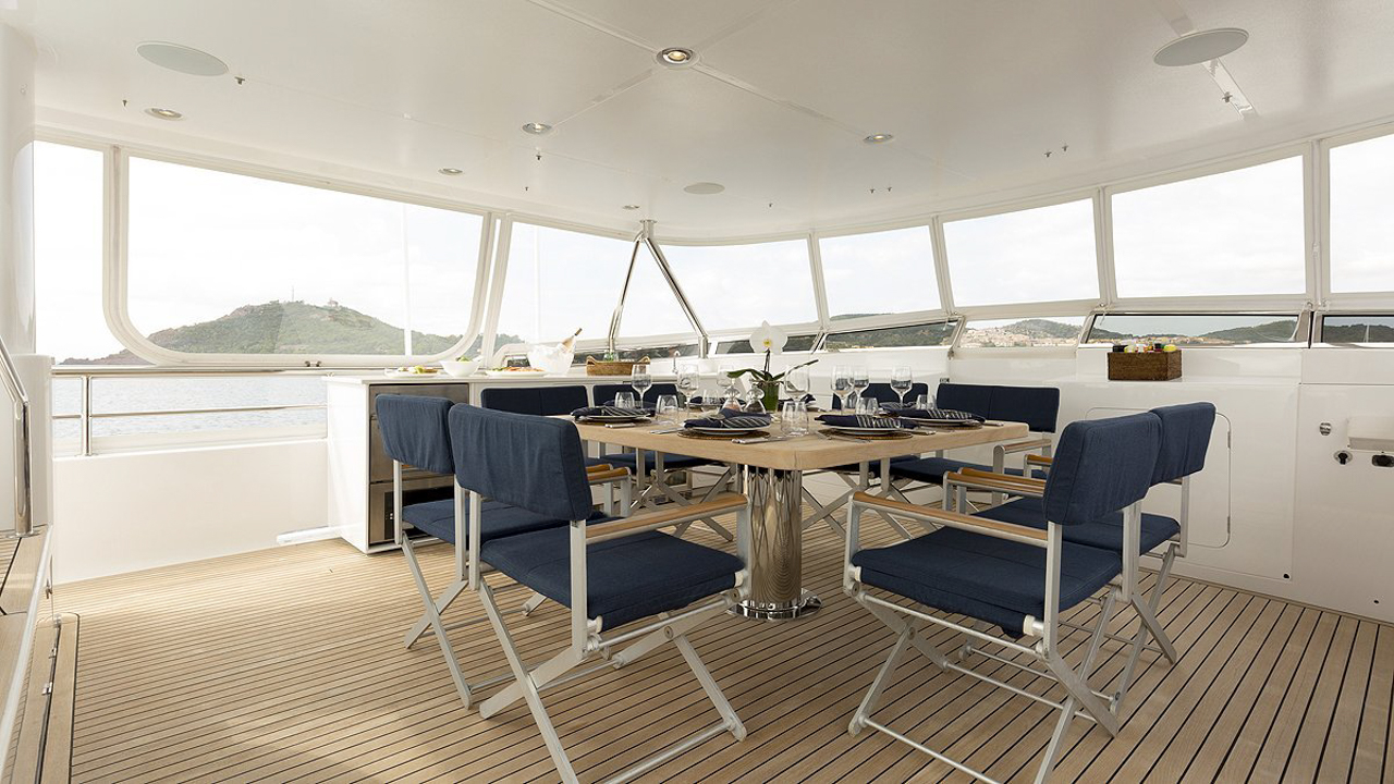 Above on the flybridge is the fabulous outdoors social hub. This space features a large square dining table, able to seat all guests with ease. There is also a bar for providing cold refreshments, as well as a fantastic forward circular jacuzzi.