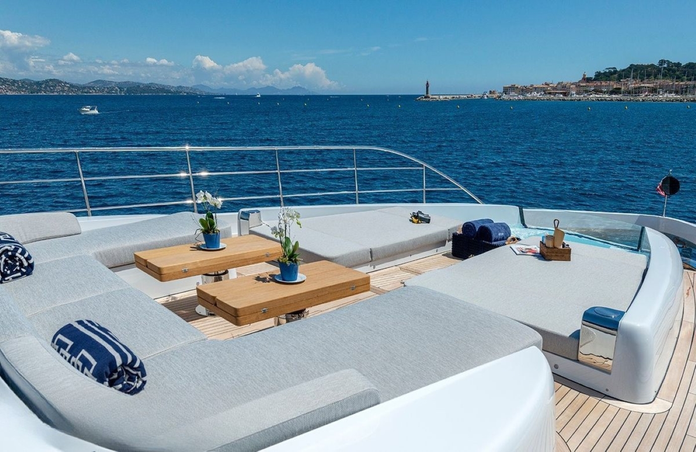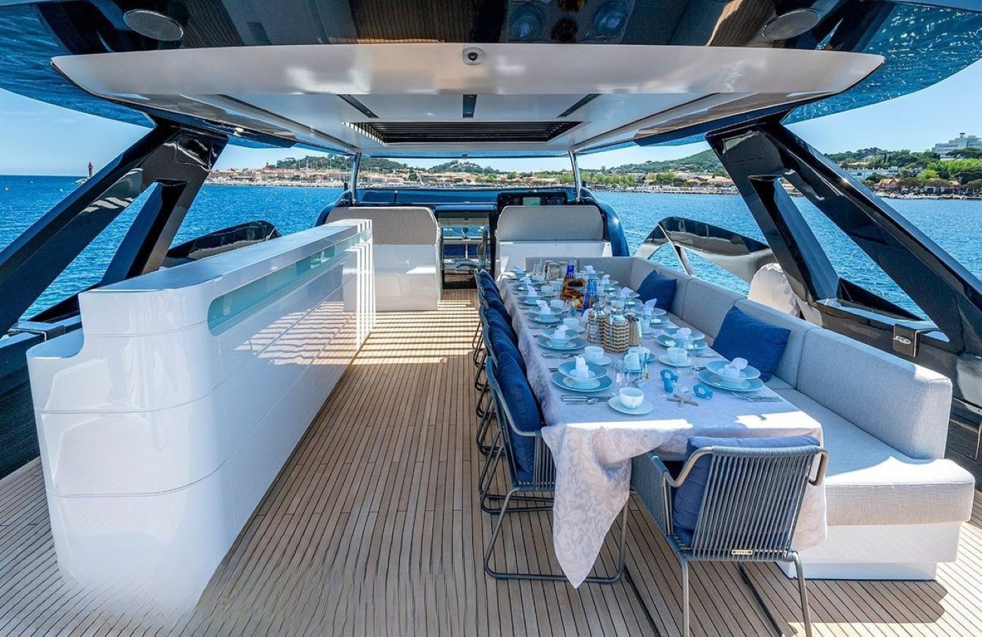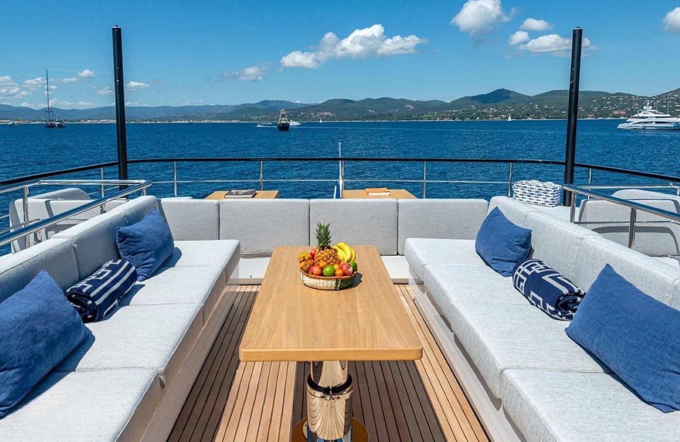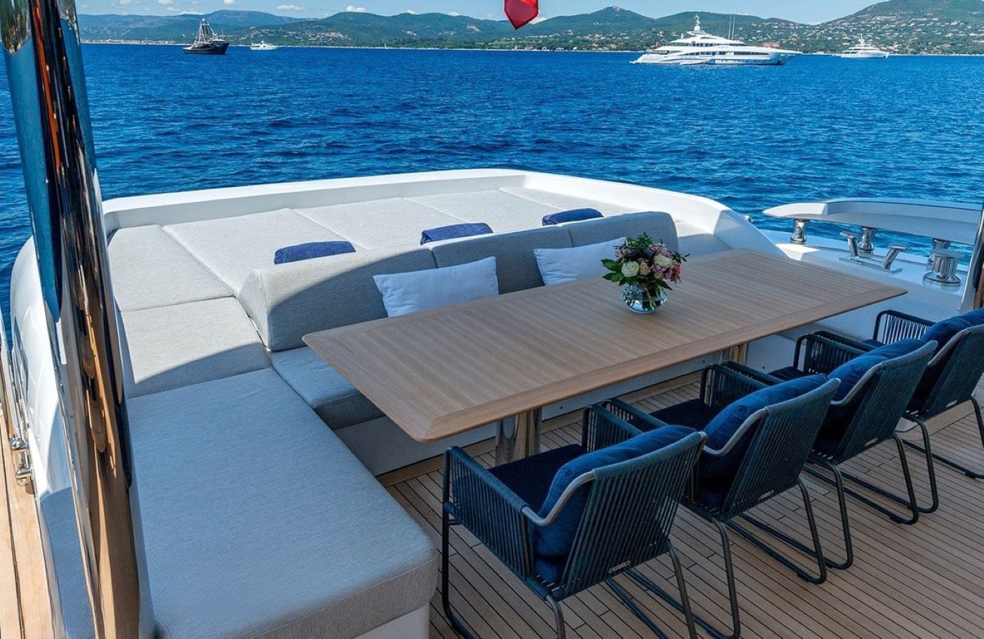 The main deck aft is cleverly designed with a dining table surrounded by a double-sided sofa. The forward-facing side creates seating for the table while the aft facing section is a row of sun pads which appear to be floating over the swim platform. The water’s edge platform can be accessed via steps on either side of the main deck aft.