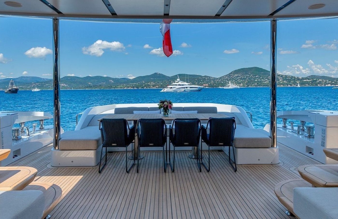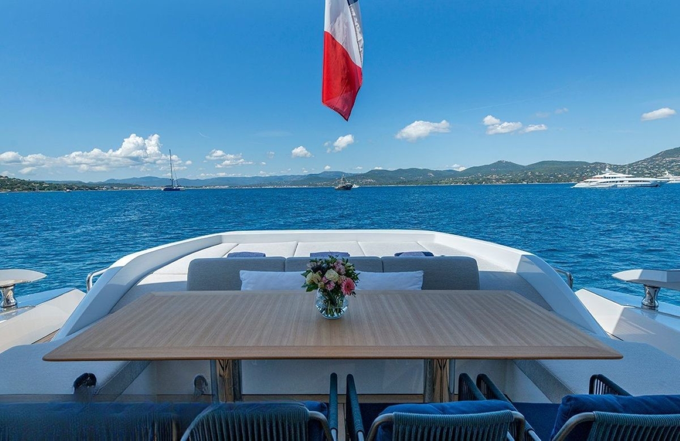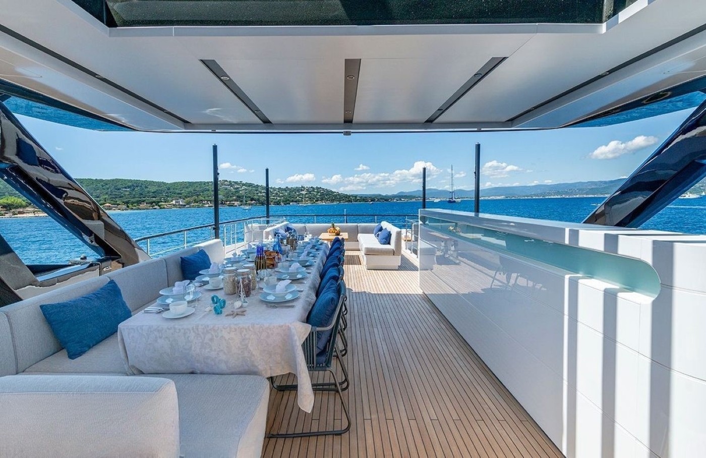 The main deck aft is cleverly designed with a dining table surrounded by a double-sided sofa. The forward-facing side creates seating for the table while the aft facing section is a row of sun pads which appear to be floating over the swim platform. The water’s edge platform can be accessed via steps on either side of the main deck aft.