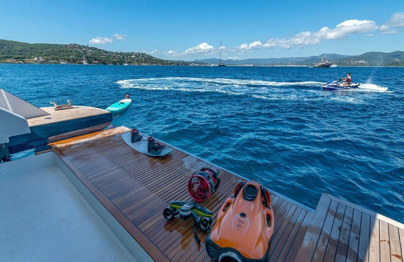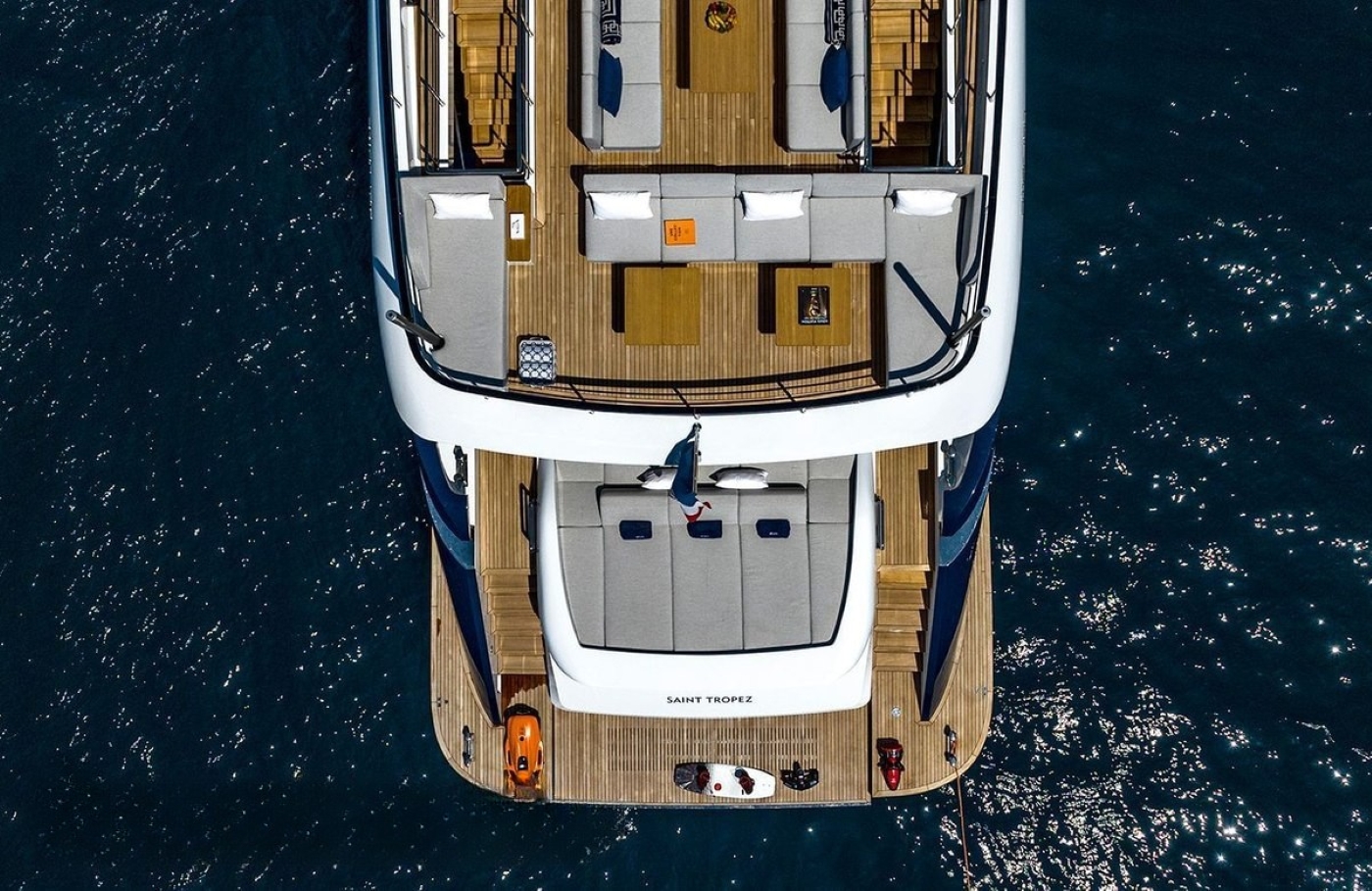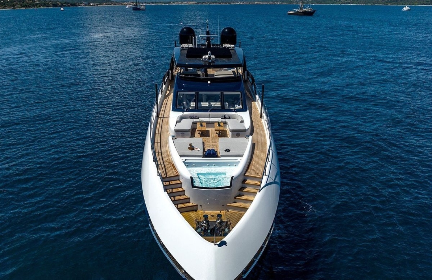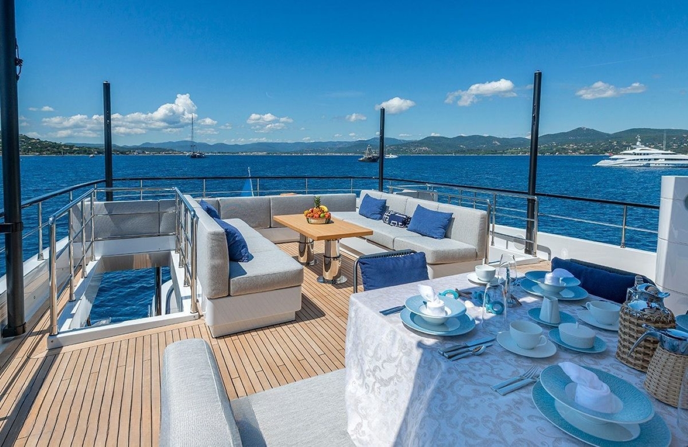 The main deck aft is cleverly designed with a dining table surrounded by a double-sided sofa. The forward-facing side creates seating for the table while the aft facing section is a row of sun pads which appear to be floating over the swim platform. The water’s edge platform can be accessed via steps on either side of the main deck aft.