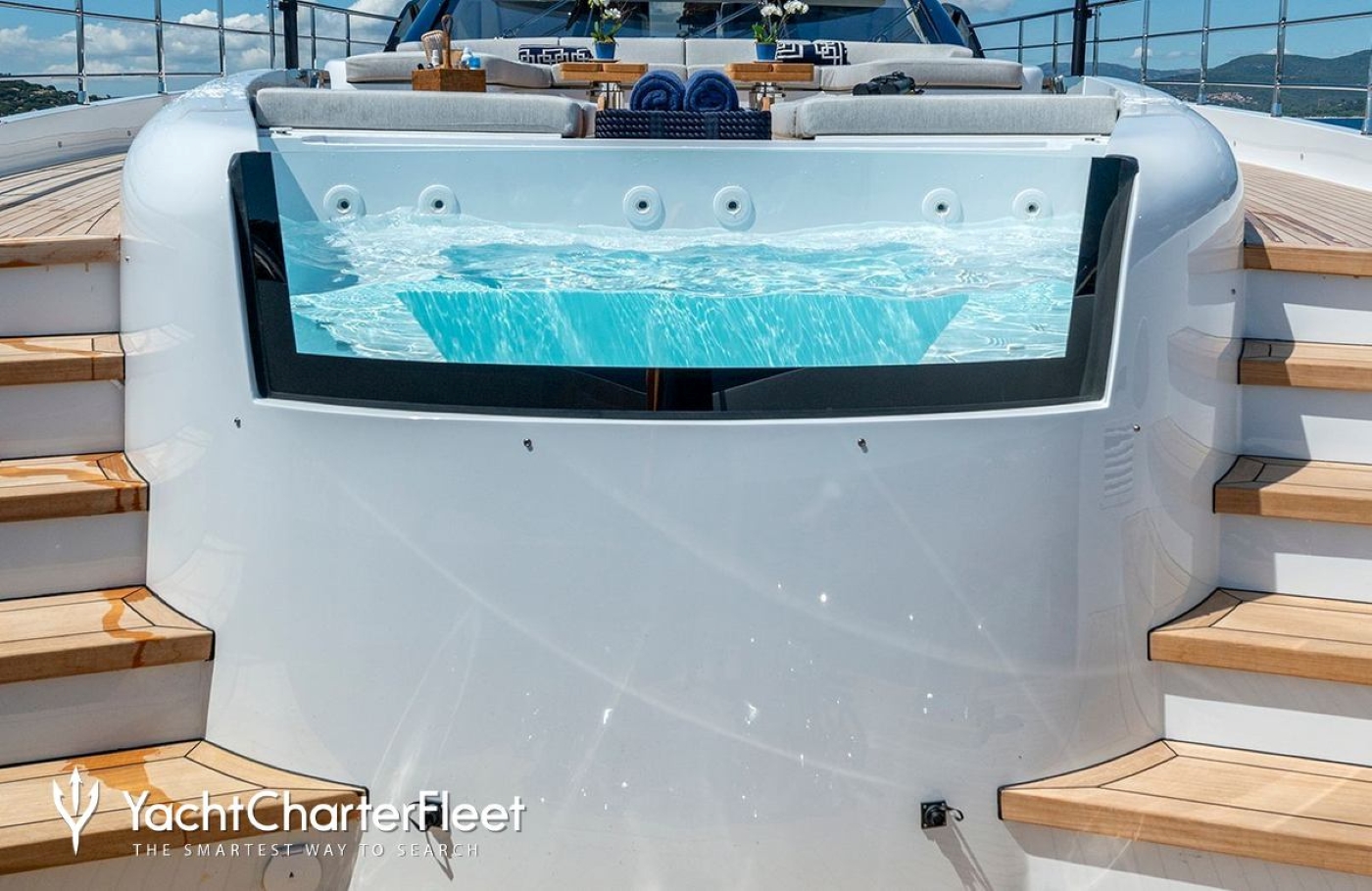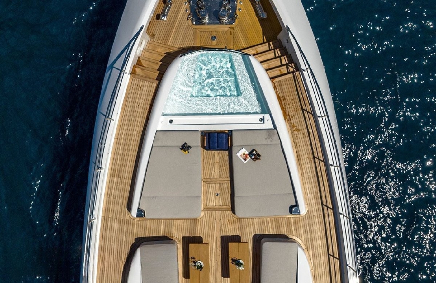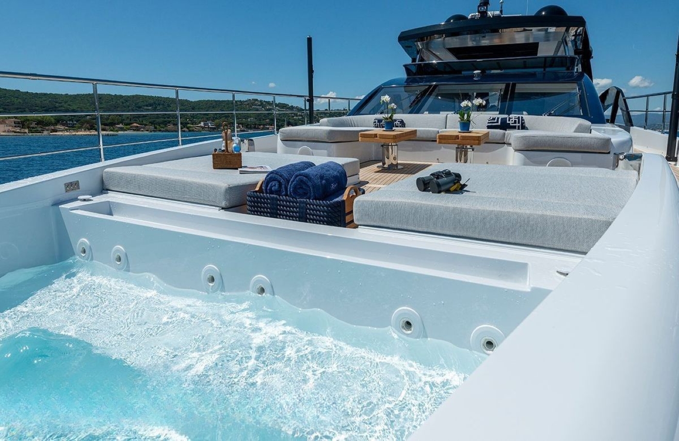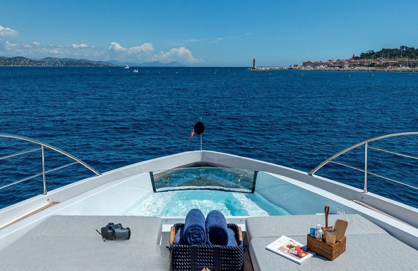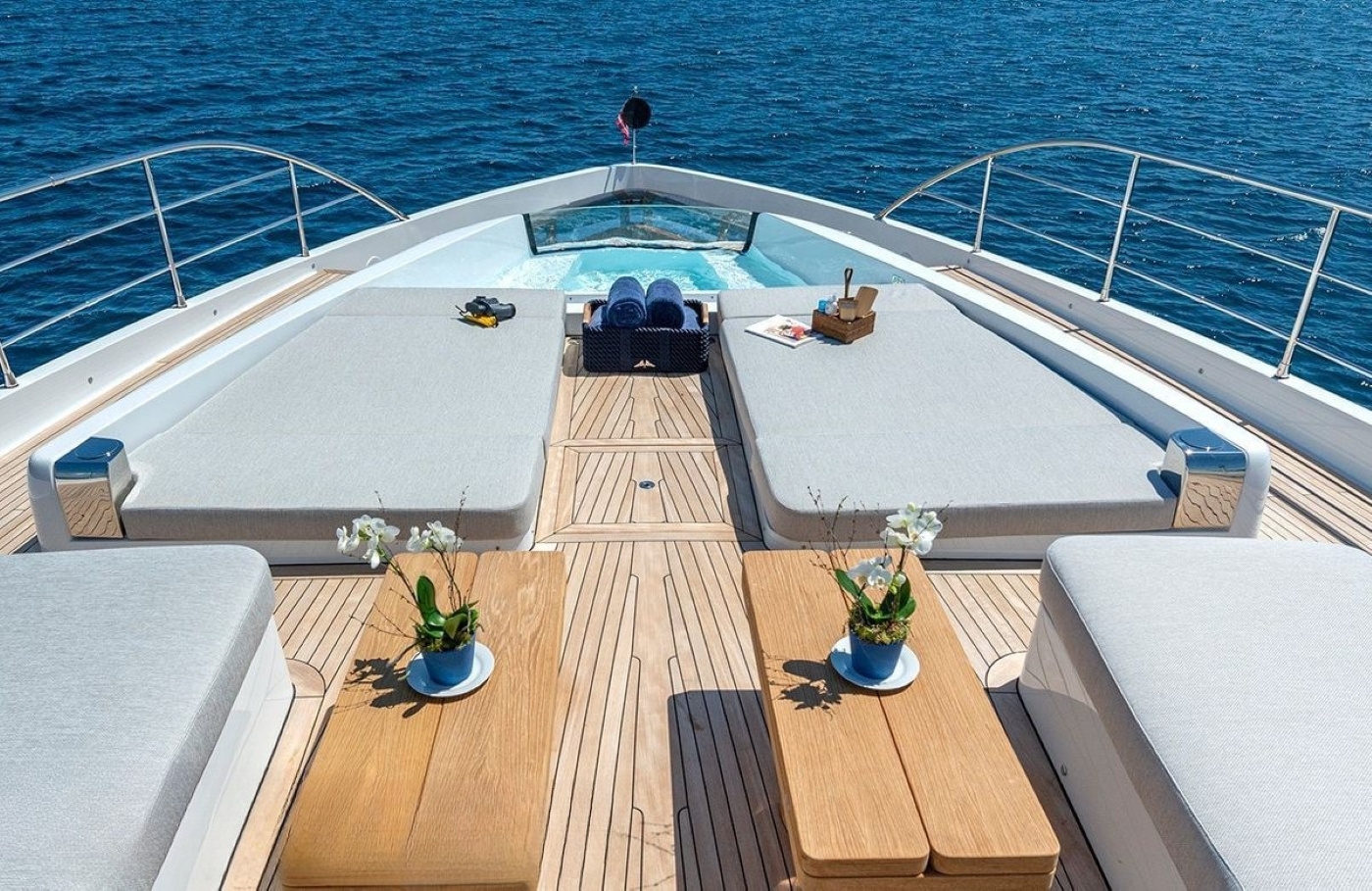 The foredeck is perfect for days reclining in the sun and has a low u-shaped sofa around flexible up/down tables and two double cushioned sun pads adjacent to the forward glass fronted jacuzzi pool.