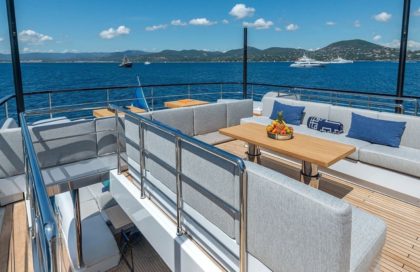 The fabulous sun deck is partially covered by the hard roof but offers flexibility thanks to the retractable section. The dining table and bar are situated forward under the roof while a sociable lounge with opposite sofas sits aft. There is an additional aft facing sofa with flexible tables and a corner sun pad plus a forward helm station with adjacent bench sofas.