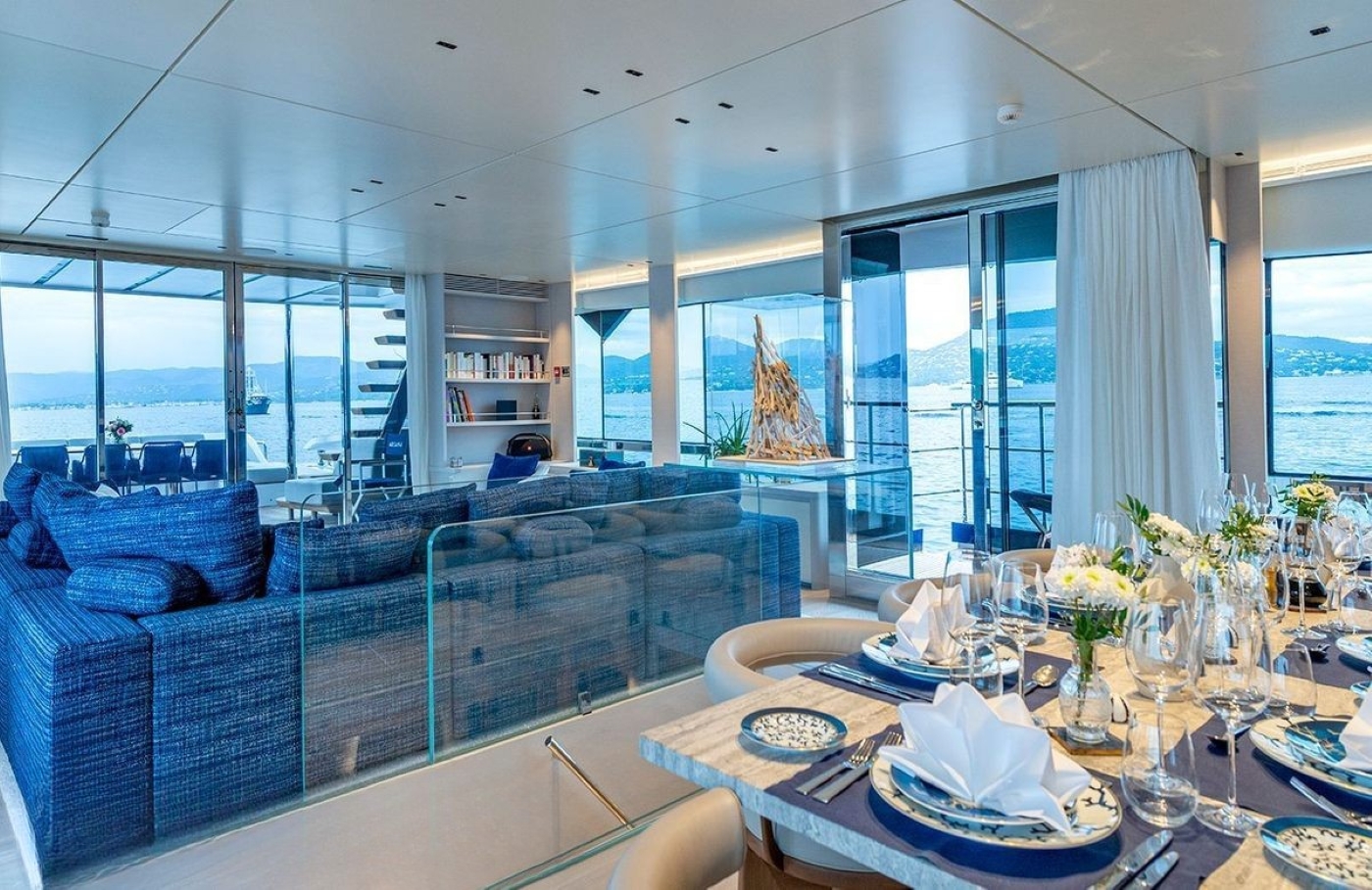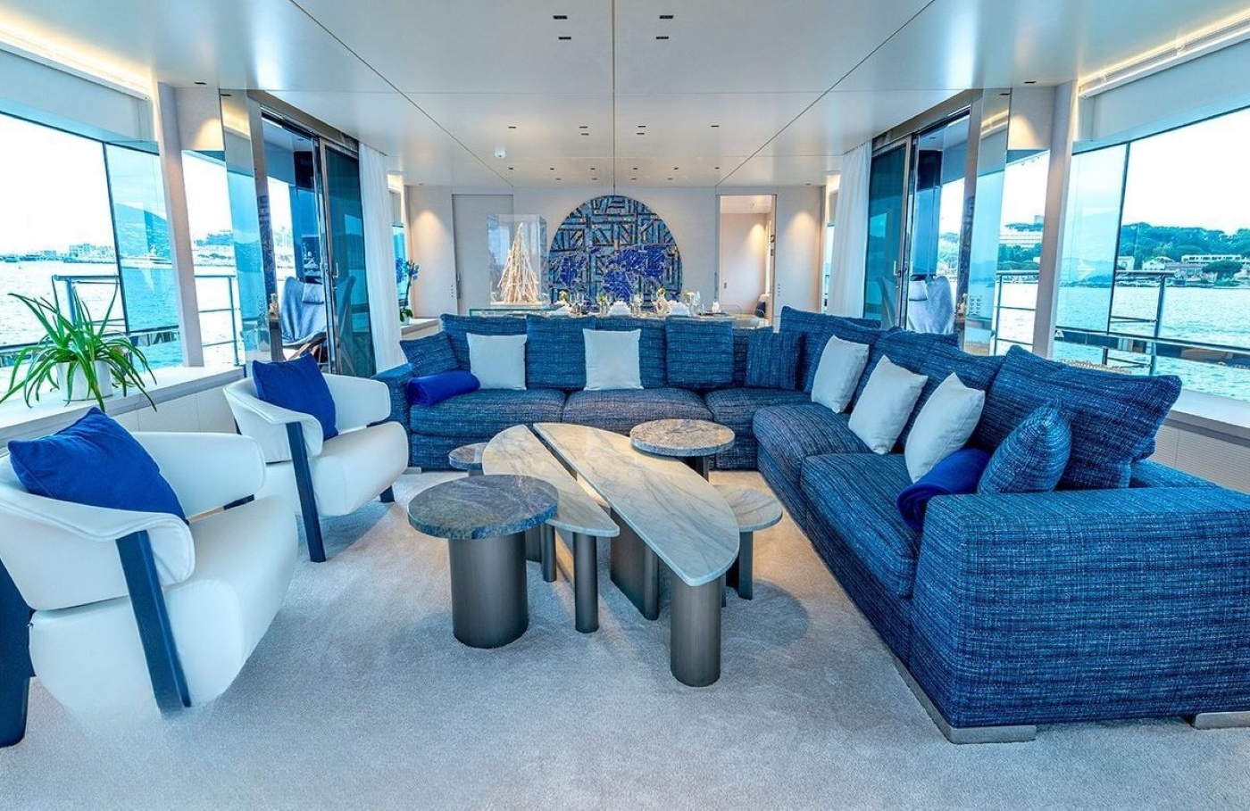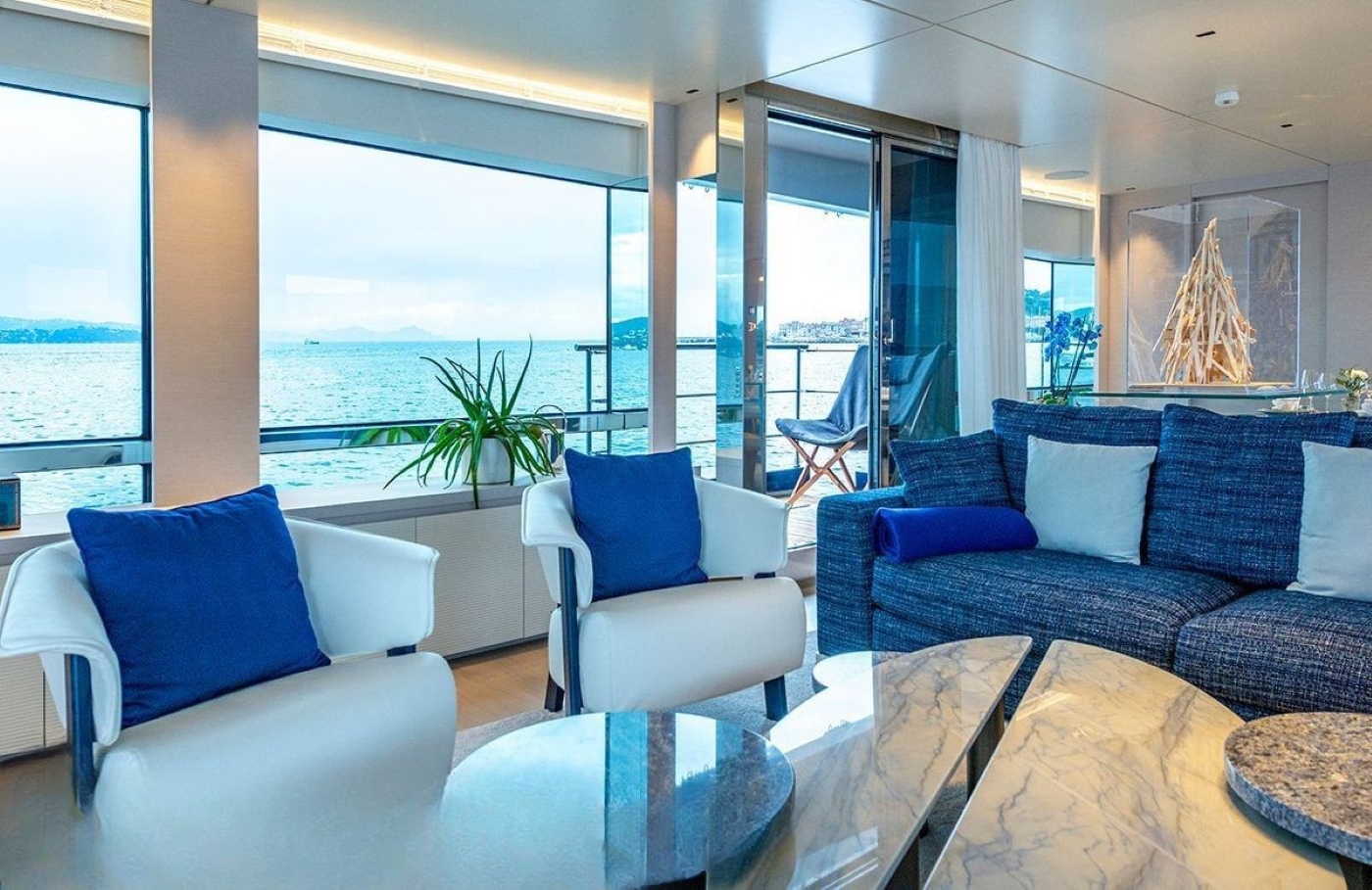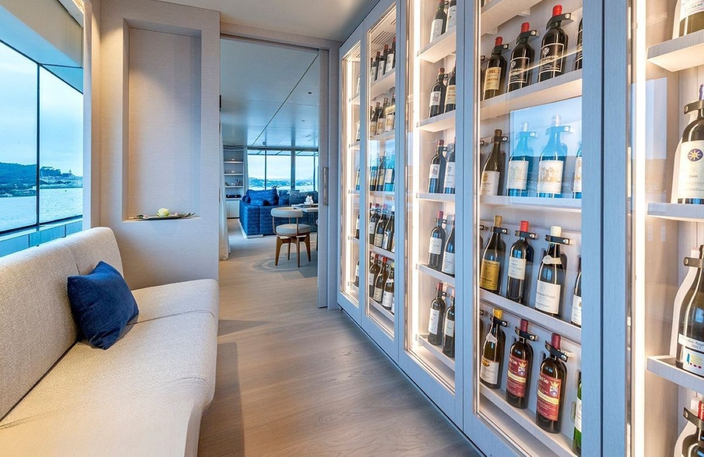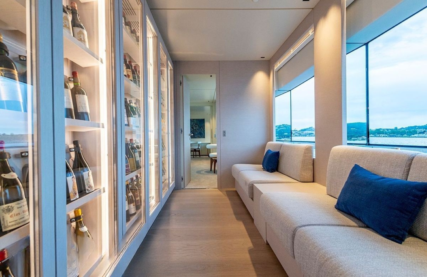 The beautiful contemporary interior is light and airy thanks to the full-length glazing on three sides and doors out to the aft and side decks – these also boast fold out balconies. The décor blends light wood with neutral tones and accents of ocean blue across the furniture – the fixtures and fittings are from a selection of respected designers. The main salon is configured as a lounge aft and a forward dining space and a large glass-encased, triple-fronted wine cellar takes centre stage.