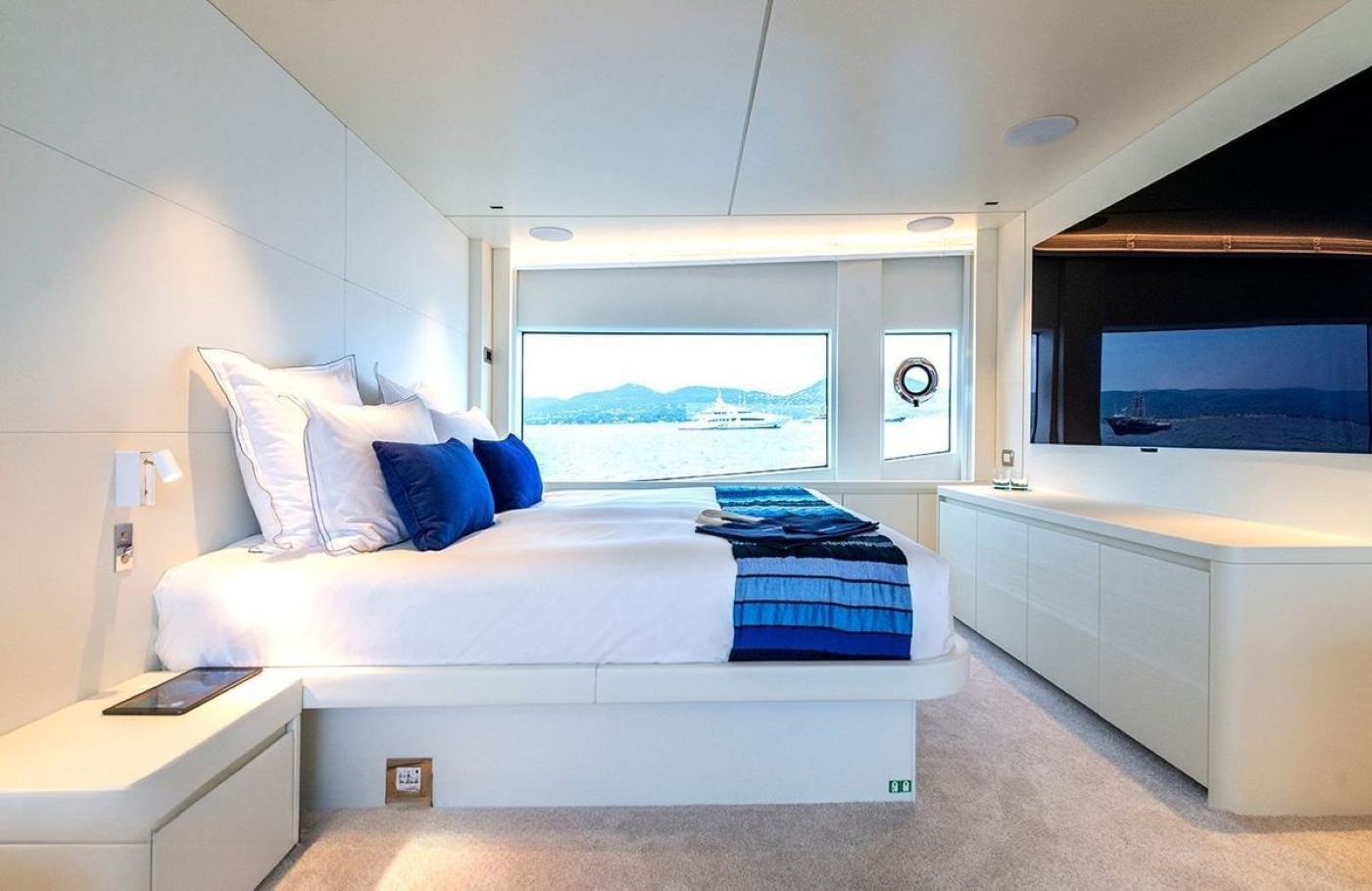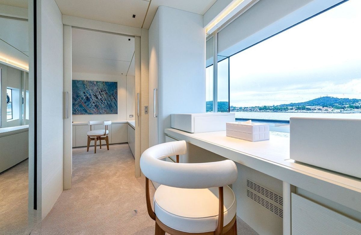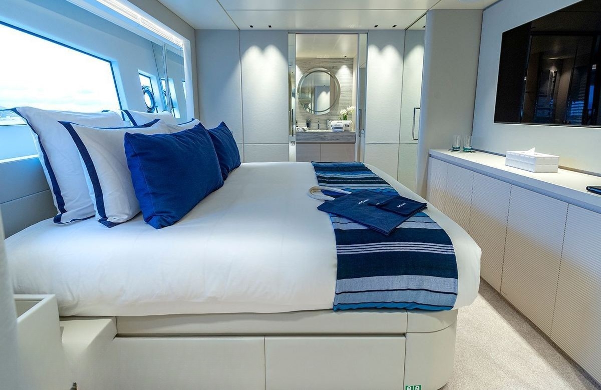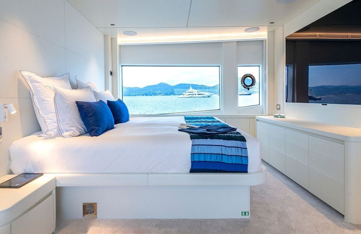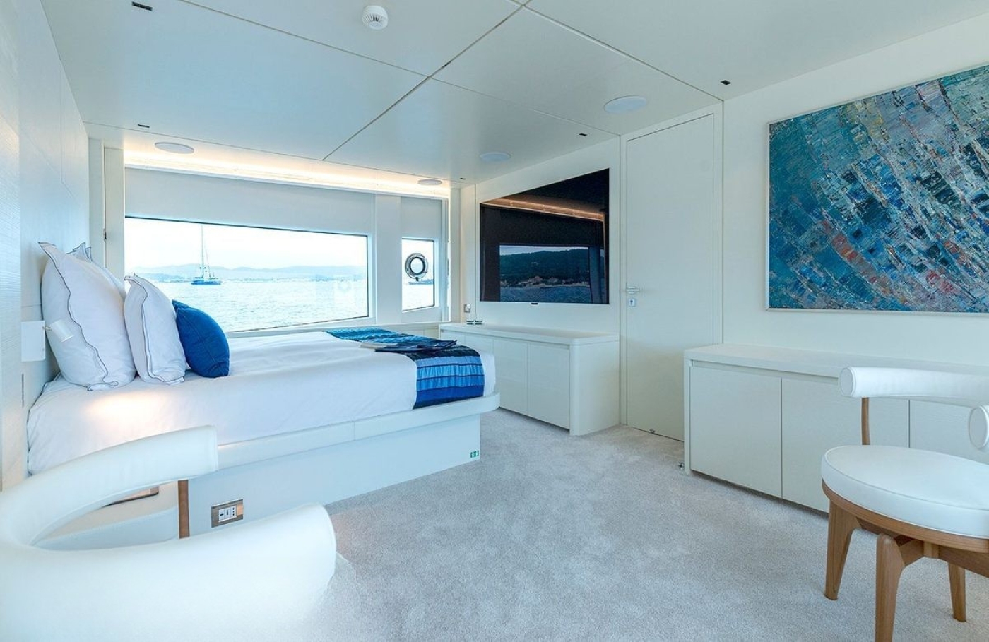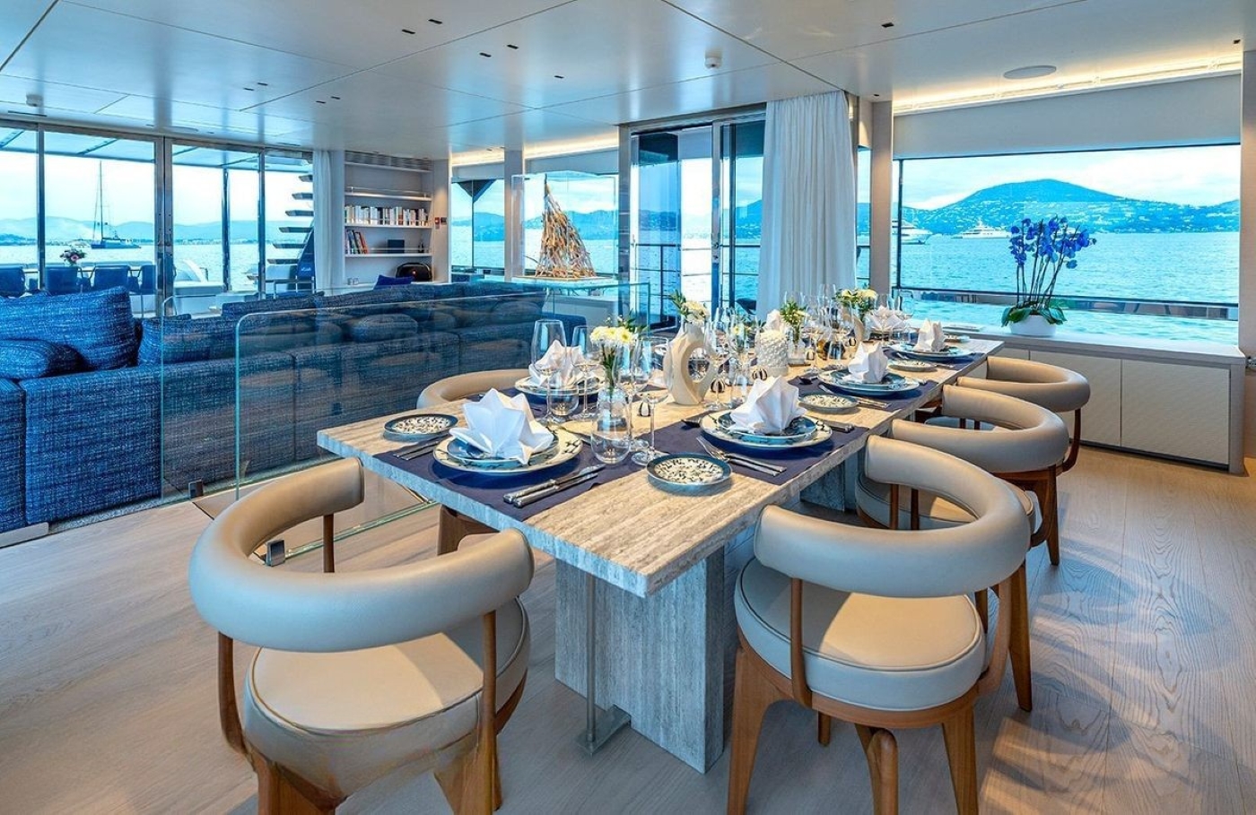 The beautiful contemporary interior is light and airy thanks to the full-length glazing on three sides and doors out to the aft and side decks – these also boast fold out balconies. The décor blends light wood with neutral tones and accents of ocean blue across the furniture – the fixtures and fittings are from a selection of respected designers. The main salon is configured as a lounge aft and a forward dining space and a large glass-encased, triple-fronted wine cellar takes centre stage.