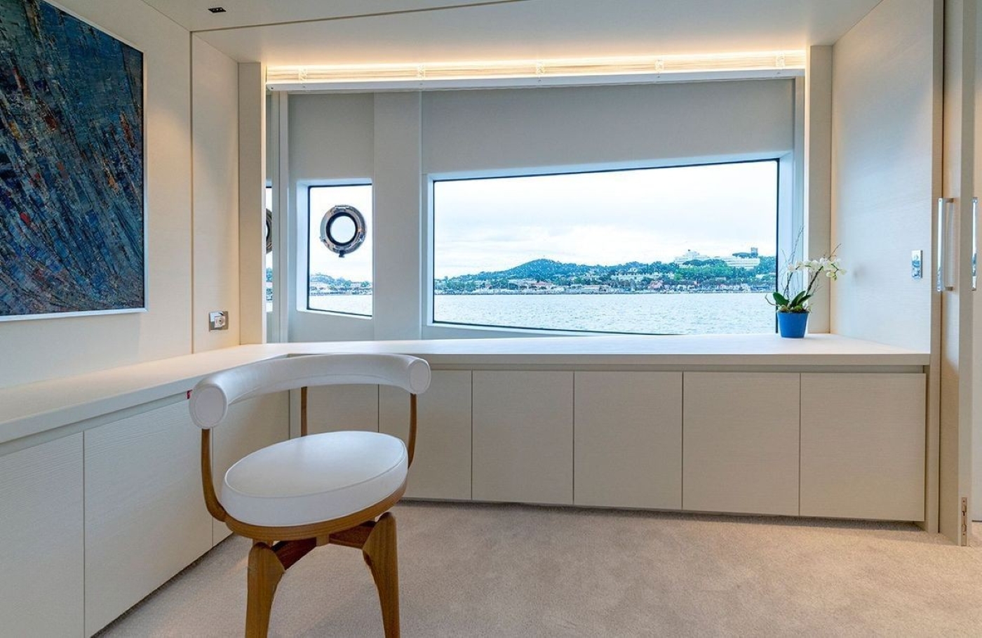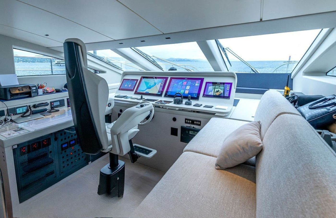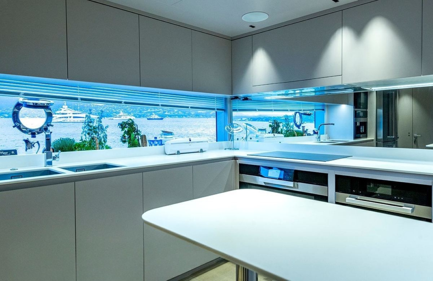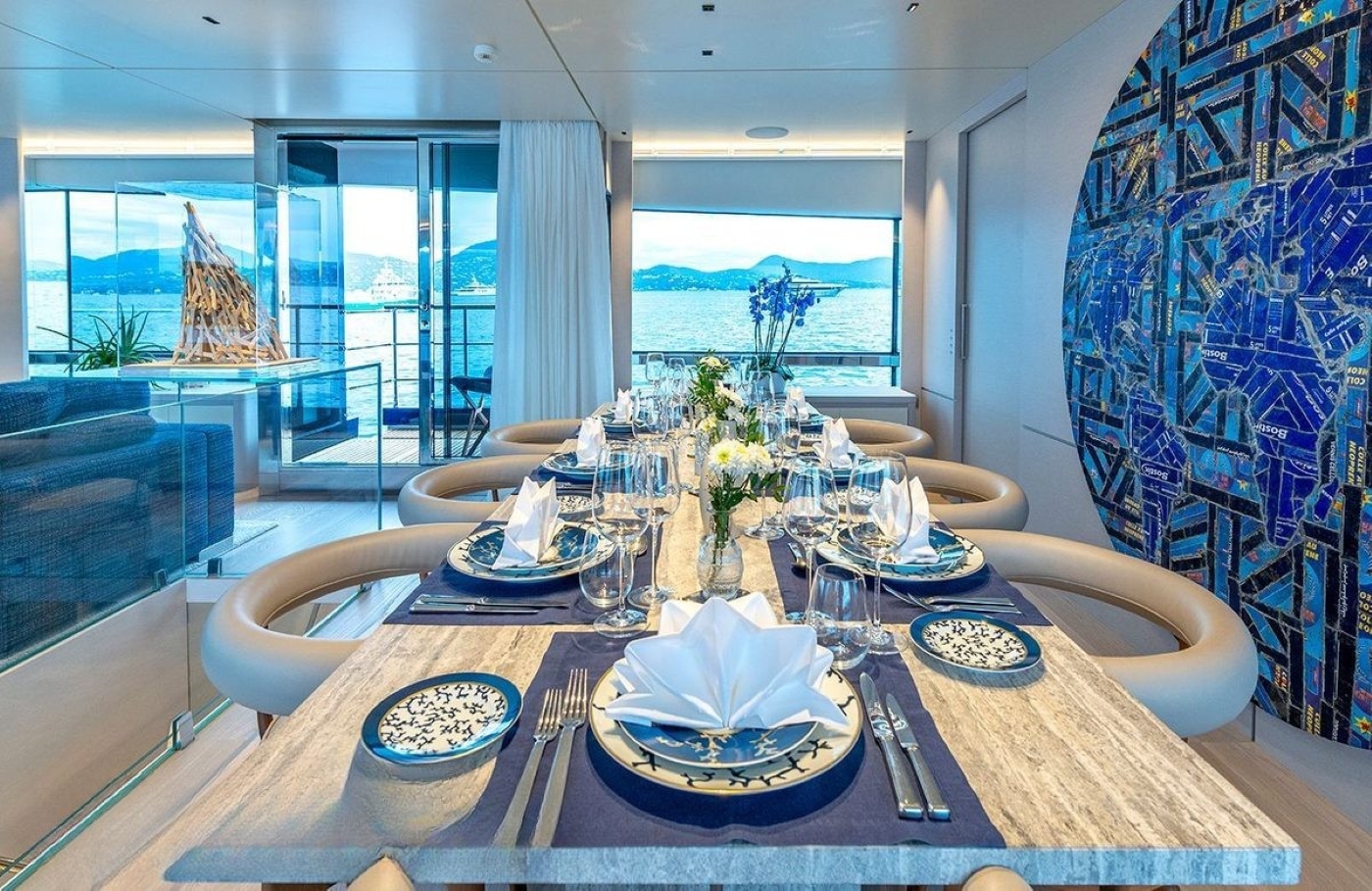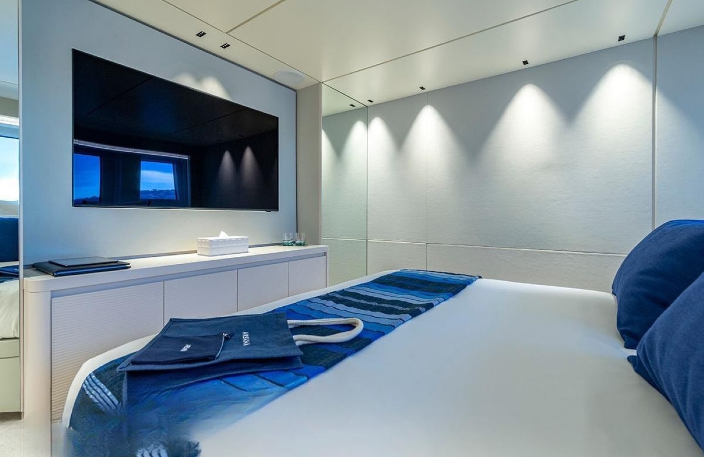 The beautiful contemporary interior is light and airy thanks to the full-length glazing on three sides and doors out to the aft and side decks – these also boast fold out balconies. The décor blends light wood with neutral tones and accents of ocean blue across the furniture – the fixtures and fittings are from a selection of respected designers. The main salon is configured as a lounge aft and a forward dining space and a large glass-encased, triple-fronted wine cellar takes centre stage.