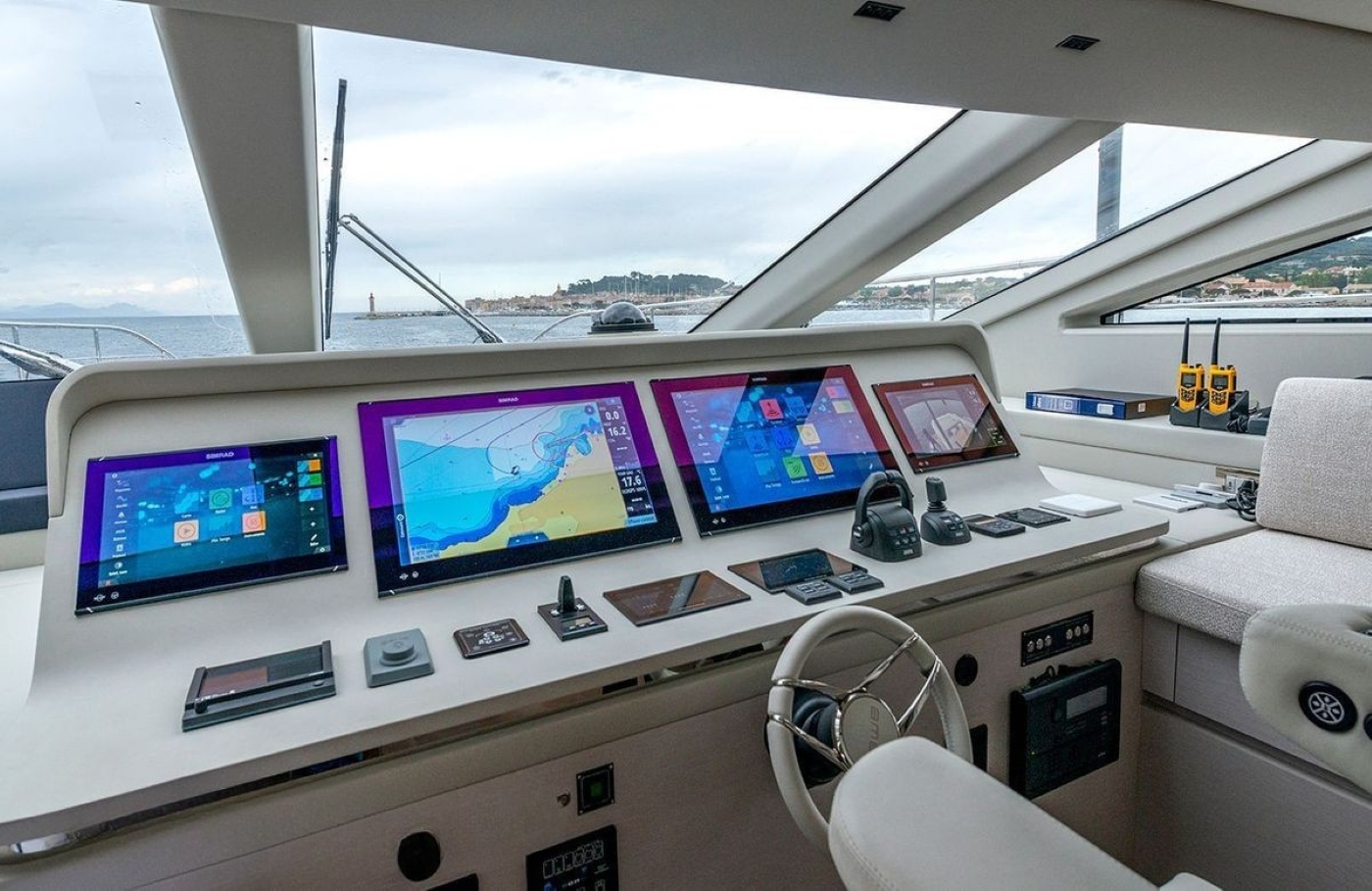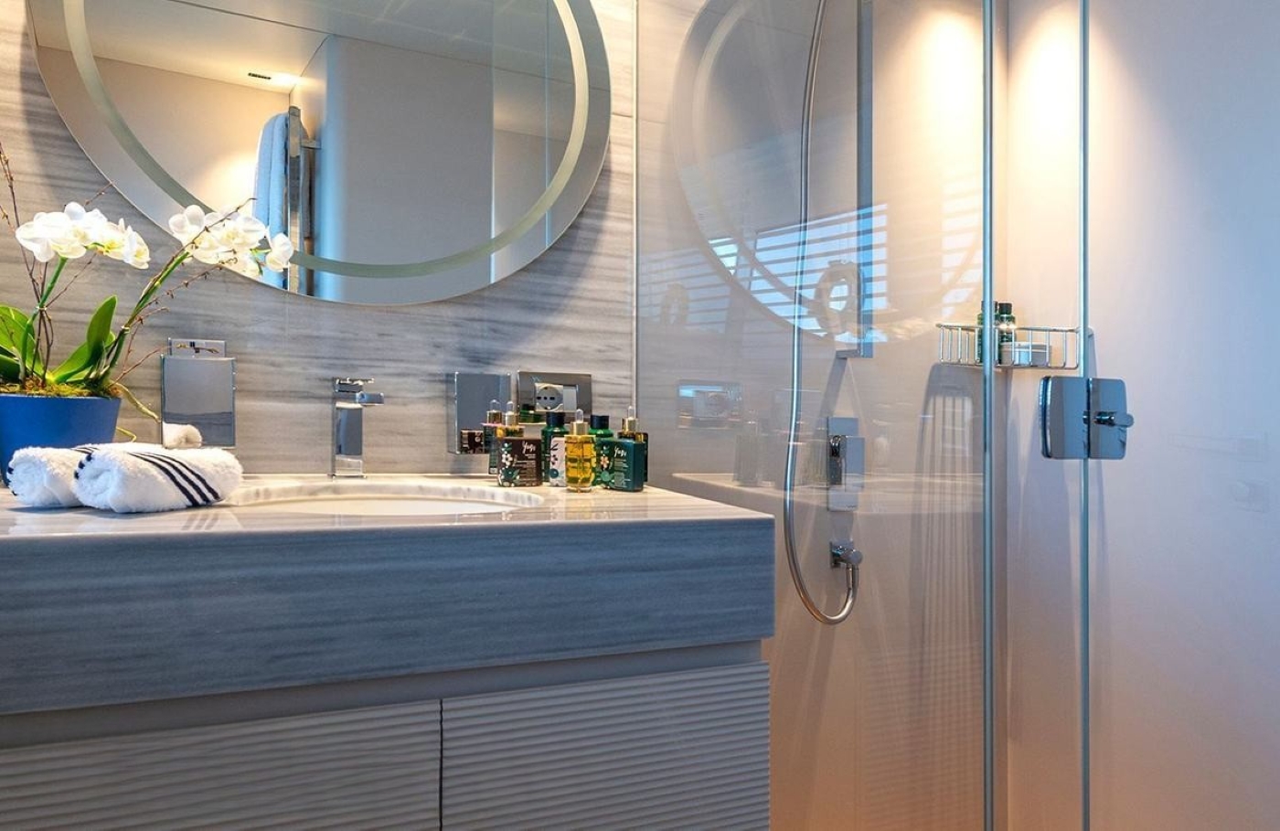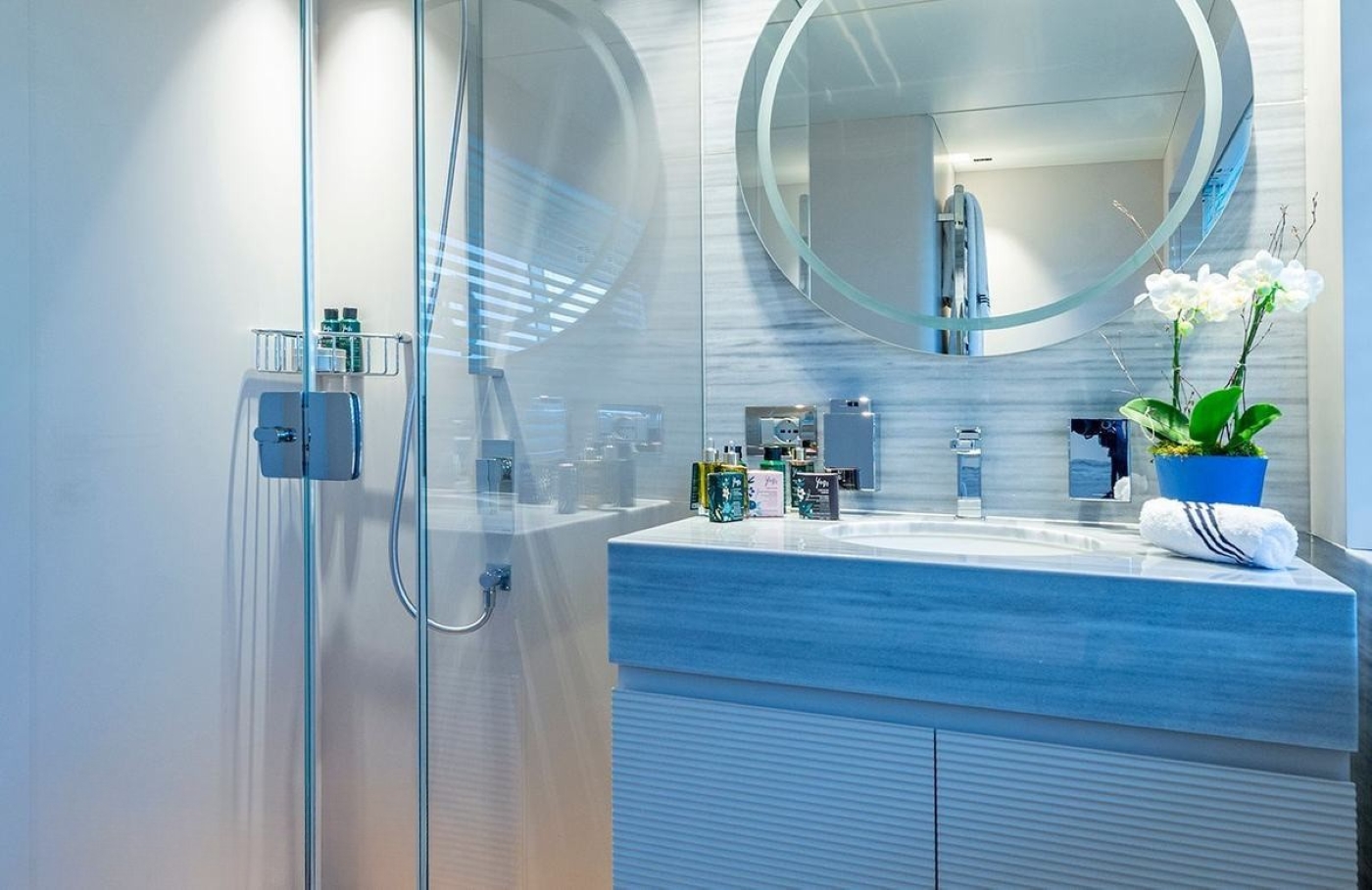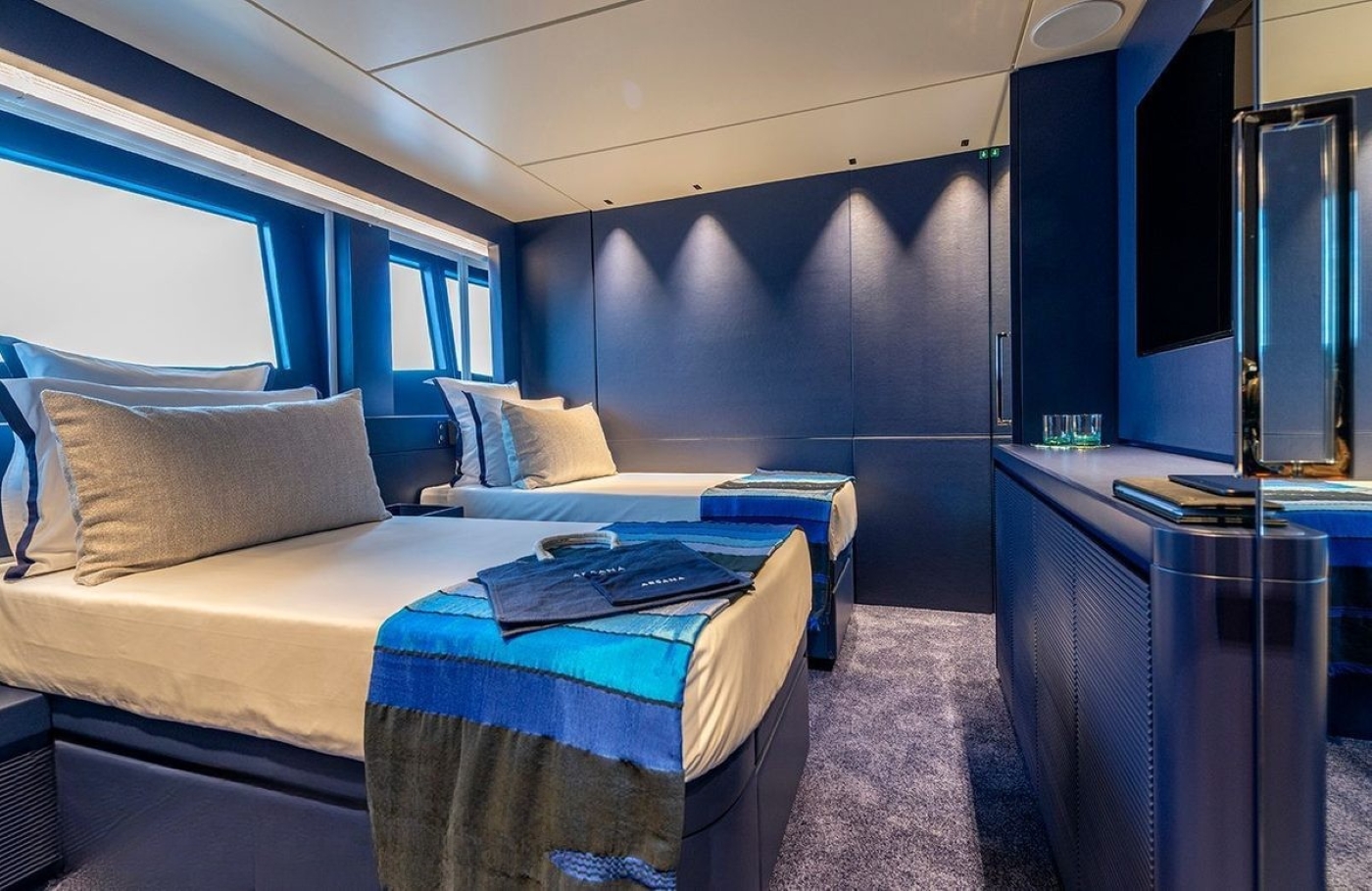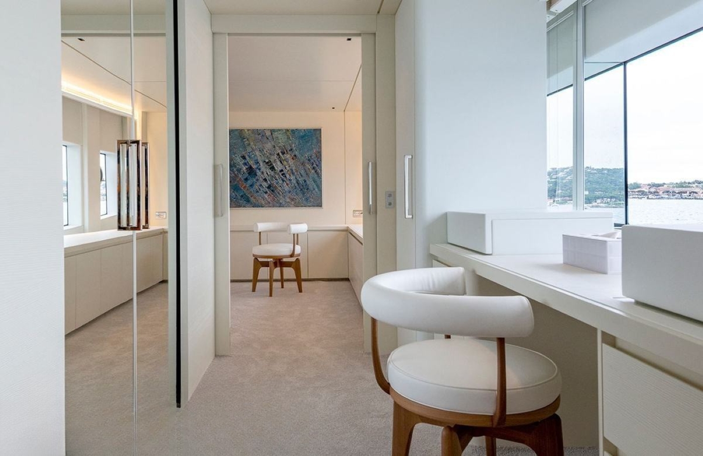 The beautiful contemporary interior is light and airy thanks to the full-length glazing on three sides and doors out to the aft and side decks – these also boast fold out balconies. The décor blends light wood with neutral tones and accents of ocean blue across the furniture – the fixtures and fittings are from a selection of respected designers. The main salon is configured as a lounge aft and a forward dining space and a large glass-encased, triple-fronted wine cellar takes centre stage.