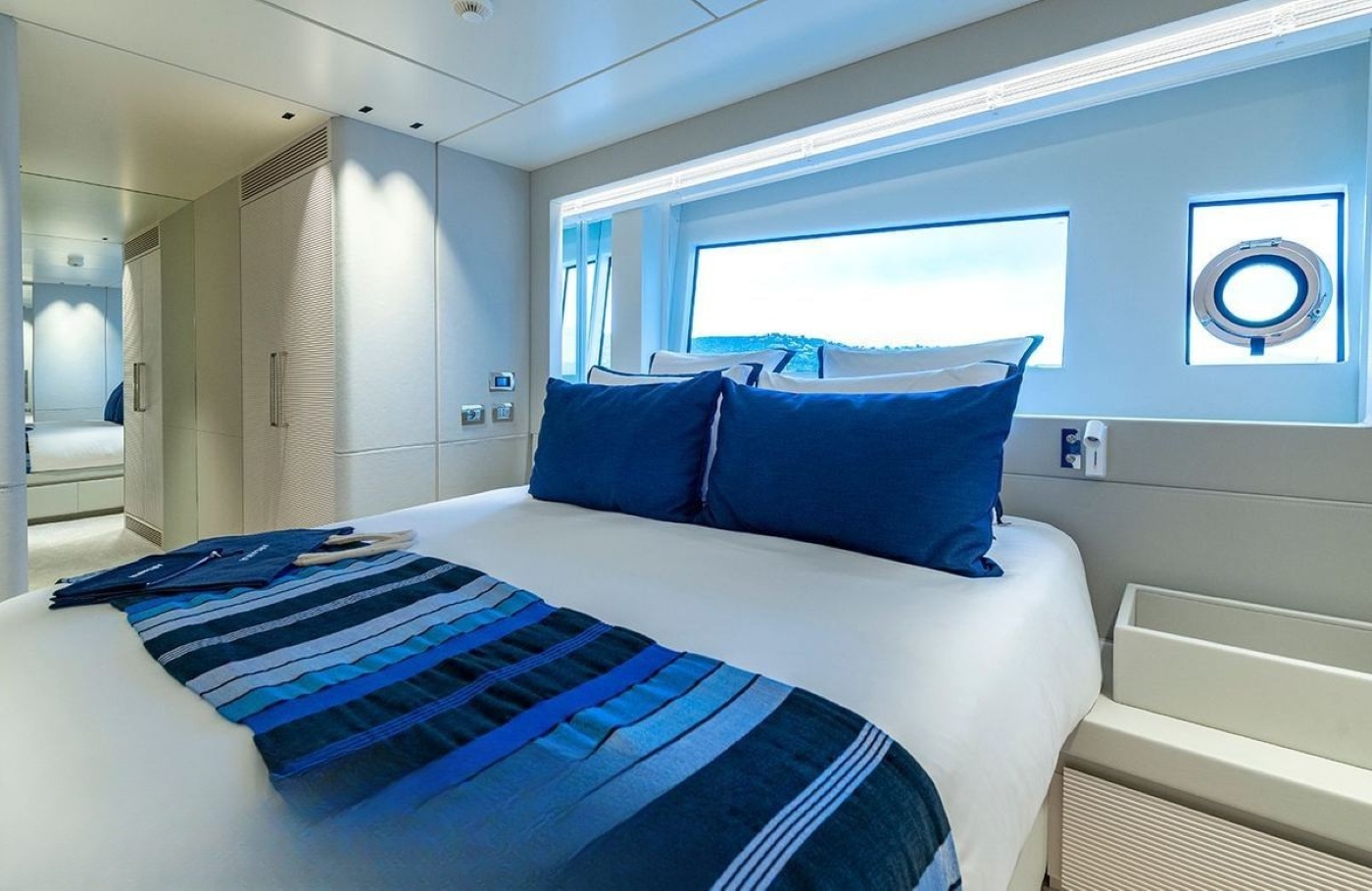Accommodation is for up to ten guests in five staterooms featuring a full-beam owner’s suite on the main deck which boasts a king-sized bed, limestone ensuite, walk-in wardrobe and magical views. There are four guest double cabins are situated on the lower deck, all with the luxury and privacy of ensuite bathroom facilities.