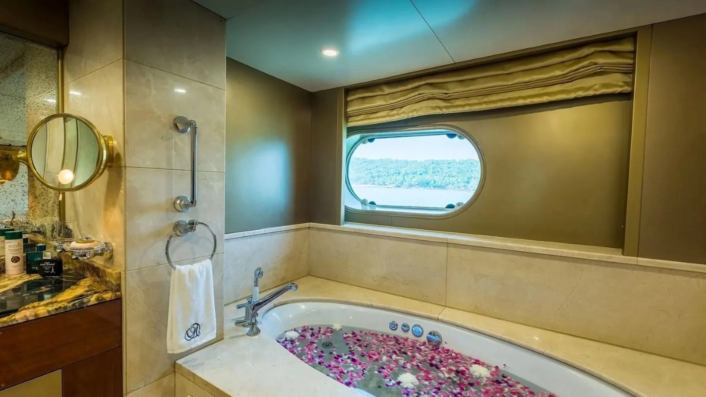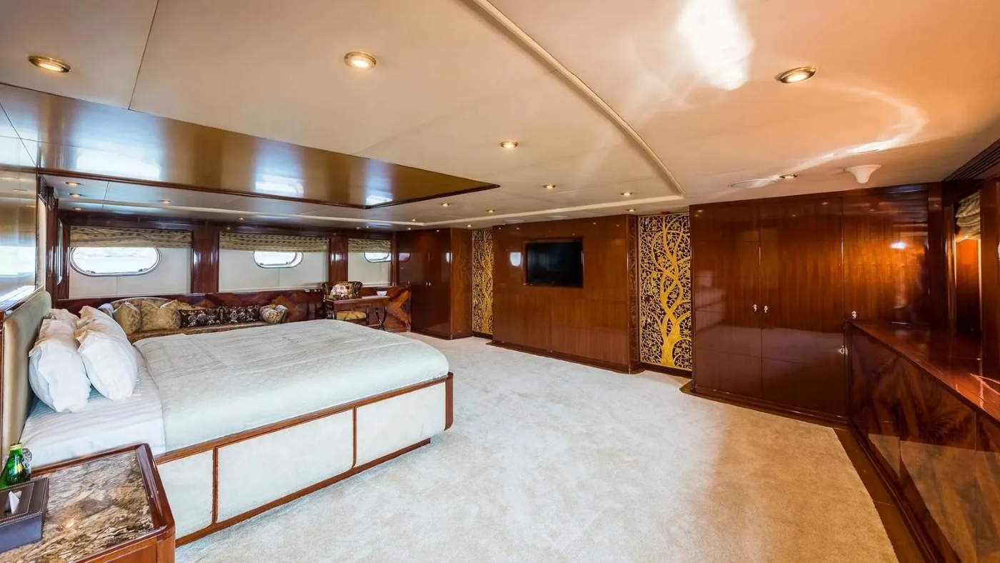 The accommodation sleeps a maximum of 16 guests across 6 en-suite cabins: 1 Master suite, 2 VIP staterooms, 2 twin cabins both containing a Pullman berth and 1 convertible cabin. ~ The Master suite is placed on the main deck forward and has a king-sized bed and an en-suite bathroom with separate toilets and sinks and a central bathtub and a Jacuzzi. ~ The VIP staterooms and twin cabins are placed on the lower deck and all have a desk, wardrobe space and an en-suite bathroom with a toilet, sink and shower. The lounge on the bridge deck can be converted into an en-suite cabin with a queen bed. ~ The crew of 12 will ensure that everyone on board receives the first-class service throughout the cruise.