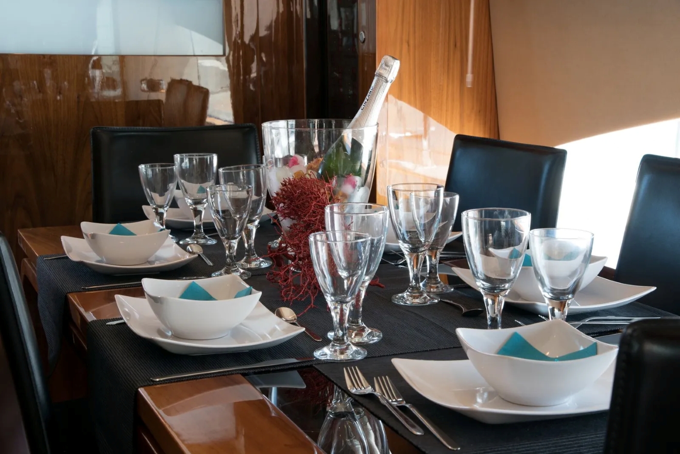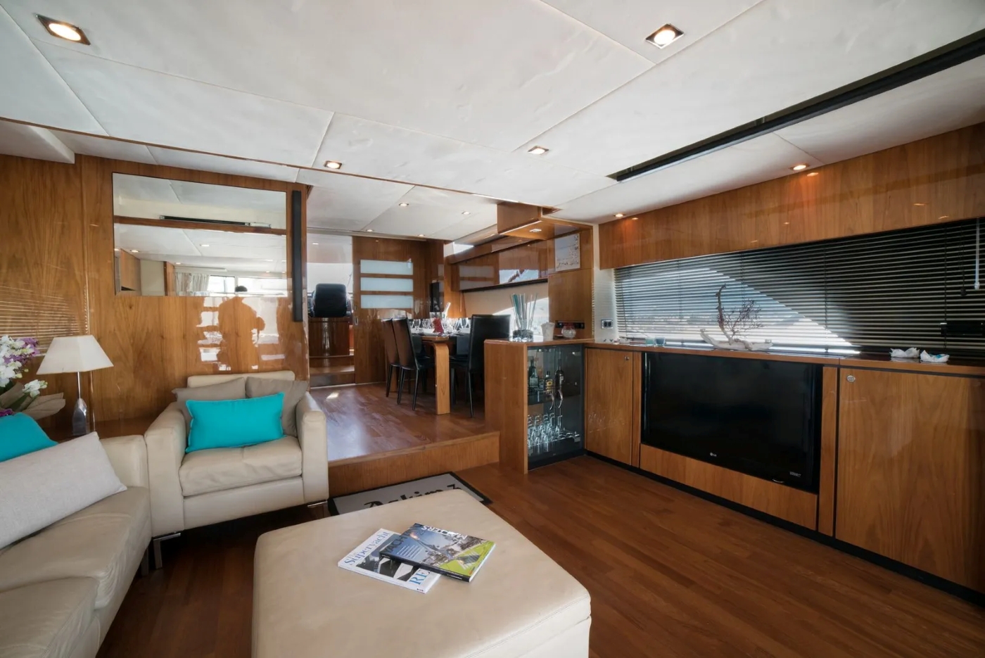 ASKIM3 motor yacht has plenty of exterior living to relax and enjoy. The aft deck is shaded and adjacent to the salon, via sliding glass doors, and offers an alfresco dining option and ample seating, perfect for entertaining. Further aft, the full beam extended swim platform provides effortless water access, to the good assortment of sea toys on offer. For the sun worshipers, the foredeck features a double sunpad. On the upper flybridge deck, guests may dine alfresco and soak up the sun in style, while gazing at the idyllic scenery.