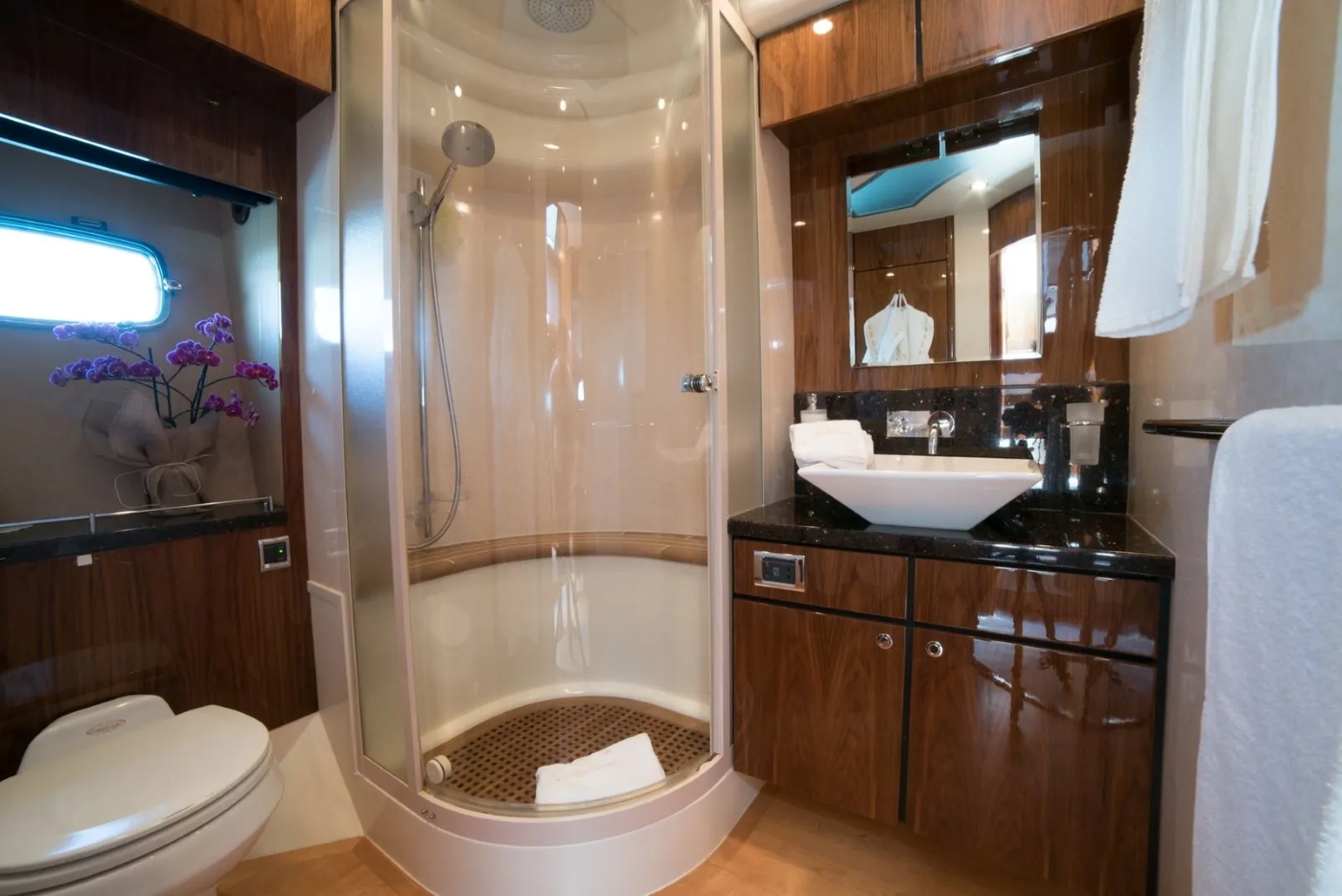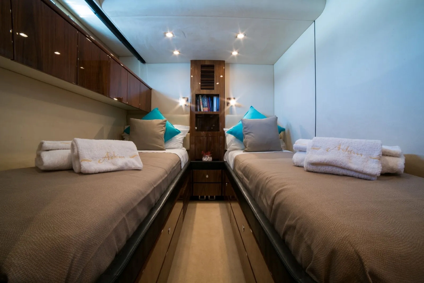 Luxury crewed charter yacht ASKIM3 has well-appointed accommodation in 4 cabins, for up to 8 guests. The master suite is amidships and full beam of the yacht, with a center lined queen size bed, sofa, vanity and en-suite, with his and hers sinks. A VIP cabin is forward and full beam of the yacht, with a center lined queen size bed. Two guest cabins each have side by side twin beds. All 4 cabins boast a timeless décor and plenty of natural light. A professional crew of 3 has separate quarters aft, ensuring guests’ optimum privacy.