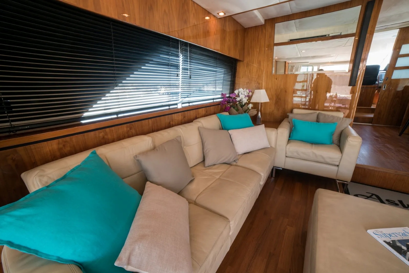 The interiors are elegant and refined, featuring high gloss rich wood panels, supple cream leather furnishings and ample natural light throughout. The salon offers a generous 3 piece leather suite, coffee table and full entertainment systems. Forward the formal dining table is in a raised position and seats all 8 guests with ease. The well-appointed galley is opposing the formal dining area and has a sliding door to enclose completely. Thanks to elongated side windows in the salon, it receives an abundance of natural light. Guest accommodation is below decks, in 4 en-suite cabins.