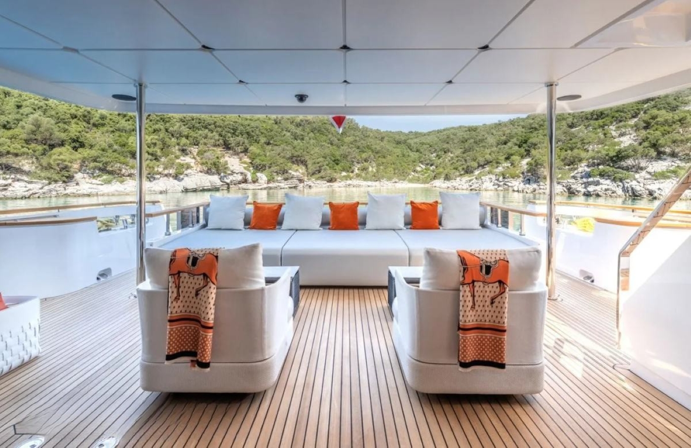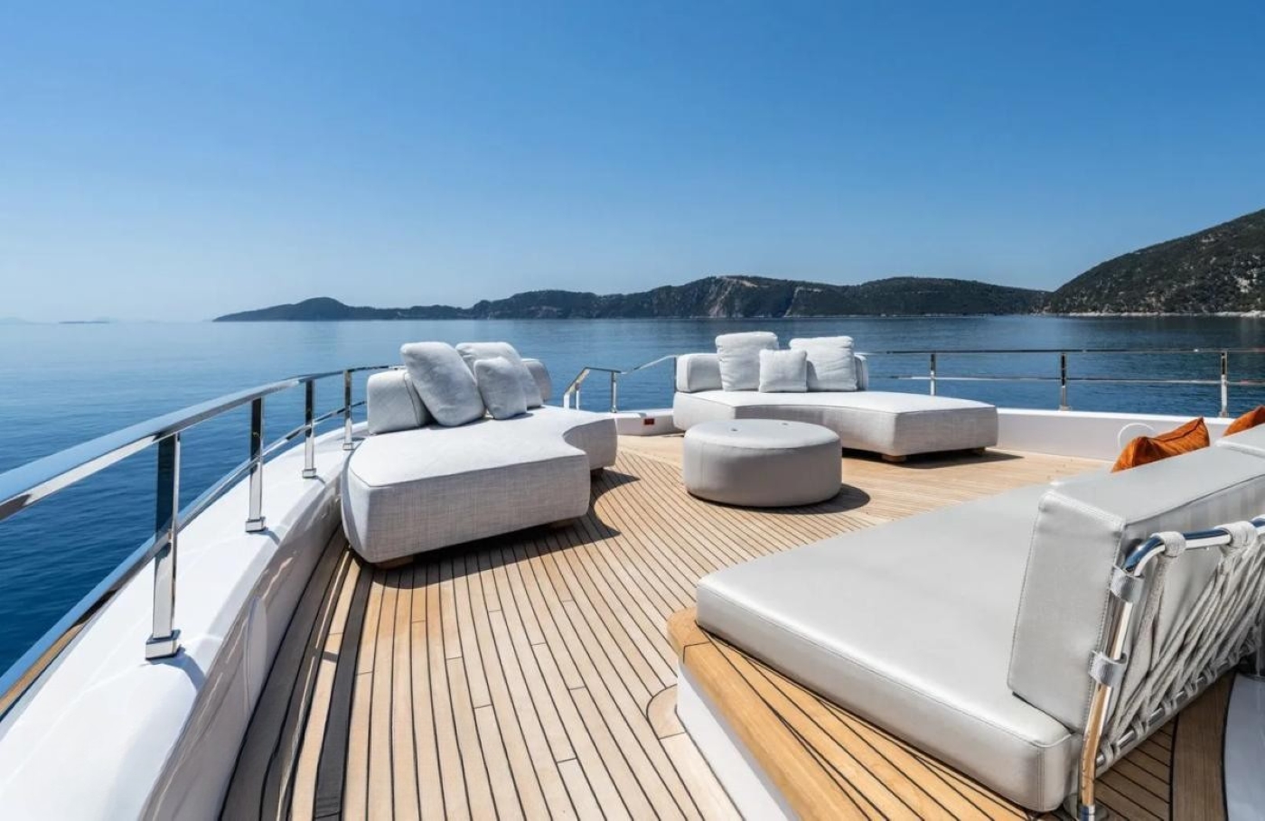The exterior features sweeping horizontal lines towards the bow, giving the yacht a sleek and dynamic silhouette.