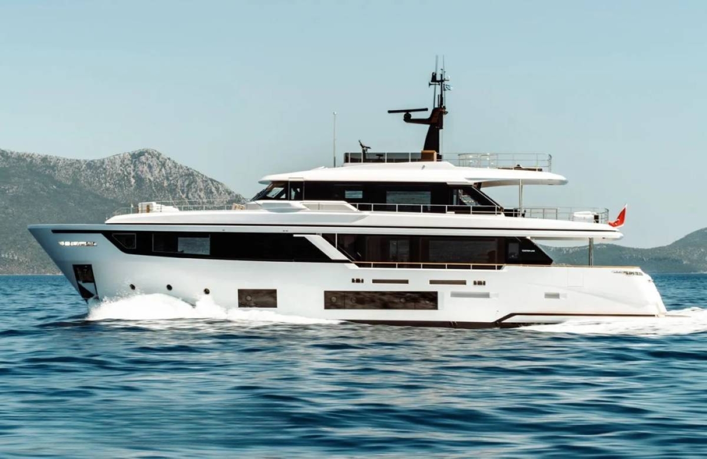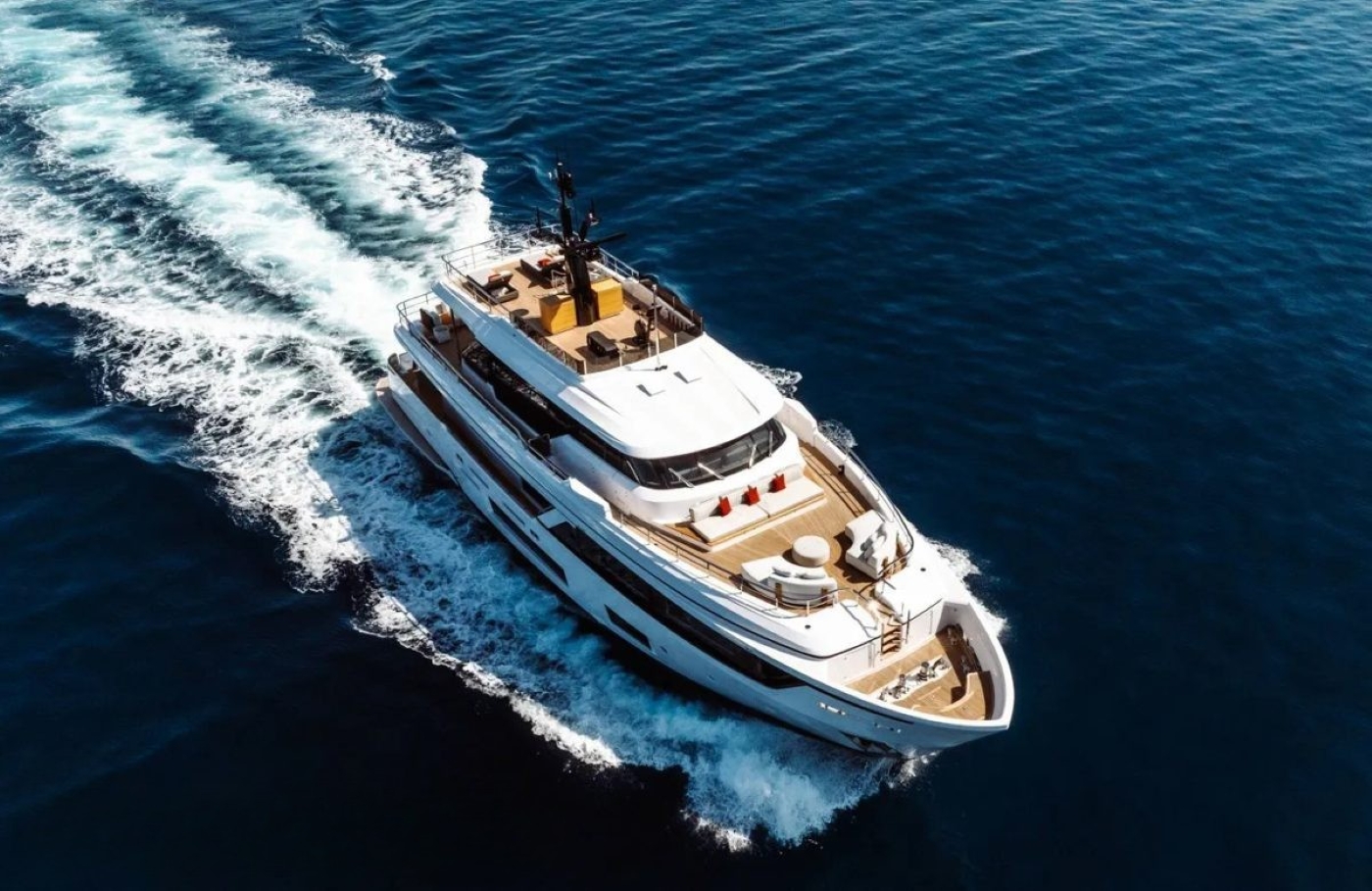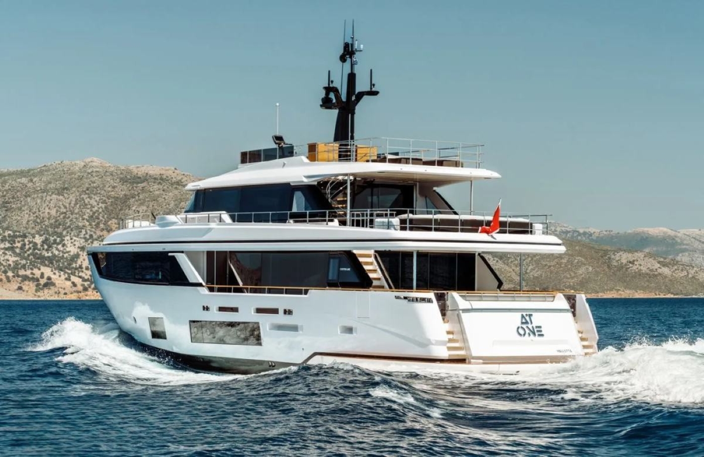 Motor yacht AT ONE is a 28.43m (93'2") Custom Line Navetta 30 from Ferretti Group Engineering, ACPV Architects and Custom Line Atelier launched in 2024. She features an ambitious volume with a timeless aesthetic and forward-thinking styling across her ambitious volume. She can accommodate up to 10 guests in five suites with three additional crew cabins for a crew of 6.