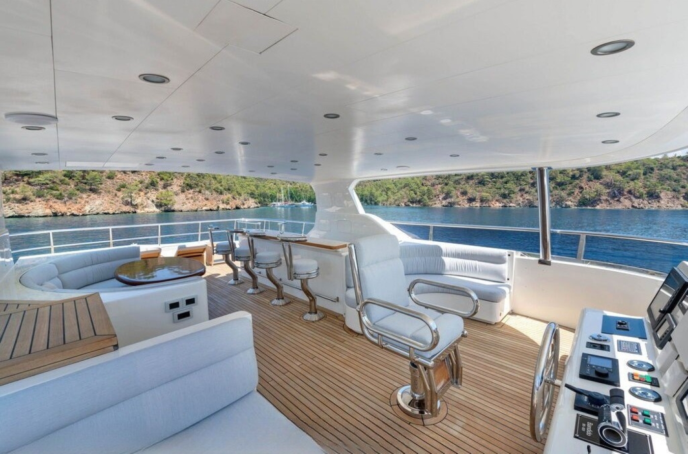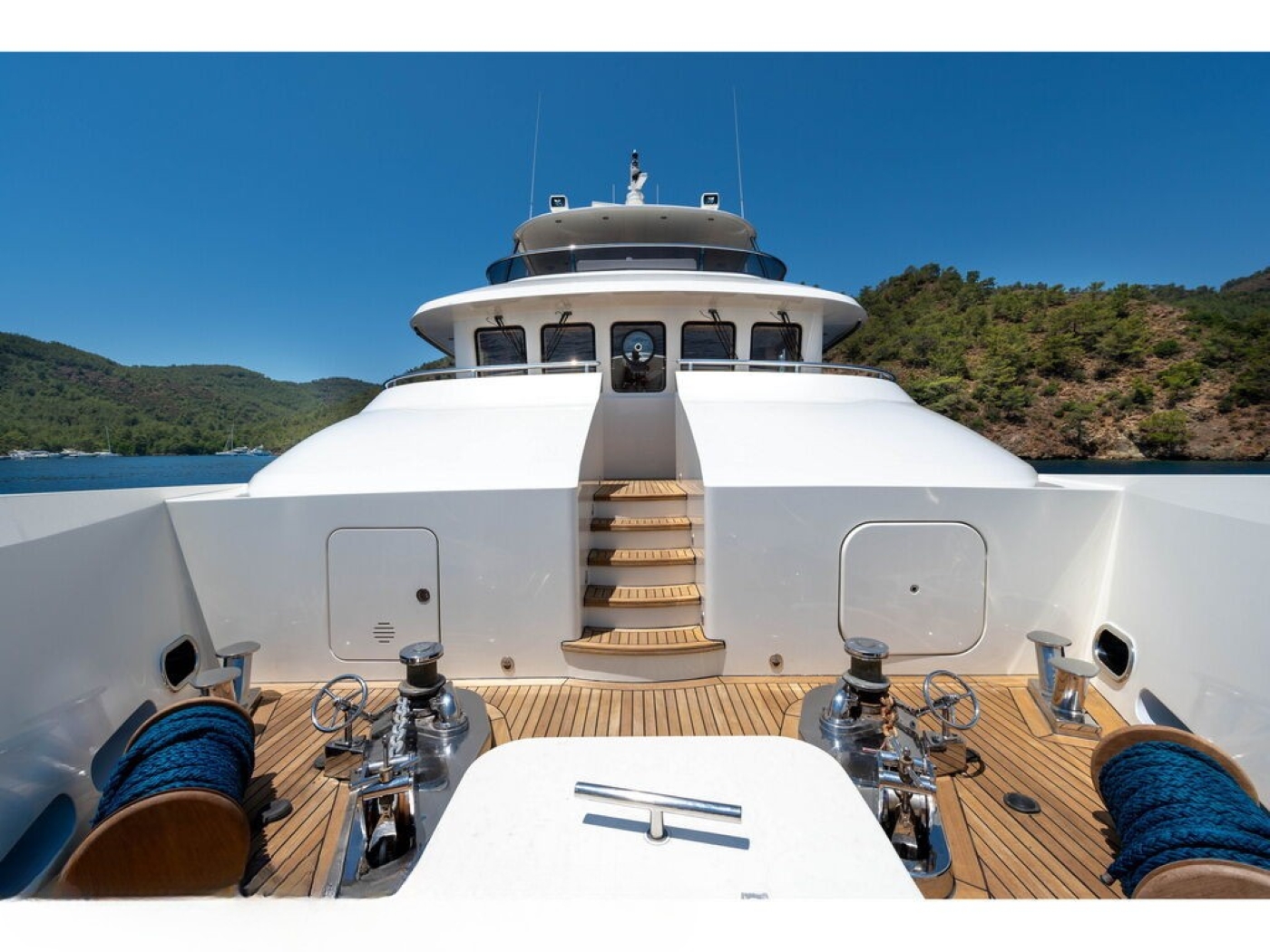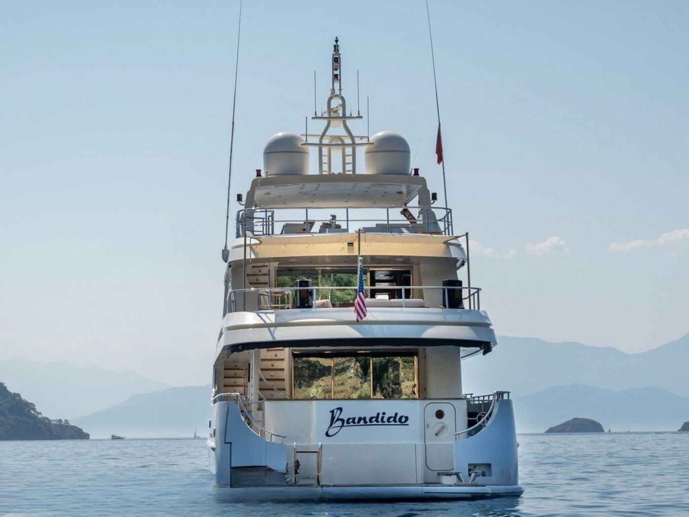 BANDIDO is an explorer style yacht; she has a displacement steel hull and tri-deck design. She has a light interior décor and contemporary ambiance. On the main deck is a generous salon with a plush leather sofa, coffee table and full entertainment systems. Forward in an open plan is the formal dining table, easily seating 8 guests in comfort and style. The master stateroom is on the main deck forward of the salon, while 3 additional guest cabins are on the lower deck. A central stair case leads from the salon into the upper skylounge, with a sofa, coffee table, entertainment and full wet bar creating the perfect social space. Both the main deck and the skylounge offer a convenient day head on the starboard side.