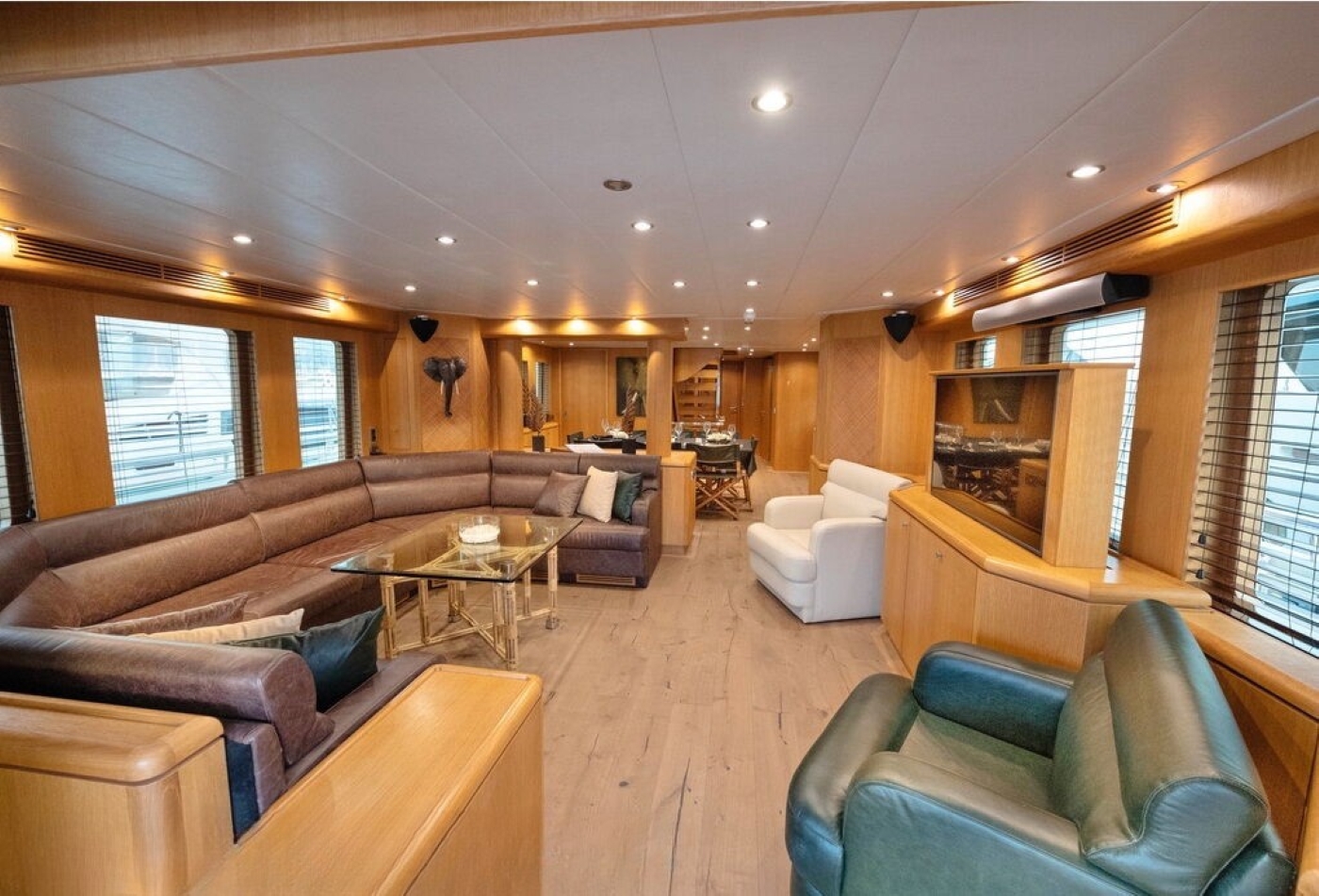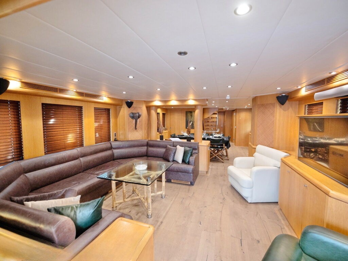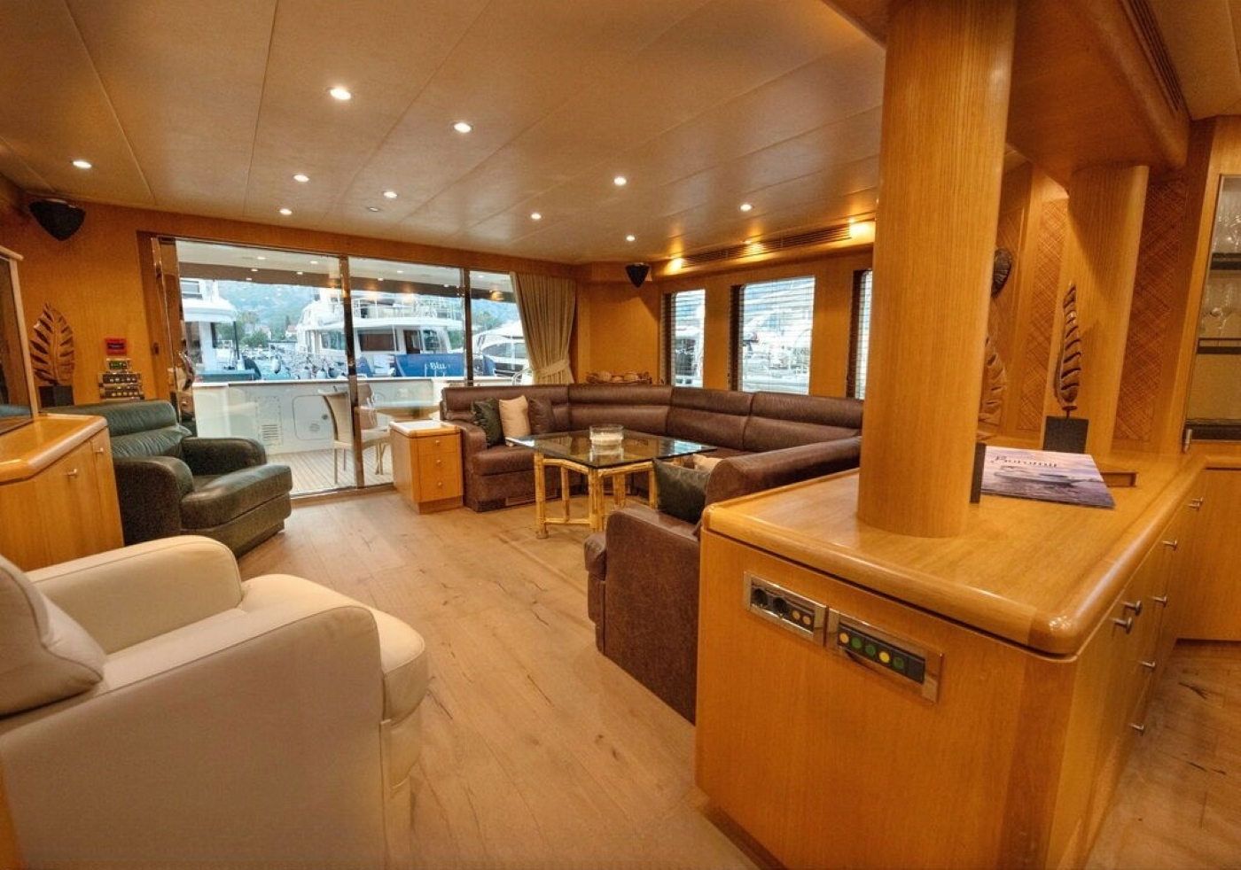 BANDIDO is an explorer style yacht; she has a displacement steel hull and tri-deck design. She has a light interior décor and contemporary ambiance. On the main deck is a generous salon with a plush leather sofa, coffee table and full entertainment systems. Forward in an open plan is the formal dining table, easily seating 8 guests in comfort and style. The master stateroom is on the main deck forward of the salon, while 3 additional guest cabins are on the lower deck. A central stair case leads from the salon into the upper skylounge, with a sofa, coffee table, entertainment and full wet bar creating the perfect social space. Both the main deck and the skylounge offer a convenient day head on the starboard side.
