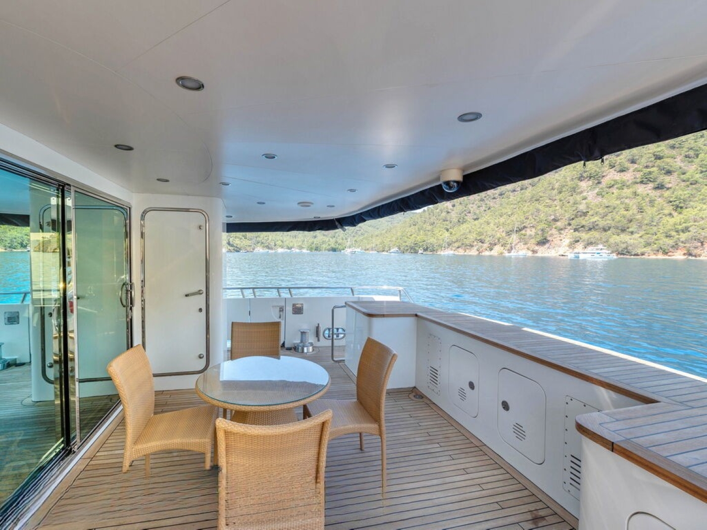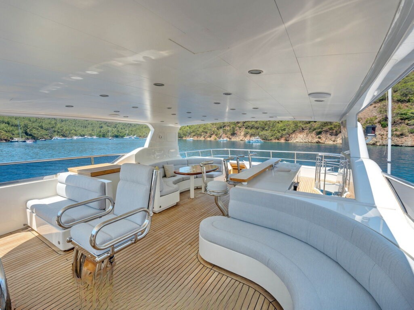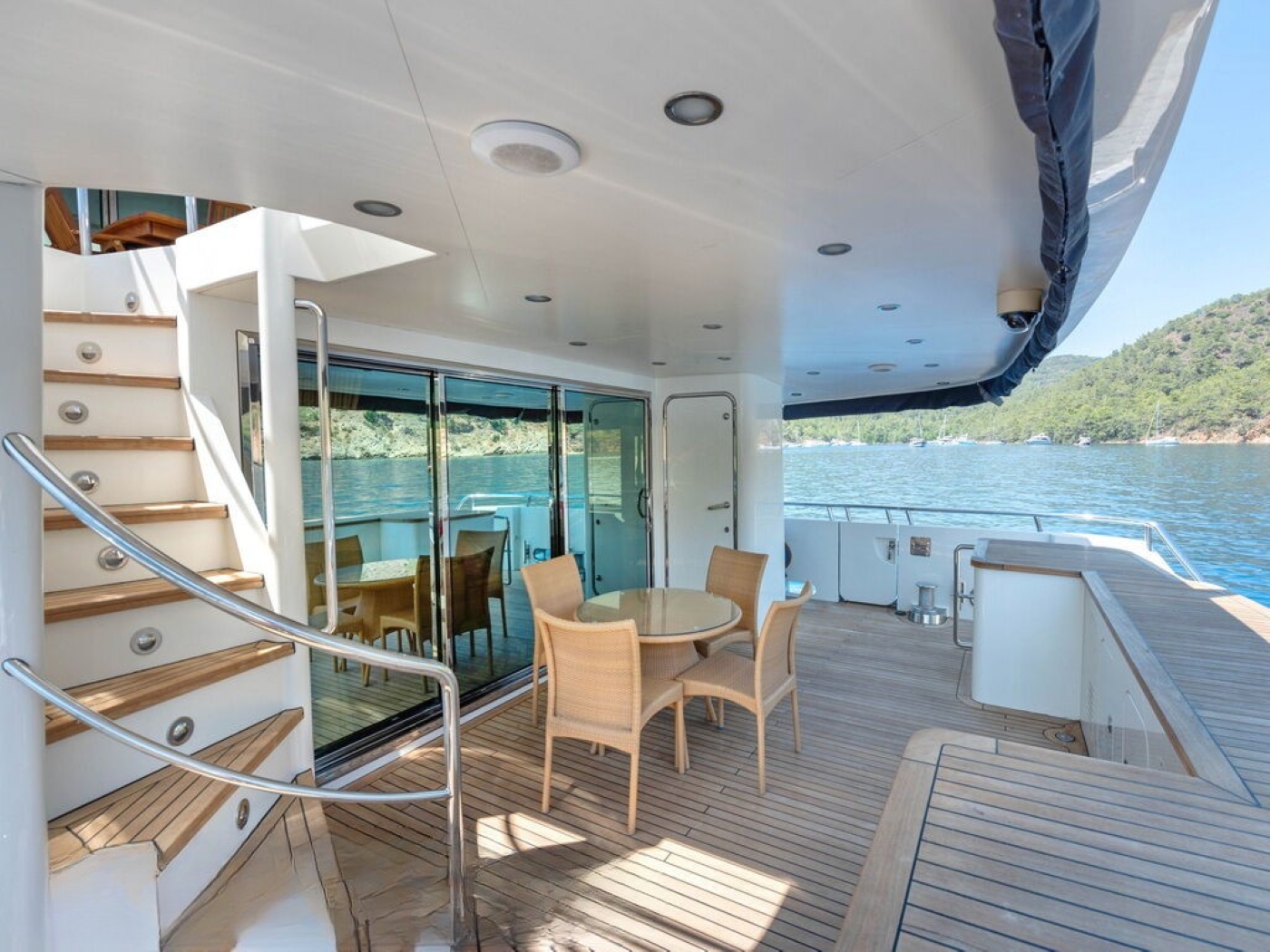 BANDIDO has ample deck space to relax and enjoy. The main deck is adjacent to the salon trough sliding glass doors and features and alfresco dining option and shade. Dual steps on port and starboard lead to the extended swim platform, where guests can effortlessly enjoy refreshing dip in the sea. The upper deck is partially shaded and boasts direct access to the skylounge, an exterior lounge with plush seating and coffee table. The sundeck is ideal for any occasion, offering an alfresco dining option, wet bar with cooking range, additional seating and chaise lounges.