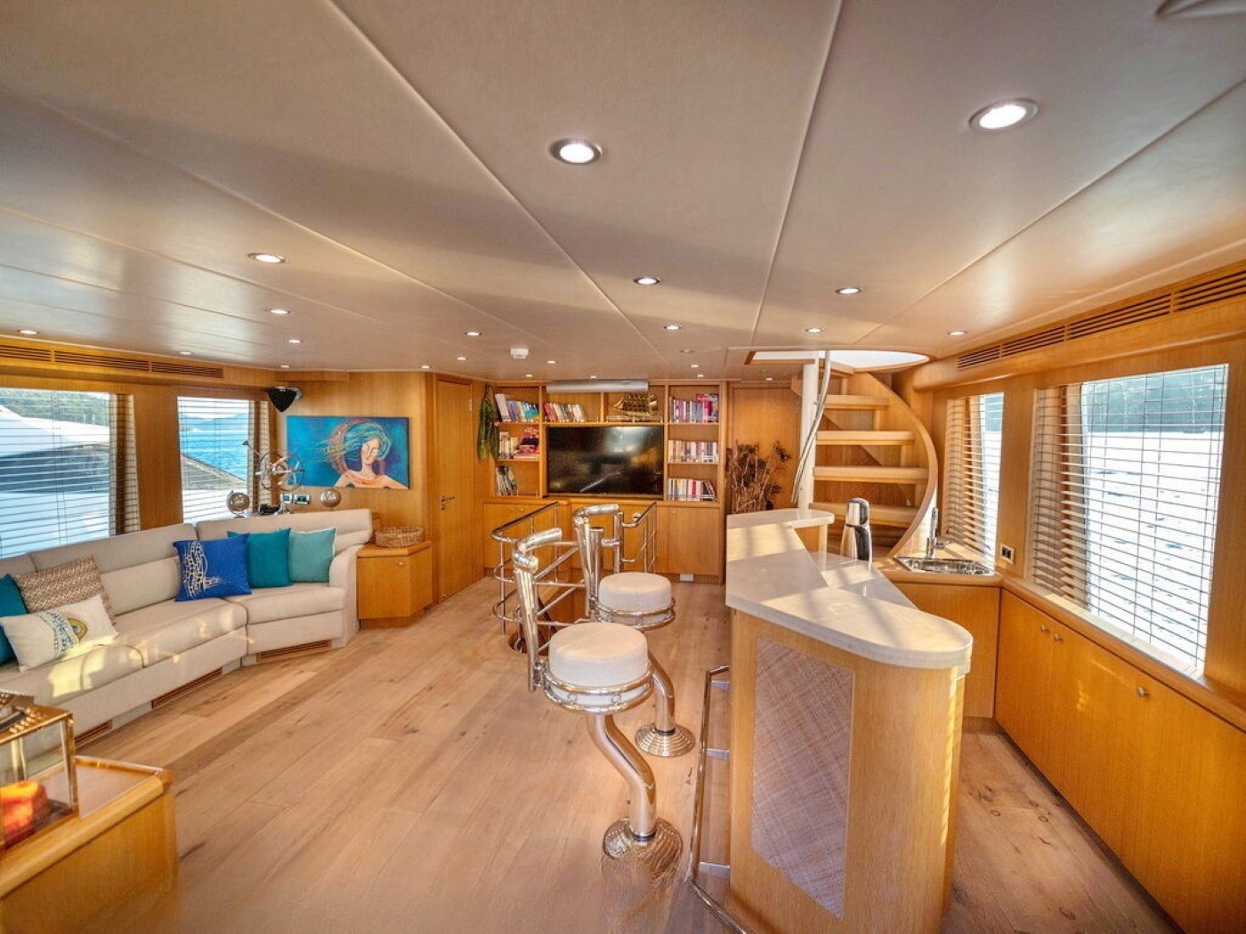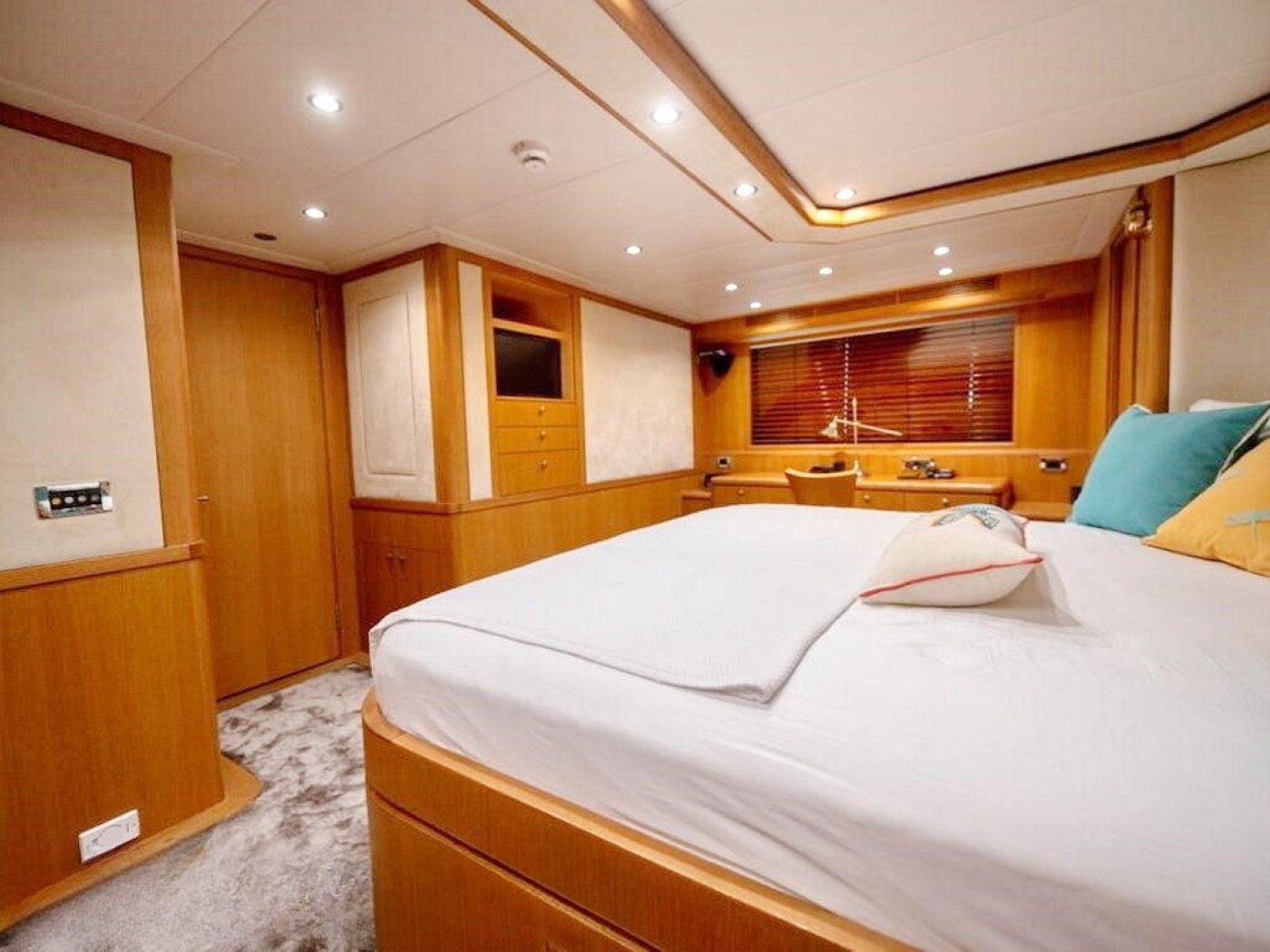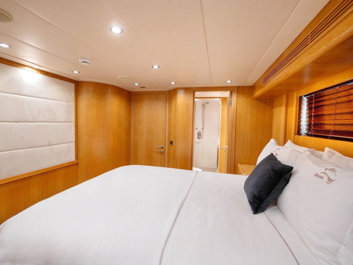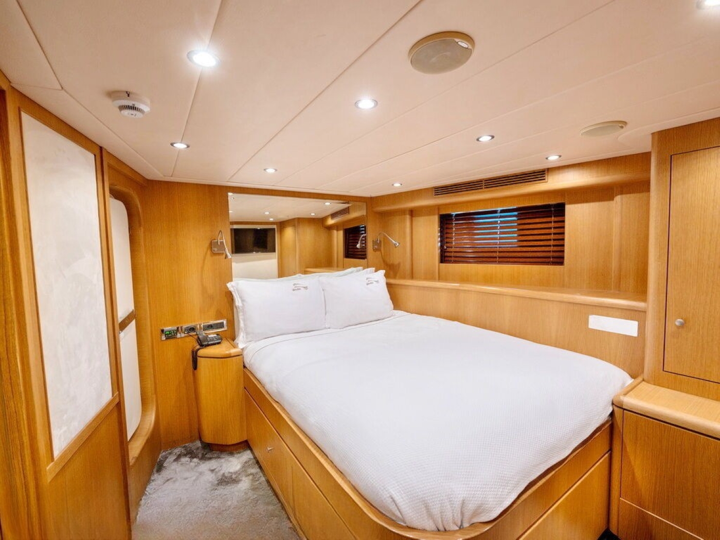 Luxury charter yacht BANDIDO can accommodate up to 8 guests, in 4 double, en-suite cabins. The master cabin is on the main deck forward of the salon and full beam of the yacht, with a center lined double bed, sofa, vanity and en-suite with his and hers sinks. On the lower deck are 2 mirror image guest cabins, each with a walk around double bed. A further guest cabin is on the starboard side and offers a French style double bed.