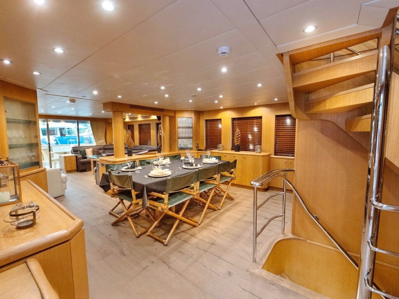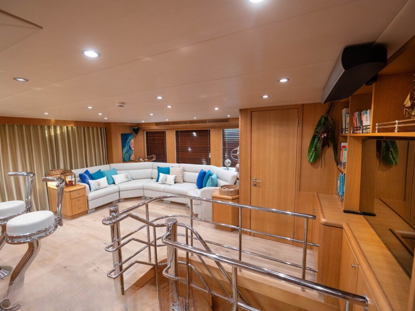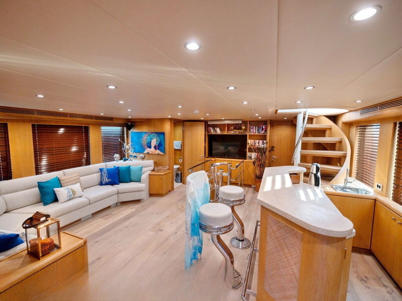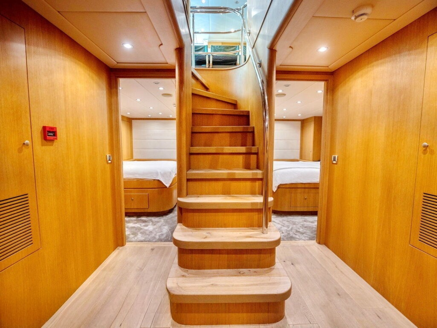 Luxury charter yacht BANDIDO can accommodate up to 8 guests, in 4 double, en-suite cabins. The master cabin is on the main deck forward of the salon and full beam of the yacht, with a center lined double bed, sofa, vanity and en-suite with his and hers sinks. On the lower deck are 2 mirror image guest cabins, each with a walk around double bed. A further guest cabin is on the starboard side and offers a French style double bed.