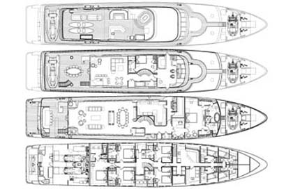 Luxury motor yacht BARCHETTA offers the following yacht amenities and toys: Tenders & Toys Water Trampoline, Submarine, Tubes, Skis, Windsurfer, 4 Jetskis, 4 Kayaks, and deep sea fishing with 35' fishing boat. High-tech nitrox diving, Resort course training for non-certified divers. Audio Visual Equipment and Deck Facilities Sat TV, 500 movie DVD selection in LG screens, XM music through system. Communications Full internet connection 24 hours/day. Fax, phones, vonage satellite phones.