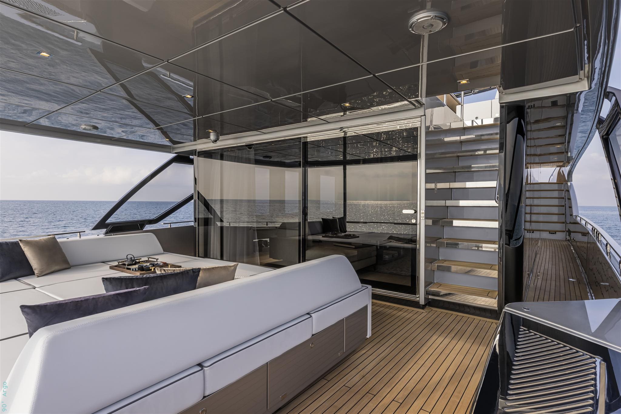 The flybridge design offers a choice of al fresco entertainment space on the sun deck and main deck forward and aft. The sun deck boasts a hard roof over the seating area and bar/teppanyaki grill creating a shaded terrace perfect for lunch. The corner sofa and chairs surround a flexible table and there are stools so guests can sit up at the bar. Forward are the helm controls and companion seating while the aft space offers an open sunbathing area with sun beds.