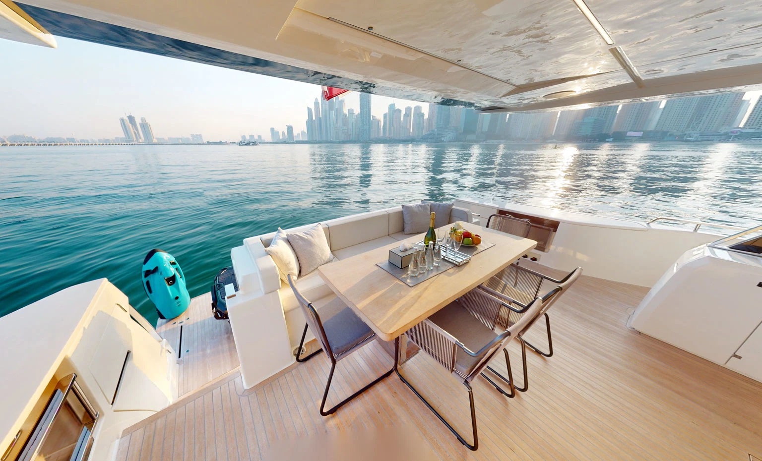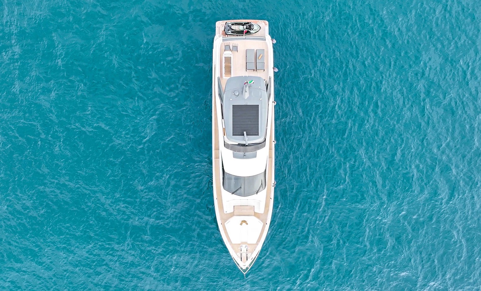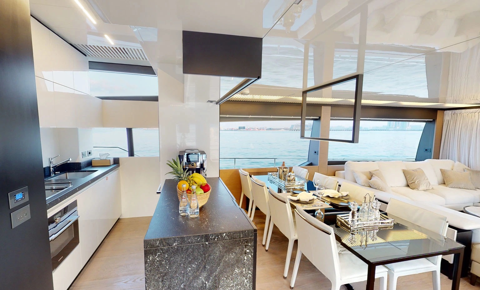Furnished with contemporary guest areas, the yacht offers a beautiful backdrop to enjoying the surroundings. The sun deck has an open aft space where moveable sun beds create a flexible sunbathing spot with great views. Under the hard roof there is a spacious dining setting with L-shaped sofa, adjustable table and moveable chairs. Additional seating and the helm controls are forward.