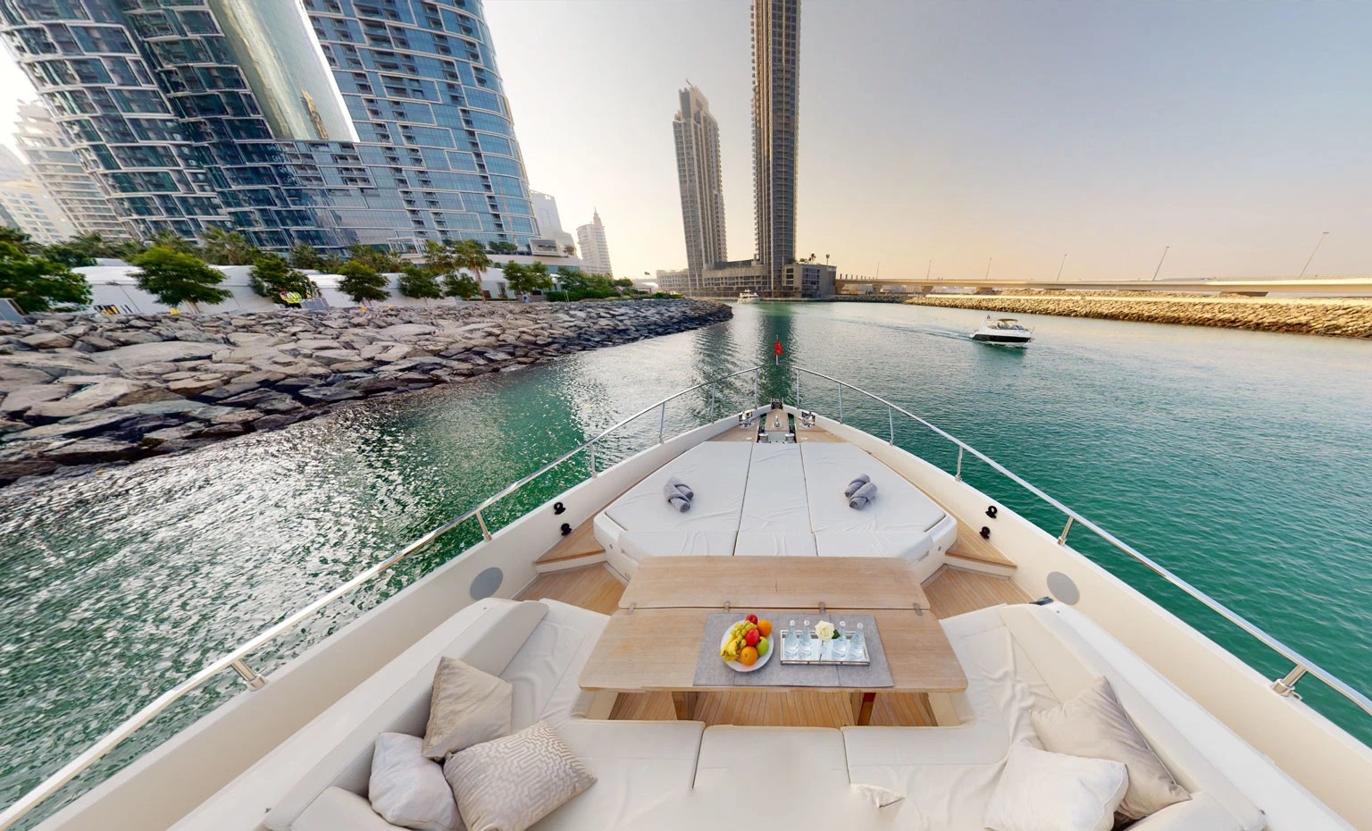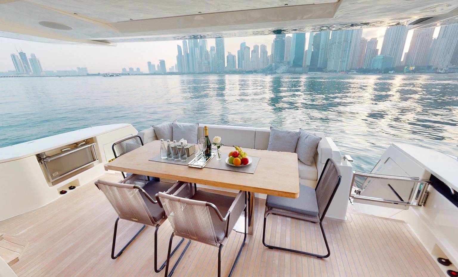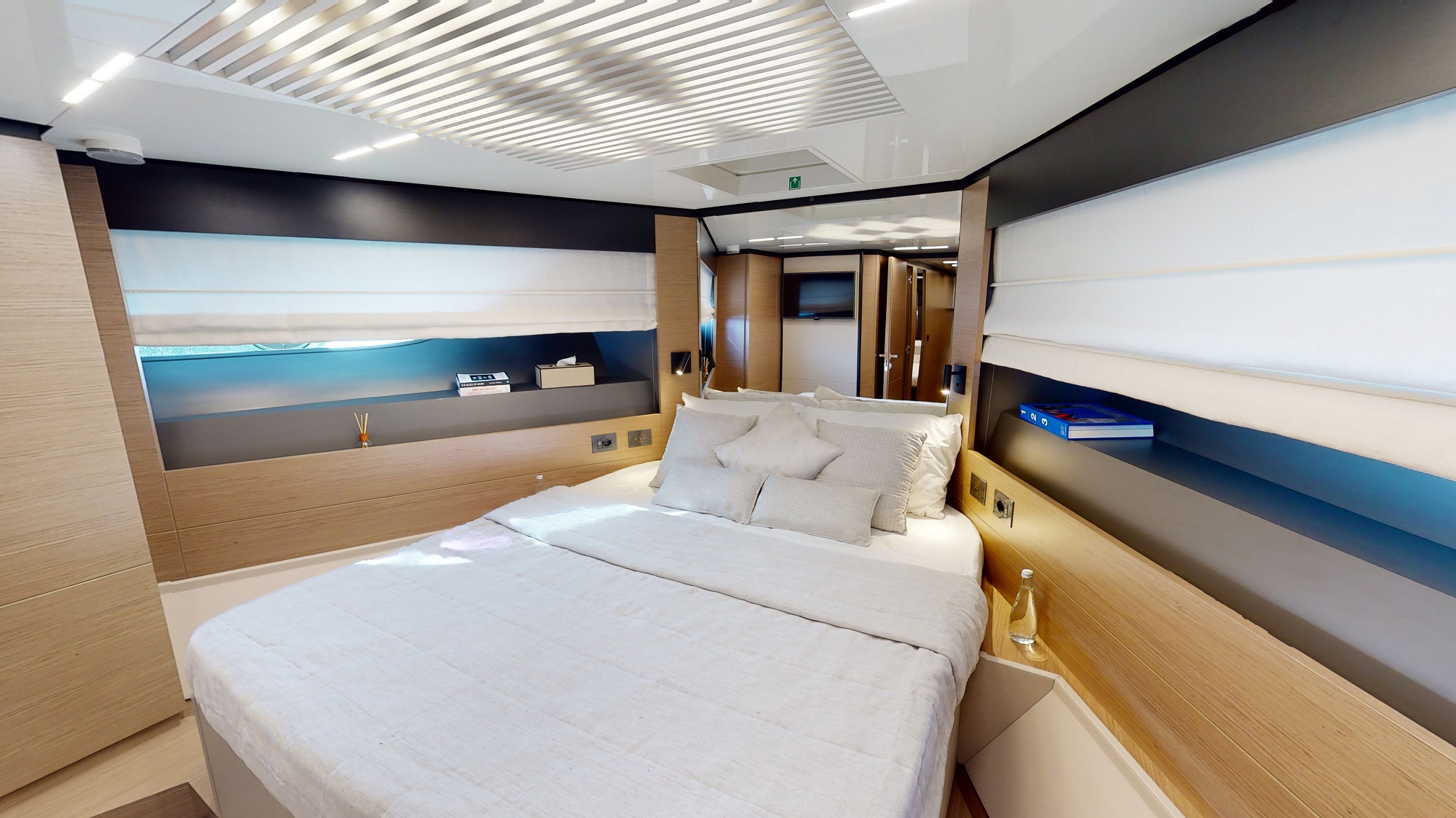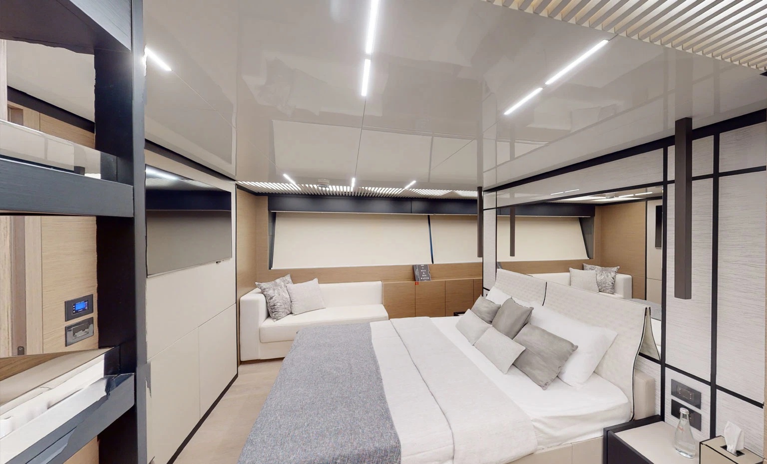 Furnished with contemporary guest areas, the yacht offers a beautiful backdrop to enjoying the surroundings. The sun deck has an open aft space where moveable sun beds create a flexible sunbathing spot with great views. Under the hard roof there is a spacious dining setting with L-shaped sofa, adjustable table and moveable chairs. Additional seating and the helm controls are forward.