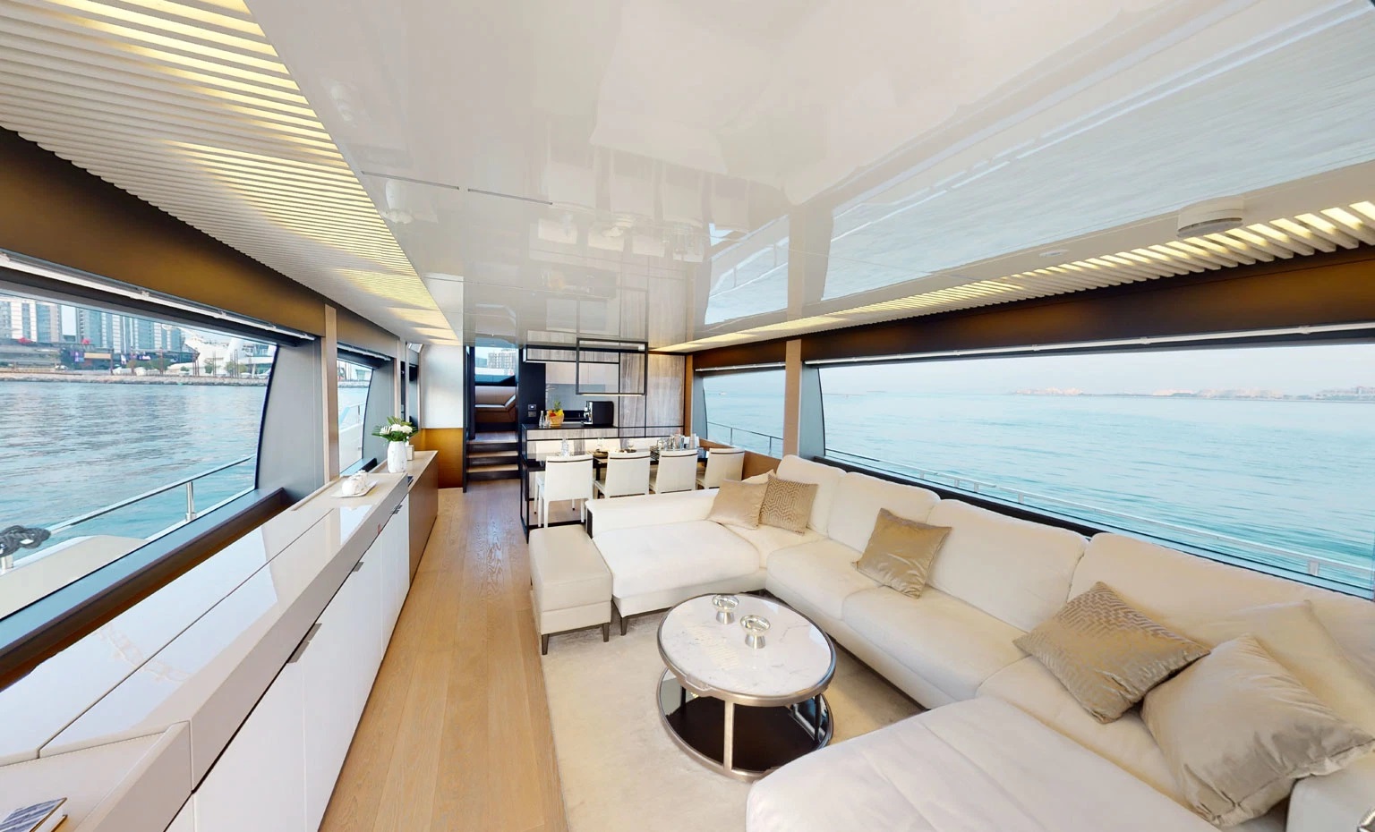The spacious main deck is configured with an open plan main salon featuring a lounge aft and dining setting forward. Further forward is the semi-separate galley and main wheelhouse. Panoramic windows connect the space with the surroundings and create a warm and welcoming atmosphere.