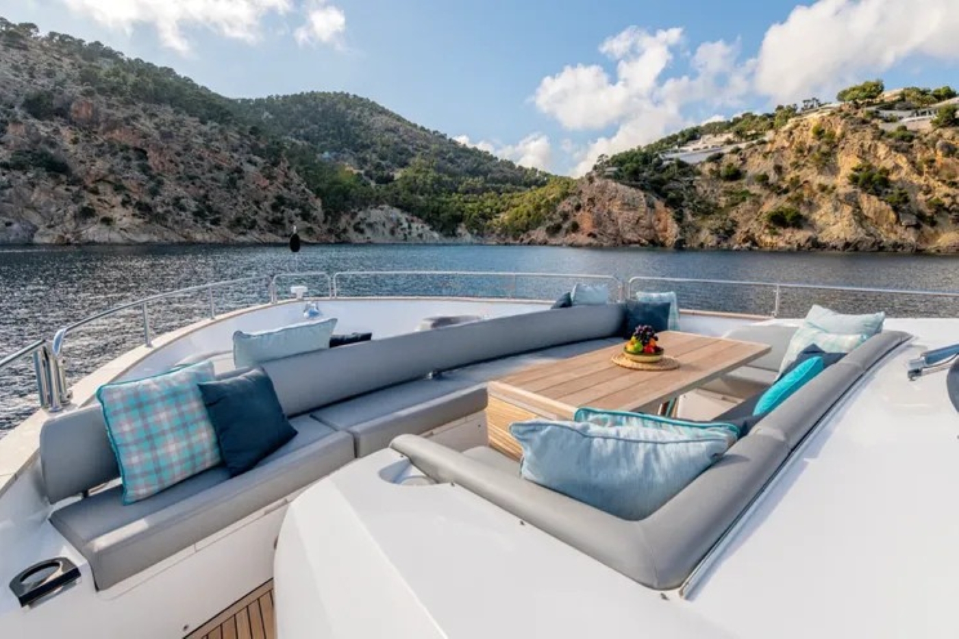 The generous and comfortable exterior offers guests a great choice of al fresco entertainment space for guests to make the most of the surroundings. On the foredeck there is an ample lounge including a u-shaped sofa surrounding a table and two large sunpads tucked into the bulwarks.