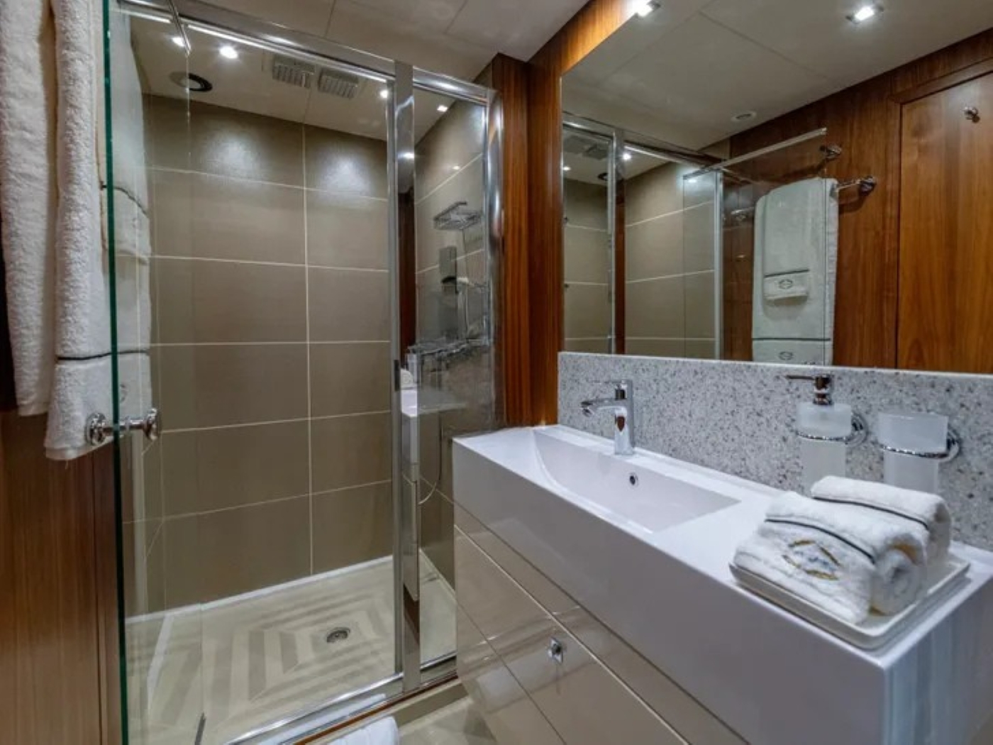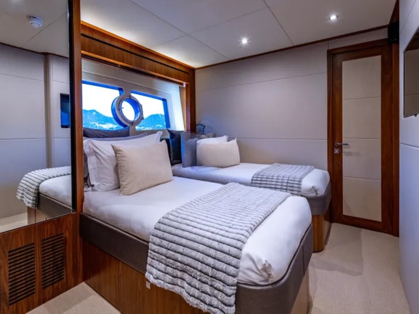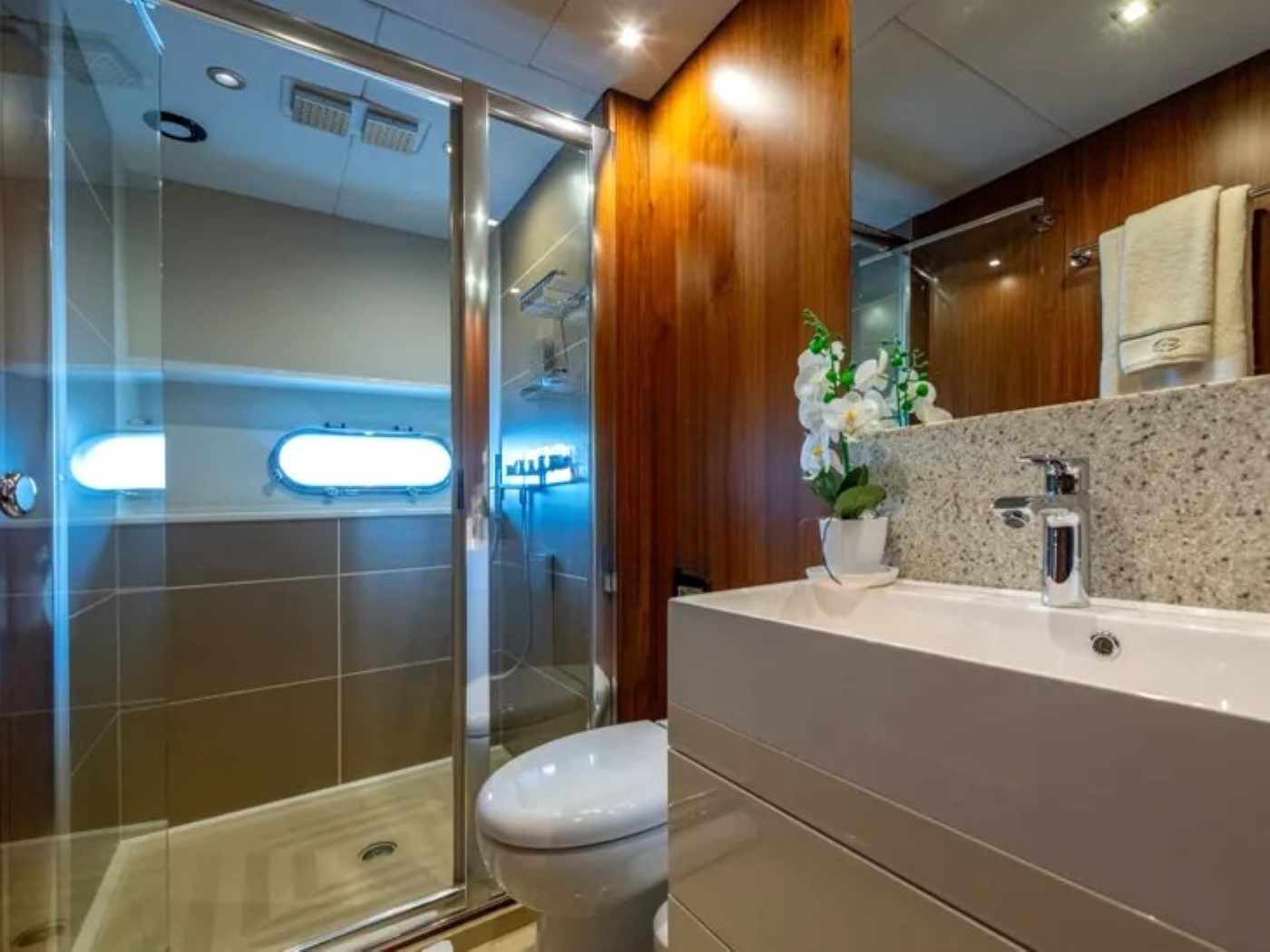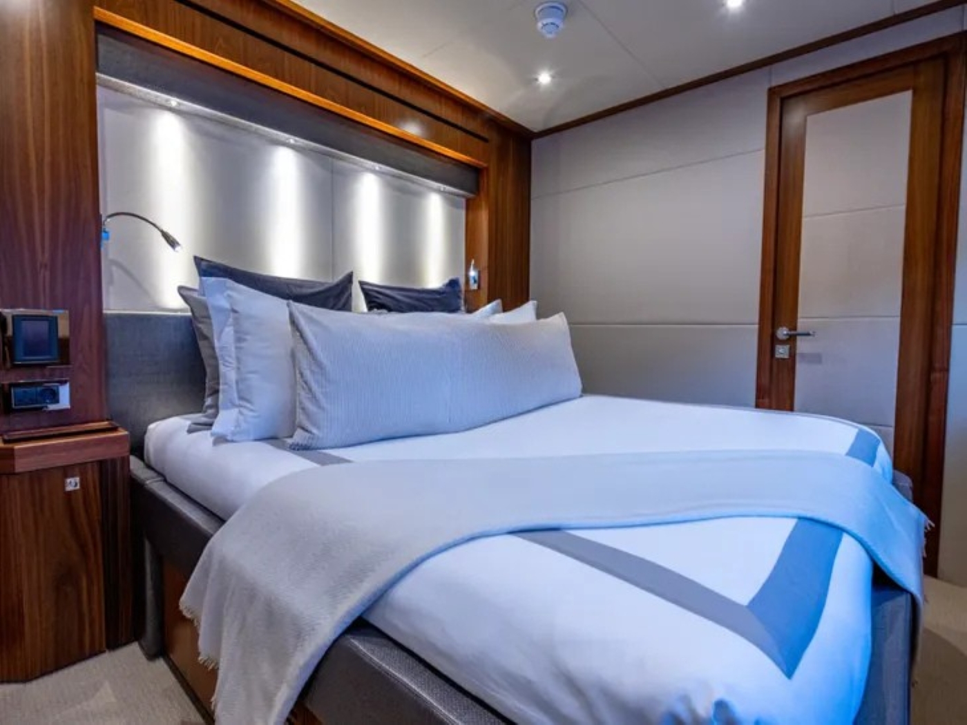 The full beam master suite is amidships on the lower deck and features a seating area, vanity/desk, walk in wardrobe and ensuite bathroom. The VIP is forward with a private entrance from the main deck and is ensuite while the two additional suites – a double and convertible – are further back from the master and also feature ensuite facilities.