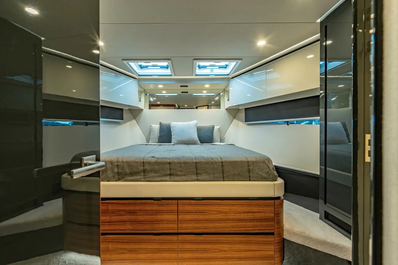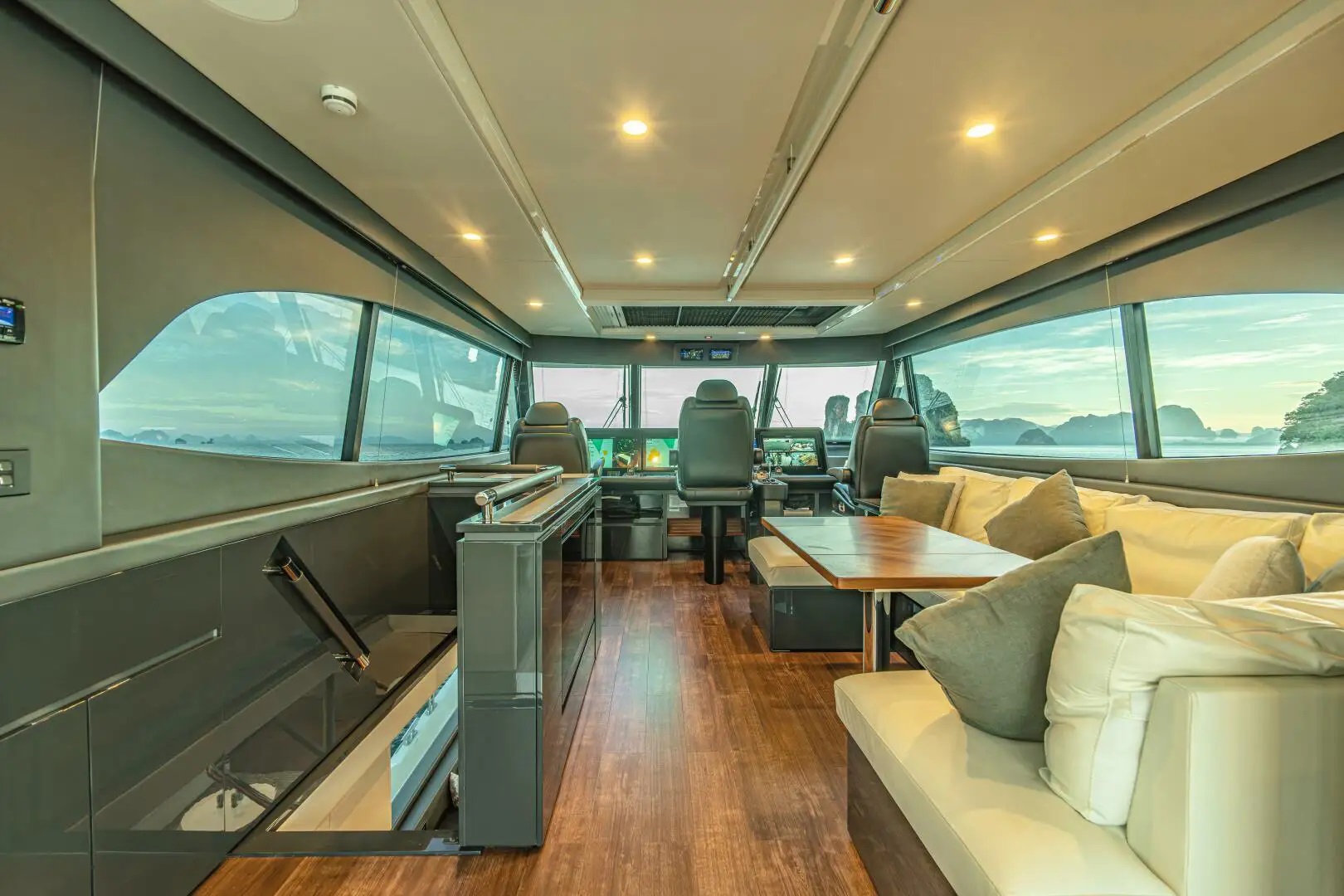 Her full-beam master suite features a king-sized bed, black-out blinds, wireless charging stations and a hidden refrigerated drawer bedside. Large hull windows to both port and starboard bring the outside in — as well as a good cross breeze when needed. A cedar-lined walk-in closet provides ample storage and an en-suite is complete with his-and-hers sinks and a rain shower. Each of her guest cabins also enjoys en-suites and cedar-lined storage, with a VIP forward featuring a double berth and a portside guest cabin with two side-by-side single berths. A fourth cabin to starboard has been converted to a private office, with a Pullman berth hidden in the aft bulkhead.