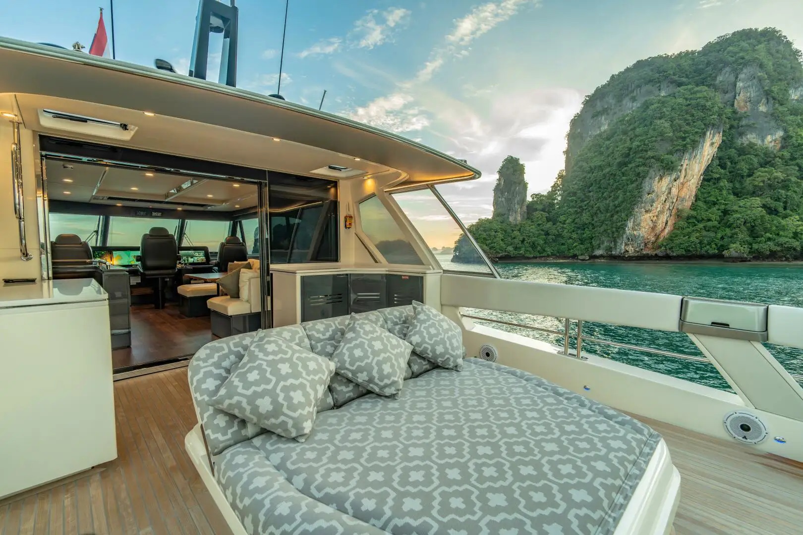 Her extended aft flybridge differs from other models in the series with a custom sunbathing deck boasting a large sunpad with a wetbar. The entire space is semi-shaded with a Bimini and hardtop, allowing for the ultimate views with cruising.