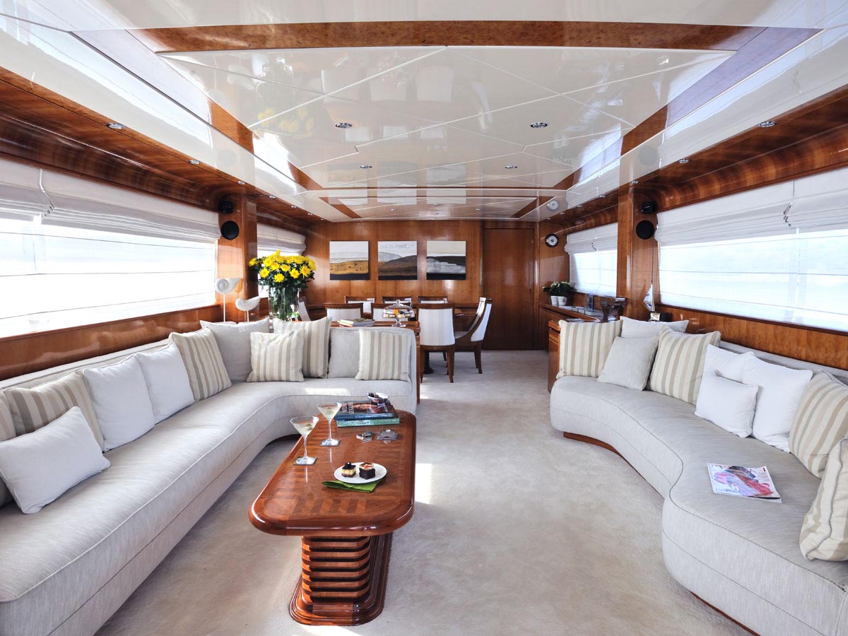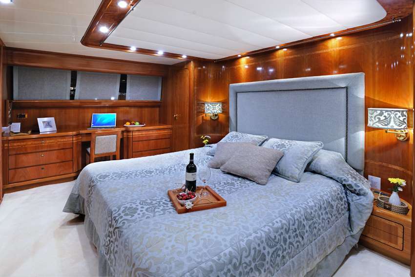 The accommodation sleeps a maximum of 10 guests over 4 en-suite cabins: 1 Master suite, 1 VIP stateroom and 2 twin cabins with 1 Pullman berth. ~ The Master suite makes use of the full beam amidships on the lower deck, with the twin cabins forward to port and starboard and the VIP stateroom placed within the bow. Each Cabin is equipped with an LCD TV, Blue Ray+ DVD player, CD player, radio and individual Satellite TV receiver. ~ The crew of 5 will ensure that all guests receive the first-class service throughout the journey.