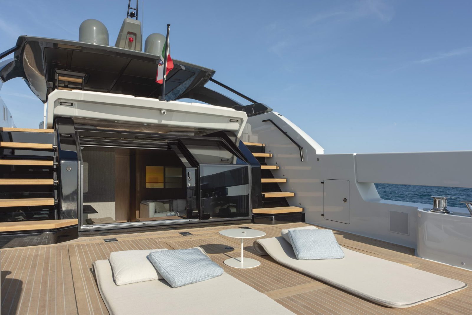 The beach club connects directly with the sea on the lower level making a playground to host the water toys and terrace for guests to relax at the water’s edge. The sheltered outdoor living area on the main deck offers flexible and convivial seating for relaxing, dining and sunbathing. Two corner sofas surround the dining table under the hard roof and a row of three adjoined sun pads with adjustable head rests in the open aft space.