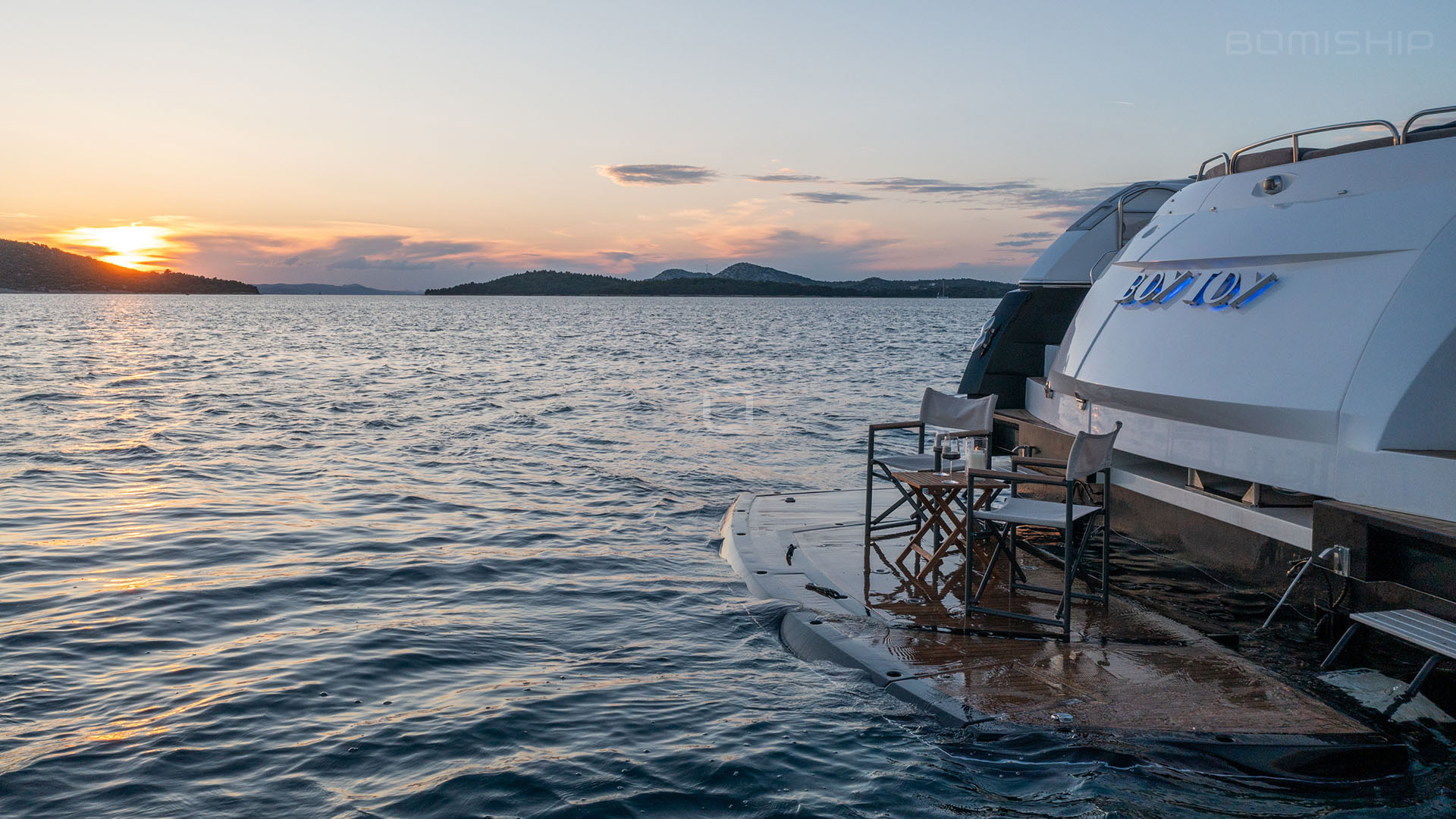 NOTABLE FEATURES OF BOY TOY: ~ Recent 2024 refit ~ Sliding hardtop for open-air cruising ~ Hydraulic garage for jet ski and toys ~ Hydraulic lift bathing platform ~ Multiple al fresco lounge and dining options ~ Air conditioning throughout ~ Professional, experienced crew ~ Wide selection of water toys including Sea bob and e-foil