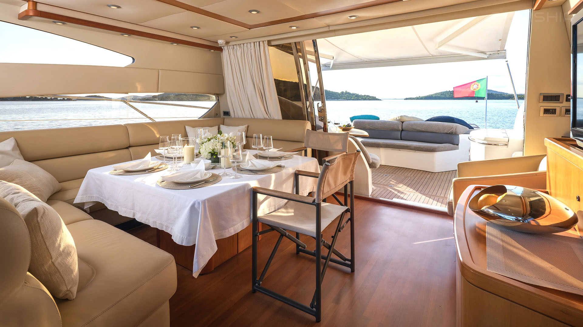 The saloon is bright and welcoming, with wraparound glazing that frames sweeping ocean views. Pale upholstery is offset by warm-toned wood panelling, while the open-plan layout integrates the dining area and lounge for easy socialising. The helm is positioned forward, with excellent sightlines, giving guests a sense of connection to the cruising experience.