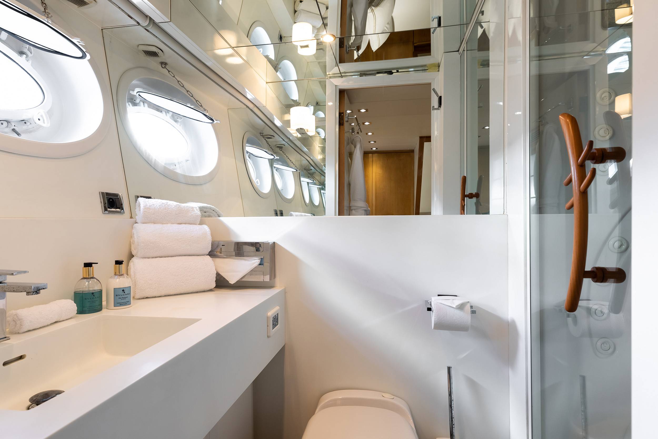 There are five suites which can accommodate up to ten guests in complete luxury and privacy. The master suite is forward on the main deck with a light and modern feel and a grand ensuite with marble and gold finishes, double shower and sauna. On the lower deck are two doubles and two twins, all with ensuite bathroom facilities. The suites are light and welcoming and create private havens for guests on board.