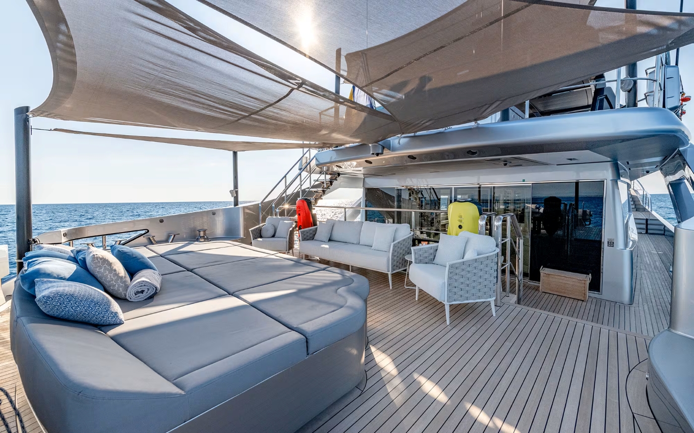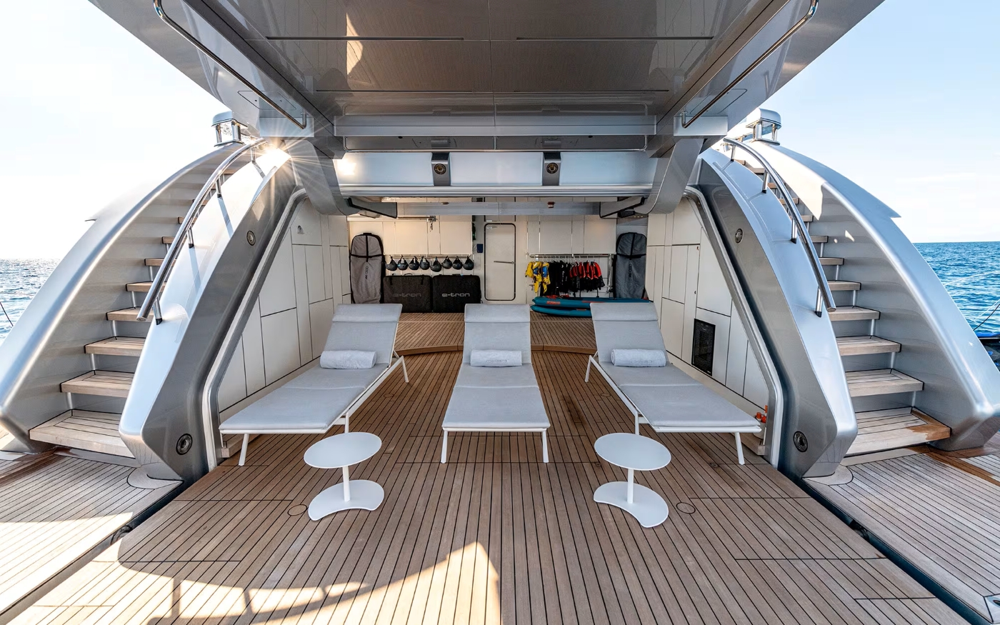 The stern of this contemporary yacht oozes glamour with sweeping steps on either side leading down to the beach club which opens on 3 sides to create water’s edge balconies and platforms. The main deck aft, at the top of the steps is a wonderful sociable space for guests featuring cushioned sun pads and a huge dining setting sheltered by the sun deck overhang. The sun deck offers far reaching views from the wide expanse of sun pads or from the sheltered lounge area under the hard roof.