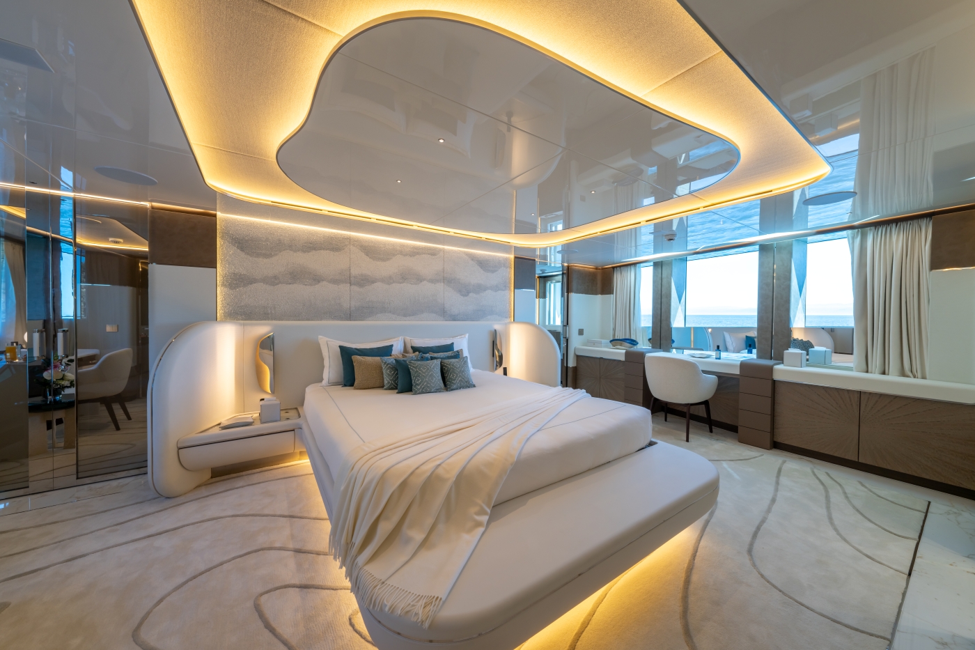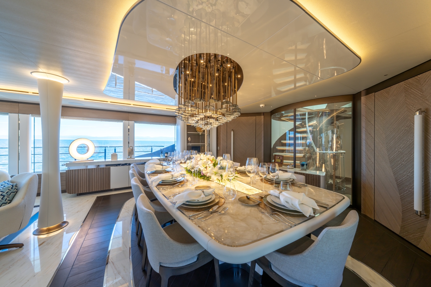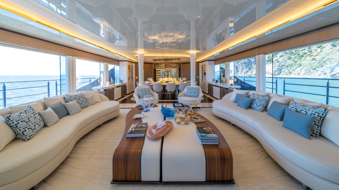 Inside, the renowned Hot Lab studio has curated interiors that exude modern sophistication. Her layout offers 20% more space compared to traditional 48-meter yachts, providing expansive areas for relaxation and entertainment.