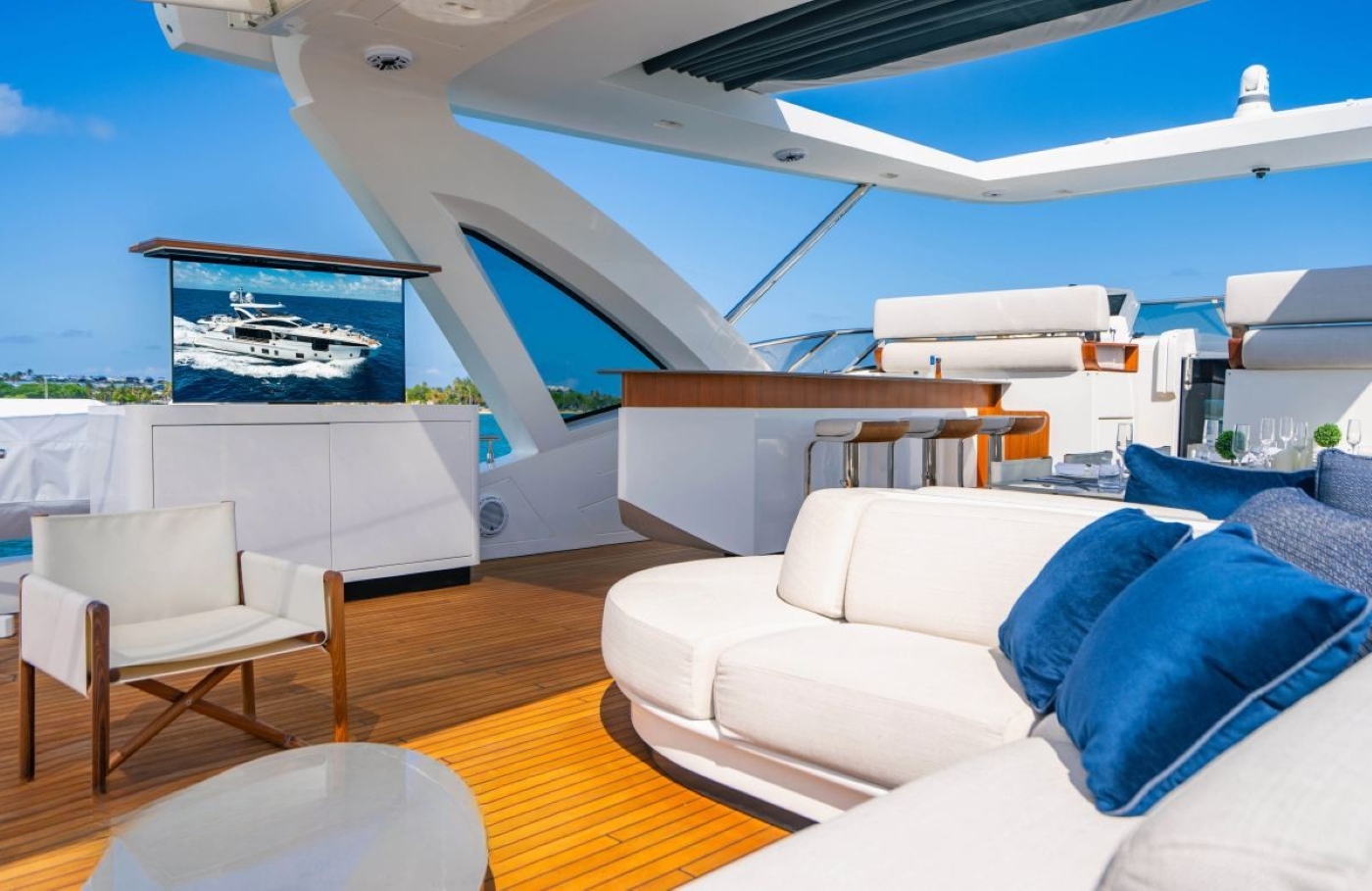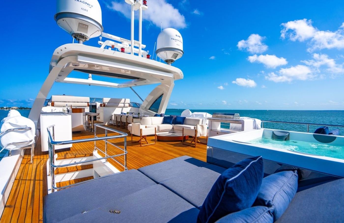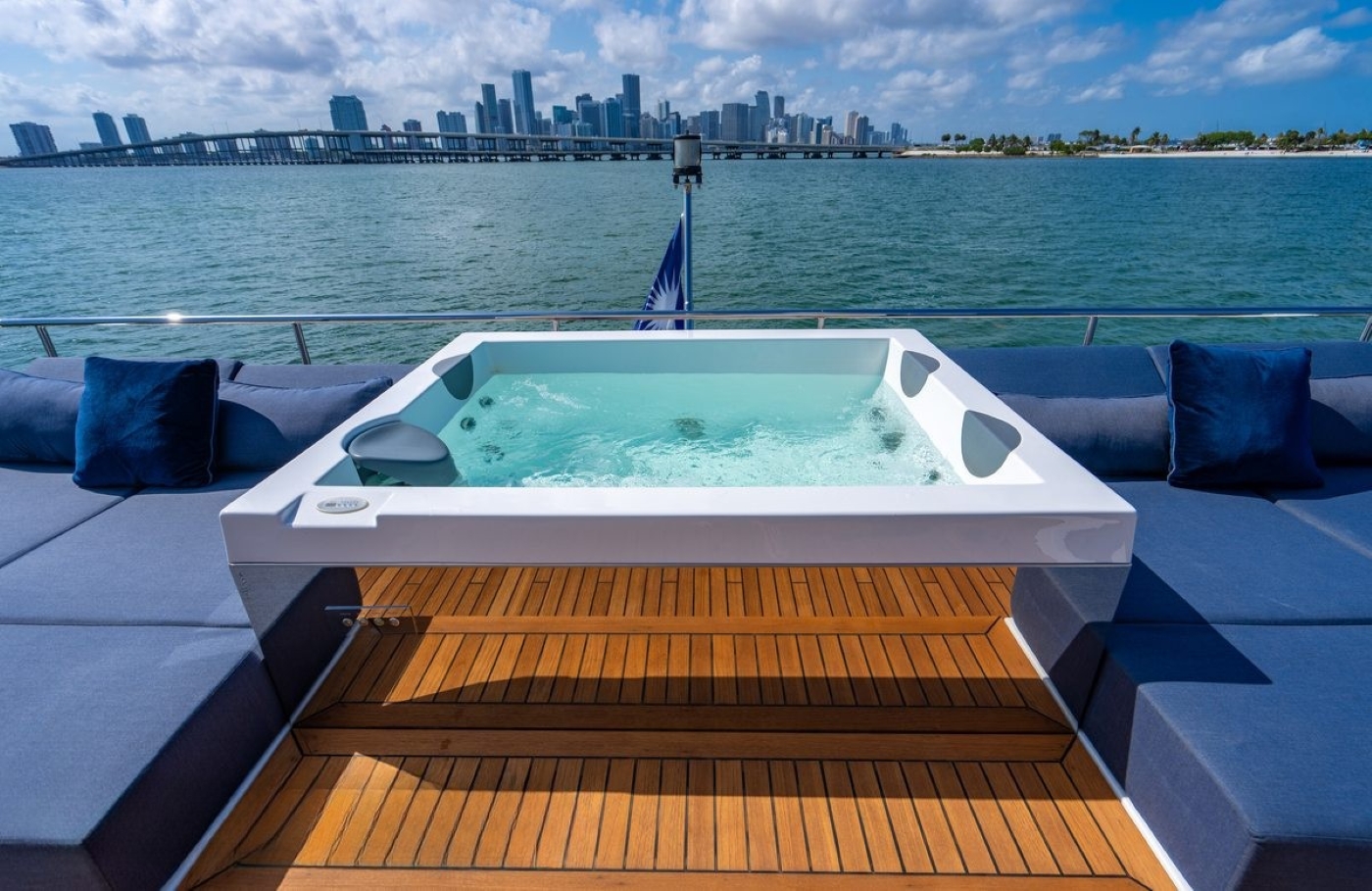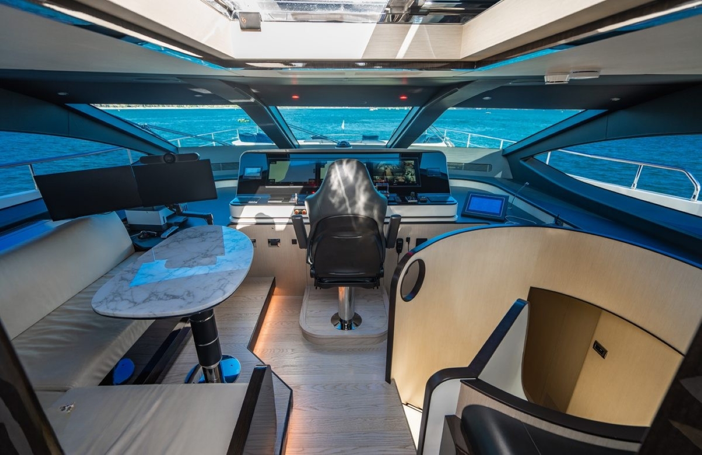 Her flybridge boasts a sunroof which can be opened for full sun exposure or the option to unwind in the shade. This space is sure to be the favourite guest hang out spot with a full bar, a dining table, forward-facing pilot seats and jacuzzi and loungers aft.